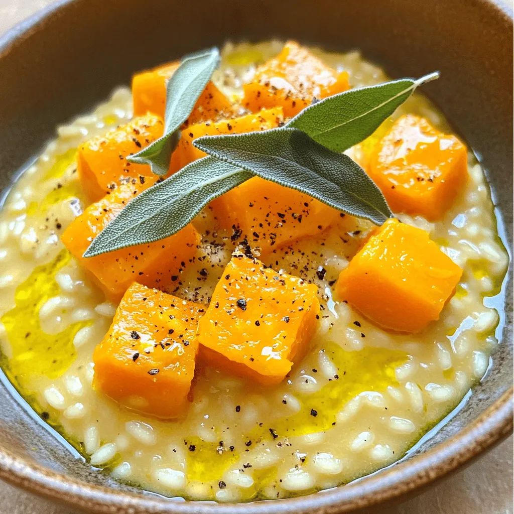 To make a flavorful butternut squash risotto, gather these key items: - 1 medium butternut squash, peeled and diced - 1 cup arborio rice - 4 cups vegetable broth - 1 small onion, finely chopped - 2 cloves garlic, minced - 3 tablespoons olive oil - 1 tablespoon fresh sage, chopped (or 1 teaspoon dried sage) - 1/2 cup grated Parmesan cheese (optional for serving) - Salt and pepper to taste - Freshly cracked black pepper for garnish If you need alternatives, here are a few ideas: - Use pumpkin or sweet potato instead of butternut squash. - Swap arborio rice for carnaroli rice for a creamier texture. - Vegetable broth can be replaced with chicken broth for non-vegetarians. - If fresh sage is unavailable, try thyme or rosemary for a different flavor. - Omit Parmesan cheese for a dairy-free version, or use nutritional yeast for a cheesy taste. To make your dish shine, consider these toppings: - Drizzle with extra virgin olive oil for richness. - Add toasted pumpkin seeds for crunch. - Top with fresh sage leaves for color and flavor. - Sprinkle with additional black pepper or chili flakes for heat. The full recipe includes everything you need to create this creamy delight, perfect for any occasion. Start by heating the vegetable broth in a medium saucepan. Bring it to a gentle simmer over low heat. Keeping the broth warm helps the rice cook evenly. You will add this broth little by little later. In a large skillet, pour in the olive oil and warm it over medium heat. Add the finely chopped onion and cook for about 3-4 minutes. You want the onion to become soft and clear. Next, toss in the minced garlic and diced butternut squash. Stir and let them cook for 5-7 minutes. The squash should start to soften, making it ready for the next step. Now, it’s time to add the arborio rice to the skillet. Stir the rice well to coat it in the oil. Toast the rice for about 2 minutes. This adds a nice flavor. Gradually, ladle in about 1 cup of the warm vegetable broth. Stir often and let the rice soak up the broth before adding more. Keep repeating this for about 20-25 minutes. The goal is creamy rice that is tender but still has a little bite. Once the rice is ready, mix in the chopped sage and season with salt and pepper. Cook for another 2-3 minutes. If you like, stir in some grated Parmesan cheese for extra creaminess. Let the risotto rest for a minute before serving. For the final touch, serve it in shallow bowls, drizzle with olive oil, and sprinkle with black pepper. For the complete recipe and detailed instructions, check out the Full Recipe. To get that rich and creamy texture, use arborio rice. This rice has high starch, which helps the risotto become soft and smooth. Stir often as you cook. This movement releases starch, giving your dish a creamy feel. Always add warm broth gradually. If you dump it all in at once, the rice won't cook evenly. Timing is key in making risotto. Start by cooking the onions and garlic until soft. This step adds flavor. After you add the butternut squash, let it cook for a bit. You want it to soften before adding the rice. When you add the rice, toast it slightly. This step helps enhance the flavor. Keep stirring and adding broth until the rice is just cooked. Using the right tools makes cooking easier. You need a large skillet to sauté the vegetables and rice. A wooden spoon works best for stirring. This spoon helps scrape the bottom and mix well. A ladle is great for adding broth slowly. Plus, have a medium saucepan for warming the broth. These tools make your cooking process smooth and fun. For the full recipe, check out the details above. Enjoy your cooking! {{image_2}} You can easily add protein to your butternut squash risotto. Chicken or shrimp works well. For chicken, cook diced pieces in the skillet before adding onion. For shrimp, add them with the broth. They will cook fast and add a nice flavor. If you want to mix it up, try different grains. Quinoa or farro can replace arborio rice. These grains give unique textures. For sauces, consider a light cream or a splash of white wine. This adds depth to the dish. You can change the vegetables based on the season. For spring, use asparagus or peas. In summer, add zucchini or bell peppers. In fall, try mushrooms or kale. Each veggie brings new flavors and colors to your risotto. Check the full recipe for detailed cooking steps. Store leftover risotto in an airtight container. Let it cool first, then seal it. Keep it in the fridge for up to three days. This helps maintain flavor and texture. To reheat risotto, use a skillet or saucepan. Add a splash of broth or water. Heat on medium-low, stirring often. This keeps it creamy. Avoid microwaving, as it can make it dry. You can freeze risotto, but it may change texture. Place it in a freezer-safe container. Leave some space for expansion. It lasts up to three months. To thaw, transfer it to the fridge overnight. Reheat as mentioned above for best results. For the complete cooking process, refer to the Full Recipe. Yes, you can make butternut squash risotto ahead of time. I find it best to cook it and then store it in the fridge. Keep it in an airtight container. When you are ready to serve, reheat the risotto gently. Add a splash of broth or water to help restore the creamy texture. This method works well and saves you time. You can serve butternut squash risotto with many tasty options. Some great choices include: - Grilled chicken or turkey - Roasted vegetables - A fresh green salad - Garlic bread - Sauteed greens, like spinach or kale These sides add balance and make the meal more filling. I love pairing the risotto with a crisp salad for a refreshing contrast. To make risotto vegan, you can follow these simple steps: - Use vegetable broth instead of chicken broth. - Omit the Parmesan cheese or replace it with a vegan cheese alternative. - Add extra nutritional yeast for a cheesy flavor without dairy. - Consider adding plant-based protein like chickpeas or lentils for 
