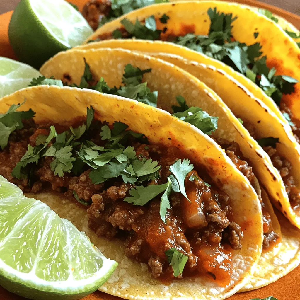 - 1 lb ground beef - 1 small onion, finely chopped - 2 cloves garlic, minced - 1 tablespoon olive oil - 1 teaspoon ground cumin - 1 teaspoon smoked paprika - 1 teaspoon chipotle powder (adjust for heat preference) - 1/2 teaspoon salt - 1/2 teaspoon black pepper - 1 can (8 oz) tomato sauce - 1 tablespoon adobo sauce (from chipotle peppers in adobo) - 8 small corn tortillas - Fresh cilantro, chopped (for garnish) - Lime wedges (for serving) To make these beef tacos, you only need a few tools: - Large skillet - Spatula - Cutting board - Knife - Measuring spoons - Can opener (for the tomato sauce) These tools help you prepare the dish easily and efficiently. Beef tacos are a balanced meal. Each taco has protein, healthy fats, and vitamins. Here’s a quick breakdown: - Calories: About 200-250 per taco - Protein: 15-20 grams - Fat: 10-15 grams - Carbohydrates: 20-30 grams - Fiber: 1-2 grams These nutrition facts can vary based on serving size and toppings. Enjoy your tacos while keeping health in mind. For the complete recipe, click [Full Recipe]. To start, heat 1 tablespoon of olive oil in a large skillet over medium heat. Once hot, add 1 finely chopped onion. Sauté it for about 5 minutes until it turns soft and clear. Next, add 2 minced garlic cloves and cook for another minute. You want that garlic smell to fill your kitchen! Now, add 1 pound of ground beef to the skillet. Use a spatula to break the beef into smaller pieces. Cook it until the beef is brown and fully cooked, which will take about 6 to 8 minutes. If there's extra fat, drain it out. Next, sprinkle in 1 teaspoon of ground cumin, 1 teaspoon of smoked paprika, 1 teaspoon of chipotle powder, ½ teaspoon of salt, and ½ teaspoon of black pepper. Stir everything well and let it cook for 2 to 3 minutes. This helps the spices mix nicely with the beef. Finally, pour in one 8-ounce can of tomato sauce and 1 tablespoon of adobo sauce from the chipotle peppers. Stir it all together, then let it simmer for about 5 minutes. This allows the flavors to blend and thicken a bit. While your beef mixture simmers, it’s time to warm the tortillas. Take 8 small corn tortillas and place them in a dry skillet over medium heat. Warm each side for about 30 seconds. You want them soft and easy to fold without tearing. Now comes the fun part! Grab a tortilla and spoon some of the chipotle beef mixture onto it. You can add as much as you like! Next, sprinkle some chopped fresh cilantro on top for that fresh kick. Serve your tacos with lime wedges on the side. Squeeze some lime juice over the tacos before you take a bite. This adds a bright flavor that really makes them pop. For the complete recipe, check out the Full Recipe. Enjoy your flavorful and simple beef tacos! To control the heat in your chipotle sauce, start with less chipotle powder. Use just half a teaspoon for a milder taste. You can always add more later if you want it spicier. If you want a smoky flavor without too much heat, try smoked paprika. This gives flavor without the burn. When you sauté meat, use a wide skillet. Heat the oil on medium heat before adding the onions. Cook the onions until they are soft and clear, about five minutes. Next, add the garlic for more flavor. When you add the ground beef, break it up into small pieces. This helps it cook evenly. Cook until the beef is brown, about six to eight minutes. Drain any extra fat to keep it lean. Fresh ingredients make a big difference. Use fresh garlic instead of powder for a punchier taste. Add lime juice just before serving for brightness. You can also top your tacos with fresh cilantro for a burst of flavor. Other great toppings include diced tomatoes, avocado, or crumbled cheese. Using fresh herbs and veggies makes your tacos vibrant and tasty. For the full recipe, check out the detailed steps. {{image_2}} You can swap ground beef for other proteins. Ground turkey and chicken work great. They absorb flavors well, just like beef. For a richer taste, try shredded pork or beef brisket. Each option changes the taco's feel and taste. You can even use fish or shrimp for a light twist. Just remember to adjust cooking times for each protein. If you want a meat-free meal, use beans, lentils, or mushrooms. Black beans or pinto beans add protein and fiber. Lentils cook fast and are very tasty. Sautéed mushrooms give a hearty bite. You can replace the beef with a mix of these options and still enjoy the chipotle sauce. This sauce adds a kick that pairs well with veggies. Tacos are fun because you can customize them. Try adding fresh avocado, diced tomatoes, or shredded cabbage. Each topping gives a new flavor and texture. Also, think about sides like rice, beans, or a fresh salad. Lime wedges brighten the dish. You can also add your favorite salsa for extra zest. Check out the Full Recipe for more ideas. After enjoying your tasty beef tacos, store the leftovers right away. Place any unused tacos in an airtight container. If you have leftover filling, keep it separate. This helps keep the tortillas from getting soggy. Store everything in the fridge. The beef filling lasts for up to three days. Make sure to label the container with the date. This way, you won’t forget when you made them. When you are ready to enjoy your leftovers, reheating is easy. For the beef filling, use a skillet on medium heat. Stir it often until it’s warm. This usually takes about five minutes. For tacos with tortillas, you can warm them in the oven. Set your oven to 350°F (175°C). Place the tacos on a baking sheet and heat for about 10 minutes. This method keeps them crisp and tasty. If you want to save the beef filling for later, freezing works well. Let the filling cool completely first. Then, scoop it into a freezer-safe bag. Squeeze out all the air before sealing. Write the date on the bag, so you remember when you froze it. The filling can stay fresh for up to three months. To use it, thaw in the fridge overnight and reheat as mentioned above. Enjoy