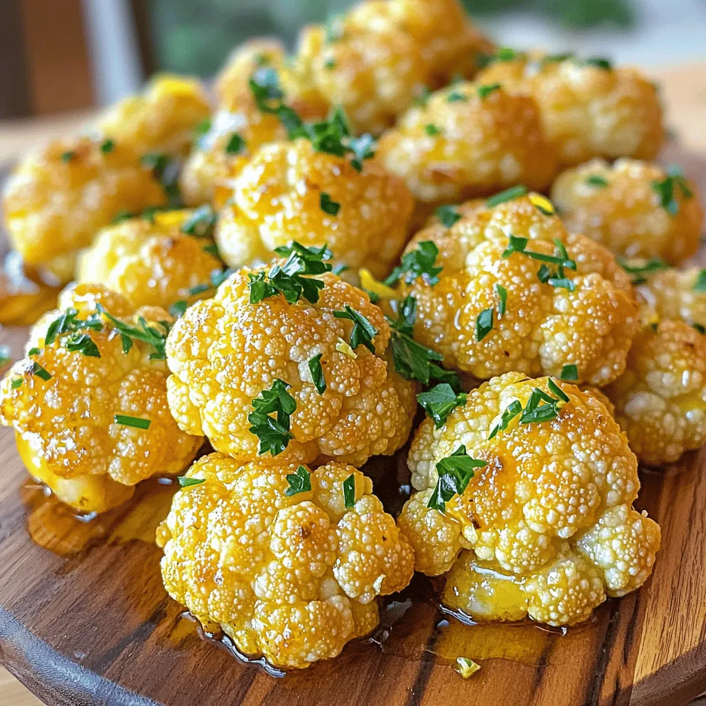 Add the cauliflower florets to the marinade. Toss them gently until they are well covered. Spread the marinated cauliflower on the prepared baking sheet in a single layer. Roast in the oven for 25-30 minutes. Stir halfway through to help with even cooking. When it’s done, the cauliflower should be tender and golden brown. Remove it from the oven and let it cool slightly. Transfer to a serving platter and garnish with chopped parsley for a fresh touch.Enjoy your tasty garlic lemon roasted cauliflower!