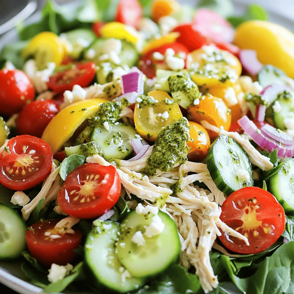 To start, gather all your ingredients. You need cooked chicken, cherry tomatoes, cucumber, red bell pepper, red onion, basil pesto, olive oil, lemon juice, salt, and pepper. You can also add mixed greens and feta cheese if you like.