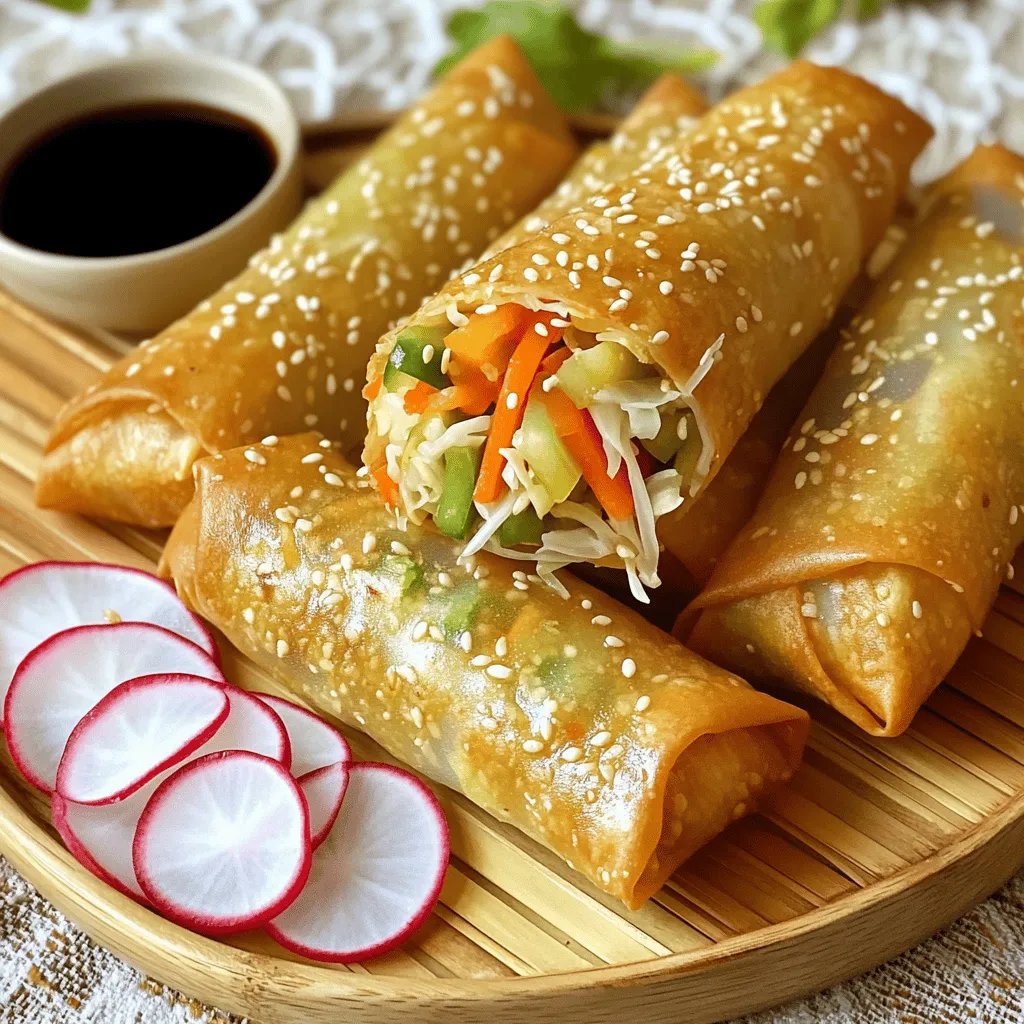 ![- 1 cup cabbage, finely shredded - 1 cup carrots, julienned - 1/2 cup bell peppers, thinly sliced - 1/4 cup green onions, chopped - 2 cloves garlic, minced - 1 teaspoon ginger, grated - 1 tablespoon soy sauce (or tamari for gluten-free) - 1 teaspoon sesame oil - 12 spring roll wrappers - Cooking spray The main ingredients give the rolls their crunch and taste. Shredded cabbage adds a crisp bite. Julienned carrots bring sweetness and color. Thinly sliced bell peppers add more flavor and a pop of color. Chopped green onions give a nice finish. To enhance the taste, garlic and ginger are key. They add warmth and depth. Soy sauce adds saltiness, while sesame oil brings a nutty flavor. These flavors work together to make each bite exciting. Finally, the spring roll wrappers hold everything together. They become crispy in the air fryer. Cooking spray helps them cook evenly and adds to the crispiness. For the full recipe, follow the steps carefully to enjoy these tasty treats! To make the filling, start by sautéing garlic and ginger. Heat sesame oil in a large skillet over medium heat. Add minced garlic and grated ginger. Sauté them for about 30 seconds until they smell great. This step adds depth to your spring rolls. Next, stir-fry the vegetables. Add the finely shredded cabbage, julienned carrots, and thinly sliced bell peppers to the skillet. Cook them for about 5 to 7 minutes. You want them tender but still crisp. Season the veggies with soy sauce, salt, and pepper. Finally, stir in the chopped green onions, then remove the skillet from heat and let the mixture cool for a few minutes. Now, it's time to assemble your spring rolls. Start by laying a spring roll wrapper on a clean surface. Place about 2 tablespoons of the veggie mixture near one edge of the wrapper. Fold the bottom edge over the filling. Then, fold the sides in and roll tightly to secure the filling. Make sure to repeat this with the remaining wrappers and filling. A tight roll helps keep the filling inside during cooking. Cooking in the air fryer is easy and quick. First, spray the air fryer basket with cooking spray to stop sticking. Place the spring rolls in a single layer in the basket. Lightly spray the tops with a bit more cooking spray for extra crispiness. Set the air fryer to 375°F (190°C) and cook for 10 to 12 minutes. Flip the spring rolls halfway through cooking. This ensures they cook evenly and get golden brown. Once they are done, carefully remove the spring rolls and let them cool for a minute before enjoying. If you want to try the full recipe, check out the [Full Recipe]. To make spring rolls crispy, you need enough oil. Lightly spray the tops with cooking spray. The air fryer creates a nice crunch. Flip them halfway through for even browning. Balancing flavors is key. Use fresh veggies for a bright taste. Add a touch of soy sauce for umami. Don’t forget the salt and pepper! These small things make a big difference. Cook in batches if you have many spring rolls. This keeps them from steaming. Stacking them can lead to soggy rolls. Make sure they have space to breathe. If you double the recipe, adjust cooking time. Larger batches may need extra minutes. Check them often to avoid burning. You want them golden brown, not dark brown. For plating, use a bamboo platter. It adds a nice touch to your meal. Arrange the spring rolls in a circle for a lovely display. Garnishing can elevate your dish. Sprinkle sesame seeds for crunch. Add sliced radishes for color and freshness. Serve with a small bowl of soy sauce or sweet chili sauce for dipping. These details impress your guests! {{image_2}} You can easily change the flavors in your veggie spring rolls. Adding proteins can make them heartier. Tofu, chicken, or shrimp all work great. For a simple option, use cubed tofu. It absorbs flavors well. You can also mix up your veggies. Instead of just cabbage, try using spinach or mushrooms. Broccoli or zucchini can add great texture too. The goal is to use what you love or have on hand. Each mix gives a new taste and look. If you need gluten-free options, swap in gluten-free spring roll wrappers. You can find these at most grocery stores. Also, choose tamari instead of soy sauce. This small change makes a big difference. For vegan choices, skip the chicken or shrimp. Stick with your favorite veggies. You can add more flavor with spices or herbs. Fresh basil or cilantro can brighten up the rolls. Dipping sauces can elevate your spring rolls. Soy sauce is a classic choice. Sweet chili sauce adds a nice kick. Peanut sauce is creamy and rich. You can make your own or buy them ready-made. Homemade sauces let you control the flavors. Mix soy sauce with a bit of lime and garlic for a fresh taste. Store-bought sauces are quick and easy. Just make sure to check the labels for quality. For the full recipe, check the section above! To keep your spring rolls fresh, place them in the fridge right away. Use an airtight container or wrap them tightly in plastic wrap. This keeps moisture out and helps them stay crisp. Make sure they cool down before storing. If you have extra sauce, store it separately. When it's time to enjoy leftovers, the air fryer is your best friend. Set the air fryer to 350°F (175°C) and heat for 5-7 minutes. This keeps them crispy. You can also use an oven. Preheat to 375°F (190°C) and bake for 10-12 minutes. Flip halfway for even crispiness. You can freeze spring rolls before or after cooking. For pre-freezing, wrap each roll tightly in plastic. Place them in a freezer bag. For post-cooking, let them cool completely before freezing. To thaw, move them to the fridge overnight. You can reheat straight from the freezer in the air fryer. Enjoy these crispy delights anytime! Check out the Full Recipe for all the details. To make your spring rolls crispy, use cooking spray. Lightly coat the spring rolls before cooking. This helps them crisp up nicely in the air fryer. Set your air fryer to 375°F (190°C). The