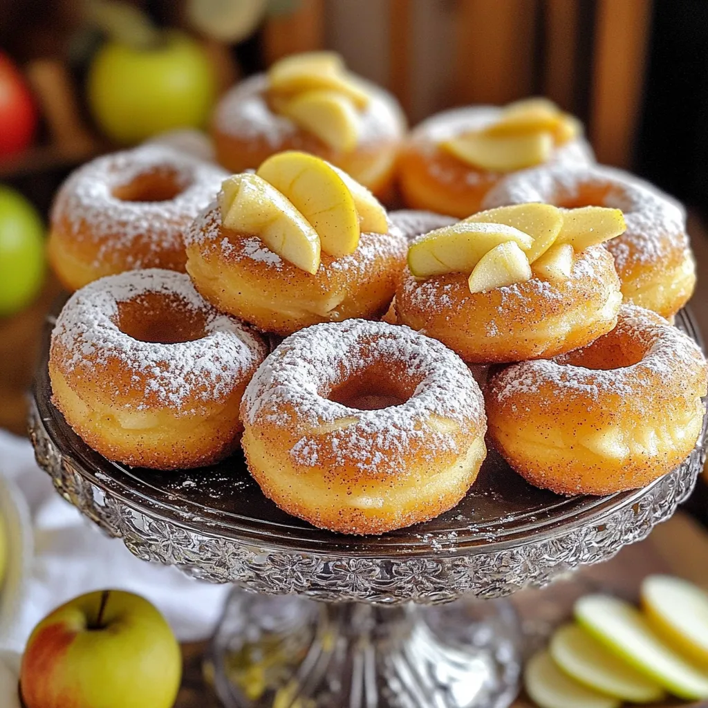 Serve your donuts on a tiered cake stand. This makes a lovely display. Dust the donuts with powdered sugar for a sweet touch. Add thin apple slices around the stand for color and freshness.