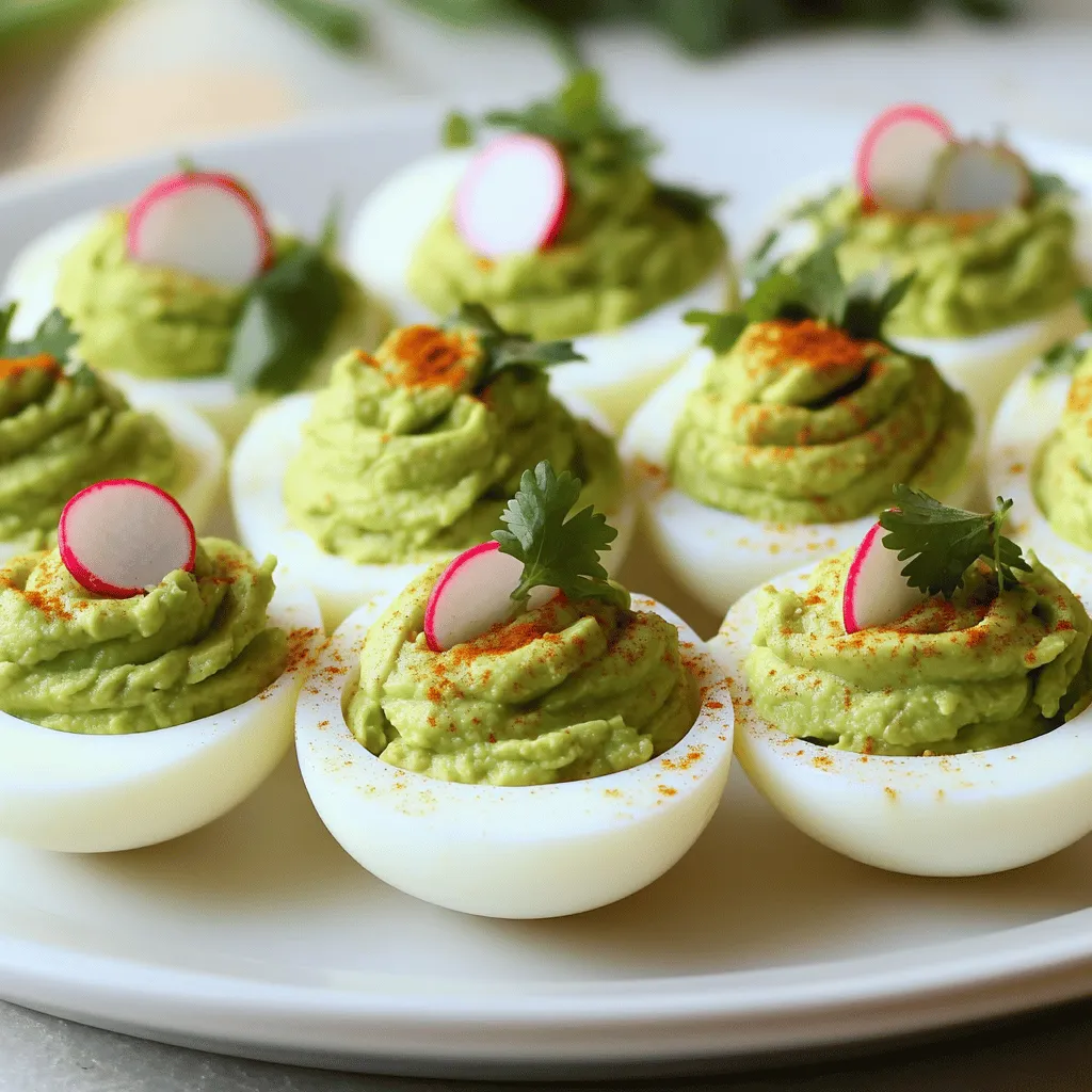 To make Avocado Deviled Eggs, you'll need a few simple ingredients. Here’s the list: - 6 large eggs - 1 ripe avocado - 2 tablespoons Greek yogurt - 1 tablespoon Dijon mustard - 1 tablespoon lime juice - 1/2 teaspoon garlic powder - 1/4 teaspoon smoked paprika - Salt and pepper to taste - Fresh cilantro for garnish (optional) - Sliced radishes for decoration (optional) These ingredients blend together to create a creamy, flavorful filling. The ripe avocado adds a rich texture and healthy fats. Greek yogurt gives a tangy note and keeps it light. Dijon mustard and lime juice add a zesty kick. Garlic powder and smoked paprika bring depth to the flavor. You can choose to garnish with cilantro and radishes to make your dish pop. Enjoy each bite as a healthy, tasty treat! For the full recipe, follow the steps to make these delicious snacks. Start by placing the eggs in a saucepan. Fill it with water so the eggs are covered by about an inch. Turn the heat to high and bring the water to a boil. Once boiling, cover the pan and take it off the heat. Let the eggs sit for 9 to 12 minutes. Use 9 minutes for creamy yolks and 12 minutes for firmer ones. After the time is up, move the eggs to a bowl of ice water. This stops the cooking and cools the eggs for easy peeling. Let them sit in the ice water for about 5 to 10 minutes. Once the eggs are cool, gently tap them to crack the shells. Peel the eggs under running water; this helps a lot. Cut each egg in half lengthwise. Carefully remove the yolks and place them in a mixing bowl. Now, add the ripe avocado, Greek yogurt, Dijon mustard, lime juice, garlic powder, smoked paprika, salt, and pepper to the yolks. Use a fork to mash everything together until it’s smooth and well mixed. This filling is where the flavor and nutrition come alive! Now it’s time to fill the eggs! Spoon or pipe the avocado mixture back into the hollowed egg whites. Fill them generously for a tasty bite. For a bit of flair, sprinkle extra smoked paprika on top. If you like, you can also garnish with fresh cilantro and slices of radish. This adds color and a bit more flavor. Enjoy your healthy and delicious avocado deviled eggs, packed with flavor and nutrition! You can find the full recipe to guide you through this process. To cook perfect eggs, start with cold water. Place the eggs in a pot. Cover them with water, about one inch above the eggs. Bring the water to a boil. Once it boils, cover the pot and remove it from the heat. Let the eggs sit for 9 to 12 minutes. If you want creamy yolks, choose 9 minutes. For firmer yolks, go for 12 minutes. After time is up, cool the eggs in ice water for 5 to 10 minutes. This stops the cooking and makes peeling easier. If you have leftover avocado deviled eggs, store them in the fridge. Use an airtight container to keep them fresh. Place a piece of plastic wrap over the eggs to reduce air exposure. They stay good for up to two days. After that, the avocado may brown, so enjoy them soon! You can switch up the recipe with different ingredients. If you want a vegan option, replace the egg yolks with blended chickpeas. Use tahini instead of Greek yogurt for creaminess. You can also add spices like cayenne for heat. Try other herbs too, like dill or chives, for new flavors. Mix and match to find your favorite taste! For the full recipe, check the details above. {{image_2}} To spice things up, add some heat to your avocado deviled eggs. You can mix in a teaspoon of hot sauce or some finely chopped jalapeños. This adds a nice kick. If you want more flavor, consider adding some cayenne pepper or chili powder. These spices give a warm, zesty taste. You can also top the eggs with sliced jalapeños for extra crunch and heat. For a Mediterranean twist, add some chopped olives and sun-dried tomatoes. These ingredients bring rich, savory flavors. You can swap Greek yogurt for creamy feta cheese. This gives a tangy taste that pairs well with avocado. To finish, sprinkle some fresh herbs like dill or parsley on top. This makes your dish colorful and fresh. To make these eggs vegan, skip the eggs and use tofu. Silken tofu works best for a creamy texture. Blend it with avocado, lime juice, and spices from the base recipe. This creates a rich filling without using eggs. You can add nutritional yeast for a cheesy flavor. Serve with a sprinkle of paprika for color. This version is healthy and perfect for plant-based diets. For the full recipe, check the details above. Store your avocado deviled eggs in the fridge. Use a sealed container to keep them fresh. They taste best when eaten within three days. If you want to keep them longer, separate the filling from the egg whites. This helps maintain texture and flavor. For longer storage, freeze the filling. Place it in an airtight container or a freezer bag. You can keep it frozen for up to a month. When ready to use, thaw it in the fridge overnight. Then, fill your egg whites just before serving. To keep your eggs fresh, avoid adding the garnish until serving time. This keeps the presentation nice and prevents sogginess. If you notice browning on the avocado filling, add a splash of lime juice. This keeps the color bright and appetizing. Always check for any off smells before eating. If something seems off, it's best to toss it. Enjoy your avocado deviled eggs while they're fresh! To stop the avocado from turning brown, use lime juice. It has citric acid that slows oxidation. When you mix it with the avocado, the color stays bright. Cover the mixture with plastic wrap. Press it tightly against the surface to keep air out. This helps keep it fresh longer. Yes, you can make this recipe ahead of time. Prepare the filling and store it in the fridge. Keep it in an airtight container to avoid browning. You can also boil the eggs a day before. Just fill them with the avocado mixture when you are ready to serve. If you don’t have Greek yogurt, use sour cream instead. It adds a nice tang and creaminess. You can also u