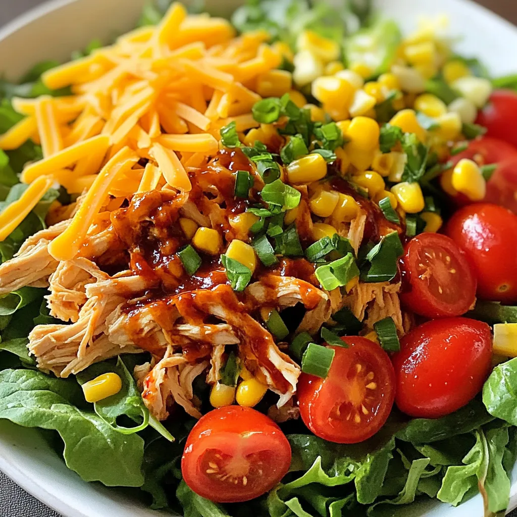 Now, grab another large bowl. Start with 4 cups of mixed salad greens as your base. I like to use romaine, spinach, and arugula for a crunchy mix. Next, scatter 1 cup of halved cherry tomatoes, 1 cup of corn, and 1 diced red bell pepper over the greens. Then, gently add the BBQ chicken on top of the salad mix. This layering makes the salad colorful and tasty.