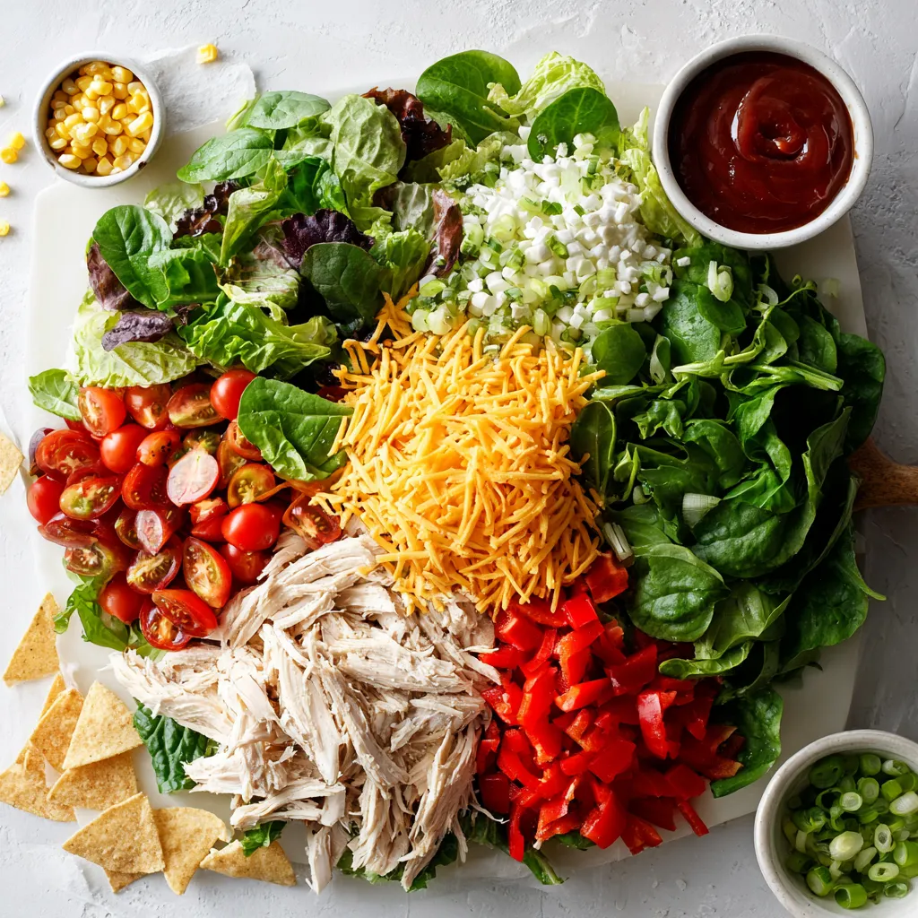 To make a BBQ Ranch Chicken Salad, gather these fresh ingredients. Start with cooked chicken. You can use rotisserie chicken or cook it at home. Shred the chicken into bite-sized pieces. This makes it easy to mix with other flavors.