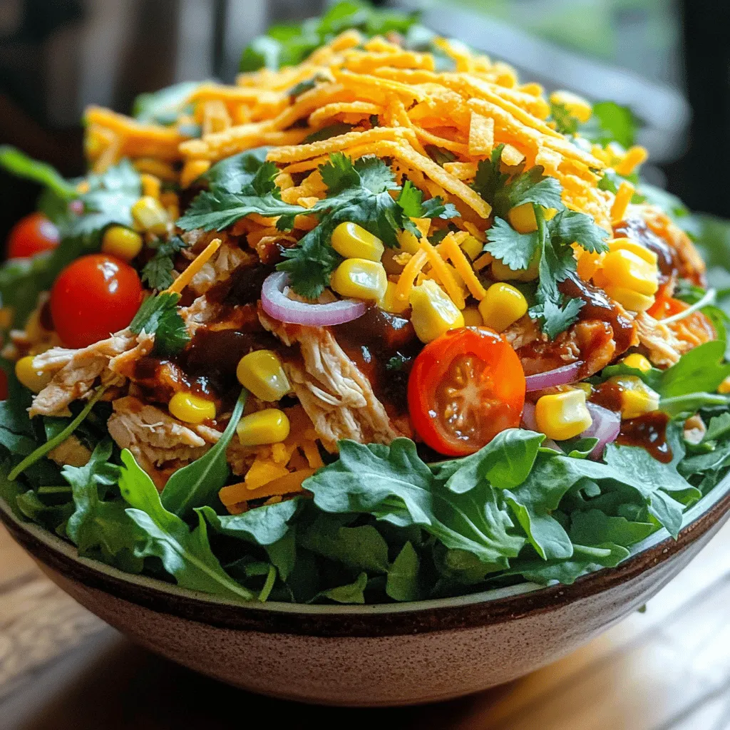 Grab a large mixing bowl. Layer mixed greens at the bottom. I like a mix of romaine, spinach, and arugula for crunch and taste. Next, add halved cherry tomatoes, corn kernels, and red onion slices. Top this with shredded cheddar cheese for a creamy finish. Finally, gently fold in the BBQ-coated chicken, spreading it evenly.