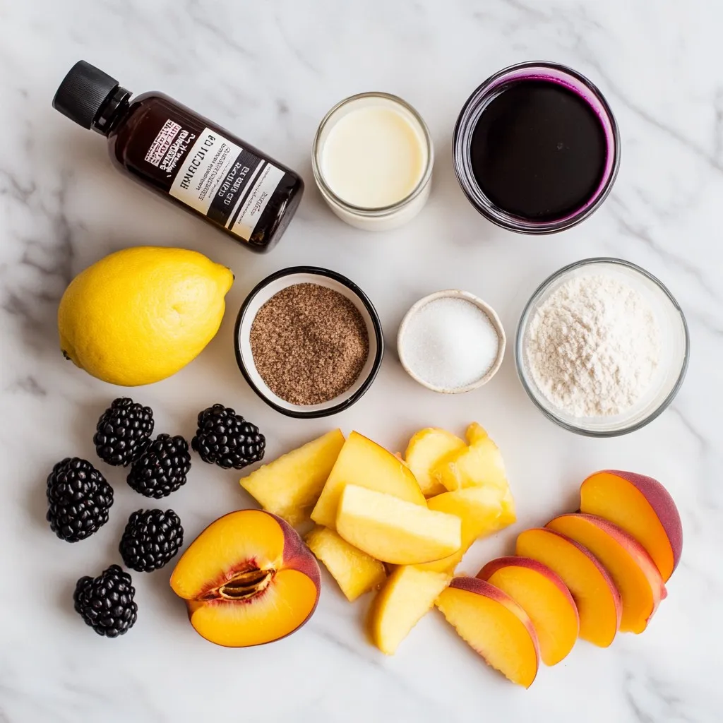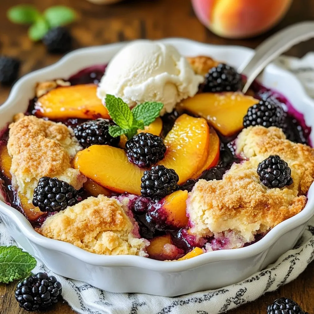 To make this tasty blackberry peach cobbler, gather these ingredients: - 2 cups fresh blackberries - 2 cups fresh peaches, peeled and sliced - 1/2 cup granulated sugar - 1 tablespoon lemon juice - 1 teaspoon vanilla extract - 1 teaspoon ground cinnamon - 1/4 teaspoon salt - 1 cup all-purpose flour - 1 tablespoon baking powder - 1/4 cup unsalted butter, melted - 3/4 cup milk - 1/2 teaspoon almond extract (optional) - Ice cream or whipped cream for serving (optional) You can change some ingredients if needed. Use frozen blackberries and peaches if fresh ones aren’t available. If you want a different flavor, swap out the almond extract for extra vanilla. For a healthier option, you can replace granulated sugar with honey or maple syrup. You can also use coconut oil instead of butter for a dairy-free twist. Using fresh ingredients makes a big difference in taste. Fresh blackberries and peaches have bright flavors and juicy textures. They add natural sweetness and richness to your cobbler. Fresh fruit also makes your dessert look more appealing. When you use ripe, in-season fruit, it enhances the overall flavor and quality of the dish. This is especially true for a dessert like this where fruit is the star. So, always try to use fresh, high-quality ingredients for the best results! {{ingredient_image_1}} Start by washing your blackberries well. You want to keep them fresh. Then, take two cups of fresh peaches. Peel them and slice them into thin pieces. In a big bowl, mix the blackberries and peaches together. Add 1/4 cup of granulated sugar to the fruit. Pour in one tablespoon of lemon juice and one teaspoon of vanilla extract. Sprinkle in a teaspoon of ground cinnamon and 1/4 teaspoon of salt. Gently toss everything together. This helps the fruit soak up all the flavors. Once mixed, pour the fruit into your greased baking dish. In a separate bowl, whisk together 1 cup of all-purpose flour and 1 tablespoon of baking powder. Add the remaining 1/4 cup of sugar to this mix. In another bowl, combine 1/4 cup of melted unsalted butter, 3/4 cup of milk, and 1/2 teaspoon of almond extract, if you want to use it. Pour this wet mix into the dry ingredients and stir. Be gentle; just mix until you see no dry flour. It’s fine if the batter is a little lumpy; this will make your cobbler soft. Now it’s time to bake! Spoon the batter carefully over the fruit in the baking dish. It doesn’t need to cover all the fruit. Your cobbler will spread out as it cooks. Place the dish in your preheated oven at 375Β°F (190Β°C). Bake for about 35 to 40 minutes. Watch for the top to turn golden brown. Stick a toothpick in the batter. If it comes out clean, your cobbler is ready! Let it cool for 10 to 15 minutes before serving. Enjoy your delicious blackberry peach cobbler! To prevent sticking, use unsalted butter. Take a paper towel and apply a thin layer. Make sure to coat the bottom and sides well. This step helps your cobbler come out smoothly. You can also use cooking spray if you prefer. Just spray evenly across the dish. The secret to a great texture lies in the batter. Do not overmix your batter; mix just until combined. This keeps the cobbler light and fluffy. For a crisp top, let the batter rest for a few minutes before spooning it over the fruit. Bake until the top is golden brown. A toothpick should come out clean when poked. Use pre-sliced fruit to save time. You can also prep the fruit mixture ahead and store it in the fridge. If you are in a big rush, consider using frozen fruit. Just thaw and drain it well. This method speeds up your cooking time without losing flavor. Pro Tips Fresh Fruits Matter: Use ripe, fresh blackberries and peaches for the best flavor. Overripe or too firm fruits can affect the overall taste and texture of the cobbler. Experiment with Spices: Feel free to add a pinch of nutmeg or ginger along with the cinnamon for a warm, spiced flavor that complements the fruits beautifully. Don’t Overmix: When combining the wet and dry ingredients, mix until just combined. Overmixing can lead to a tough cobbler instead of a light and fluffy texture. Serving Suggestions: Serve your cobbler warm with a scoop of vanilla ice cream or a dollop of whipped cream. Adding a sprinkle of cinnamon on top enhances the presentation and flavor. {{image_2}} You can swap fruits in this recipe to fit the season. Try using strawberries or raspberries for a berry twist. In the fall, apples and pears pair well with blackberries. Each fruit adds its own flavor, making the cobbler unique. Experimenting with different fruits keeps this treat exciting all year long. To make a gluten-free version, use almond flour or a gluten-free flour blend. Substitute the all-purpose flour with a 1:1 gluten-free blend. Ensure other ingredients, like baking powder, are also gluten-free. This way, everyone can enjoy the cobbler without worry. The taste remains delicious and satisfying. Making this cobbler dairy-free is simple. Use almond milk or coconut milk instead of regular milk. For the butter, substitute it with coconut oil or a dairy-free spread. These swaps keep the flavor rich while catering to dairy-free diets. Your cobbler will still taste amazing, and no one will miss the dairy. To keep your leftover cobbler fresh, let it cool down first. Once cooled, cover it tightly with plastic wrap or aluminum foil. You can also place it in an airtight container. This keeps the cobbler moist and tasty. Store it in the fridge for up to 3 days. When you are ready to enjoy your cobbler again, preheat your oven to 350Β°F (175Β°C). Place the cobbler in an oven-safe dish and cover it with foil. Heat for about 15-20 minutes. This warms it through without drying it out. If you like, you can also microwave individual servings. Heat them for 30 seconds to 1 minute, checking often. You can freeze blackberry peach cobbler if you want to save some for later. First, let it cool completely. Cut the cobbler into slices for easy serving. Wra