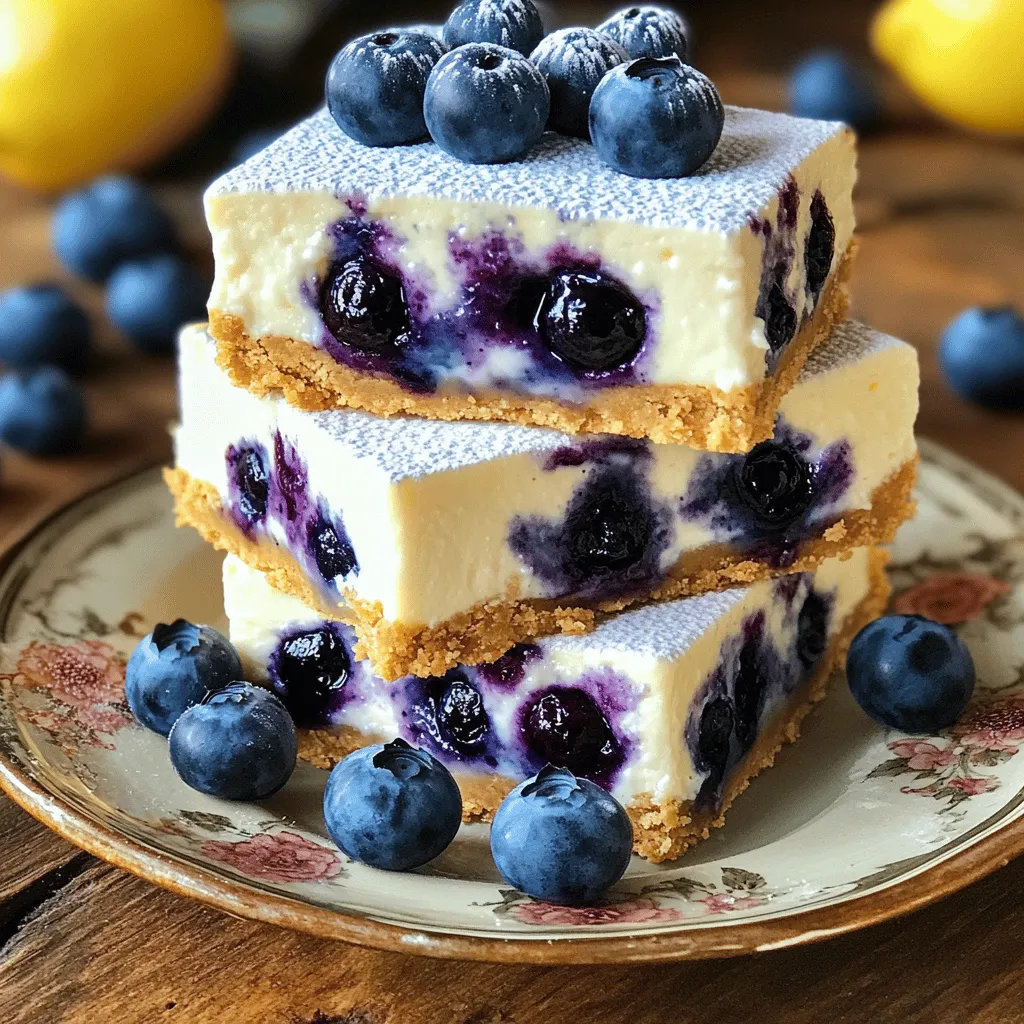 For the crust, you will need: - 1 ½ cups graham cracker crumbs - ½ cup unsalted butter, melted - 2 tablespoons sugar For the cheesecake filling, gather: - 2 (8 oz) packages cream cheese, softened - ½ cup granulated sugar - 2 large eggs - 1 teaspoon vanilla extract - Zest of 1 lemon - ⅓ cup fresh lemon juice - 1 cup fresh blueberries (plus a few extra for garnish) For the topping, prepare: - ½ cup sour cream - 2 tablespoons powdered sugar - Zest of 1 lemon Each ingredient plays a key role. The graham cracker crumbs create a sweet and crunchy base. The butter helps bind the crumbs, while the sugar adds sweetness. The cream cheese is the star. It gives the cheesecake its rich and creamy texture. The sugar balances the tanginess. Eggs help set the filling as it bakes. Lemon zest and lemon juice add a bright and fresh flavor. Blueberries bring natural sweetness and a pop of color. The topping of sour cream and powdered sugar adds a creamy finish, brightened by more lemon zest. Gather these ingredients, and you are ready to create a delightful dessert treat! - Set oven temperature to 325°F (160°C) - Prepare an 8x8 inch baking pan Start by turning on your oven. This step is key to get the right bake. While the oven warms, get your baking pan ready. You can grease it with nonstick spray or line it with parchment paper. This makes it easy to lift out later. - Combine graham cracker crumbs, butter, and sugar - Press the mixture into the baking pan and bake Next, let's make the crust. In a mixing bowl, add graham cracker crumbs, melted butter, and sugar. Mix well until it looks like wet sand. Take this mixture and press it firmly into the bottom of your pan. This forms a solid base. Bake it in the oven for 8 to 10 minutes until it turns lightly golden. Once done, remove it and let it cool. - Beat cream cheese and sugar until smooth - Mix in eggs, vanilla, lemon zest, and lemon juice - Fold in fresh blueberries Now for the filling! In a large bowl, beat the softened cream cheese and granulated sugar together with an electric mixer. Keep mixing until it’s smooth. Then, add the eggs one at a time. Make sure to mix well after each egg. Next, stir in the vanilla extract, lemon zest, and fresh lemon juice. Finally, gently fold in the fresh blueberries, but be careful not to crush them. - Pour the filling over the crust and bake - Allow to rest in the oven after baking After making the filling, pour it over the cooled crust. Use a spatula to spread it evenly. Bake in the oven for 30 to 35 minutes. The edges should be set, but the center should jiggle a bit. Once baked, turn off the oven. Let the bars rest in the oven for 10 more minutes. This helps them set nicely. - Combine sour cream, powdered sugar, and lemon zest While the cheesecake cools, let’s make the topping. In a small bowl, mix sour cream, powdered sugar, and lemon zest until smooth. This adds a creamy and tangy layer on top. - Cool at room temperature before chilling in the fridge - Cut into bars after chilling After all the baking, let the cheesecake cool at room temperature for about 30 minutes. Then, spread the sour cream topping evenly over the cheesecake. It’s best to chill it in the fridge for at least 4 hours. For the best flavor, let it chill overnight. Once it’s set, lift the cheesecake bars out of the pan using the parchment paper. Cut them into squares or rectangles. Enjoy these delightful treats! To get a smooth cheesecake, always beat the cream cheese well. Start with softened cream cheese. This helps it mix easily. Use an electric mixer on medium speed. Beat until it looks creamy, with no lumps. When you add the blueberries, fold them in gently. This keeps the berries intact. If you stir too hard, you may crush them. You want to see those lovely blueberries in each bar. To kick up the flavor, try adding almond or coconut. A teaspoon of almond extract gives a nice twist. You can also use coconut cream instead of sour cream for a tropical feel. Adding more lemon zest boosts the fresh taste. Try using the zest of two lemons. This makes the bars even more vibrant and zesty. You’ll love that pop of flavor! When serving, cut the cheesecake bars evenly. Use a sharp knife and wipe it clean between cuts. This keeps the edges neat and pretty. Garnish with extra blueberries on top. You can also sprinkle some lemon zest for color. This makes each bar look inviting and delicious. {{image_2}} You can use other fruits in your cheesecake bars. Raspberries and strawberries work great. They add a nice tartness. You can also create a mixed berry cheesecake. This gives you a burst of flavor in every bite. Just combine blueberries, raspberries, and strawberries for a colorful treat. Switching up the crust can change the whole taste. Try using cookie crumbs like Oreos or nuts for a new flavor. You can even use almond flour for a gluten-free option. This is great for those with dietary needs. It adds a unique crunch that complements the creamy filling. If you want to make vegan cheesecake bars, it’s simple. Use plant-based cream cheese instead of regular cream cheese. Replace eggs with flaxseed meal or applesauce. This keeps the texture smooth and creamy. You can also substitute coconut cream for sour cream. These changes maintain the yummy taste while being dairy-free. To store your blueberry lemon cheesecake bars in the fridge, first, cover them well. Use plastic wrap or an airtight container. This helps keep them fresh and tasty. They can stay in the fridge for up to five days. Check for any changes in smell or texture before you eat them. For the best taste, enjoy them within three days. If you want to keep your cheesecake bars longer, you can freeze them. First, cut the bars into squares. Then, wrap each piece tightly in plastic wrap. Place the wrapped bars in a freezer-safe bag or container. They can stay frozen for up to two months. When you are ready to eat them, take them out and thaw in the fridge overnight. Serve them chi