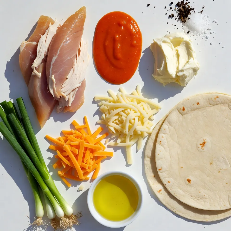 To start, gather your ingredients. You need cooked chicken, buffalo sauce, cream cheese, and spices. In a bowl, mix 2 cups of shredded chicken with 1/2 cup of buffalo sauce. Add 1/2 cup of softened cream cheese. Stir until it’s smooth and creamy. Taste the mixture and add salt and pepper if needed. This blend gives your quesadillas the spicy kick you want.