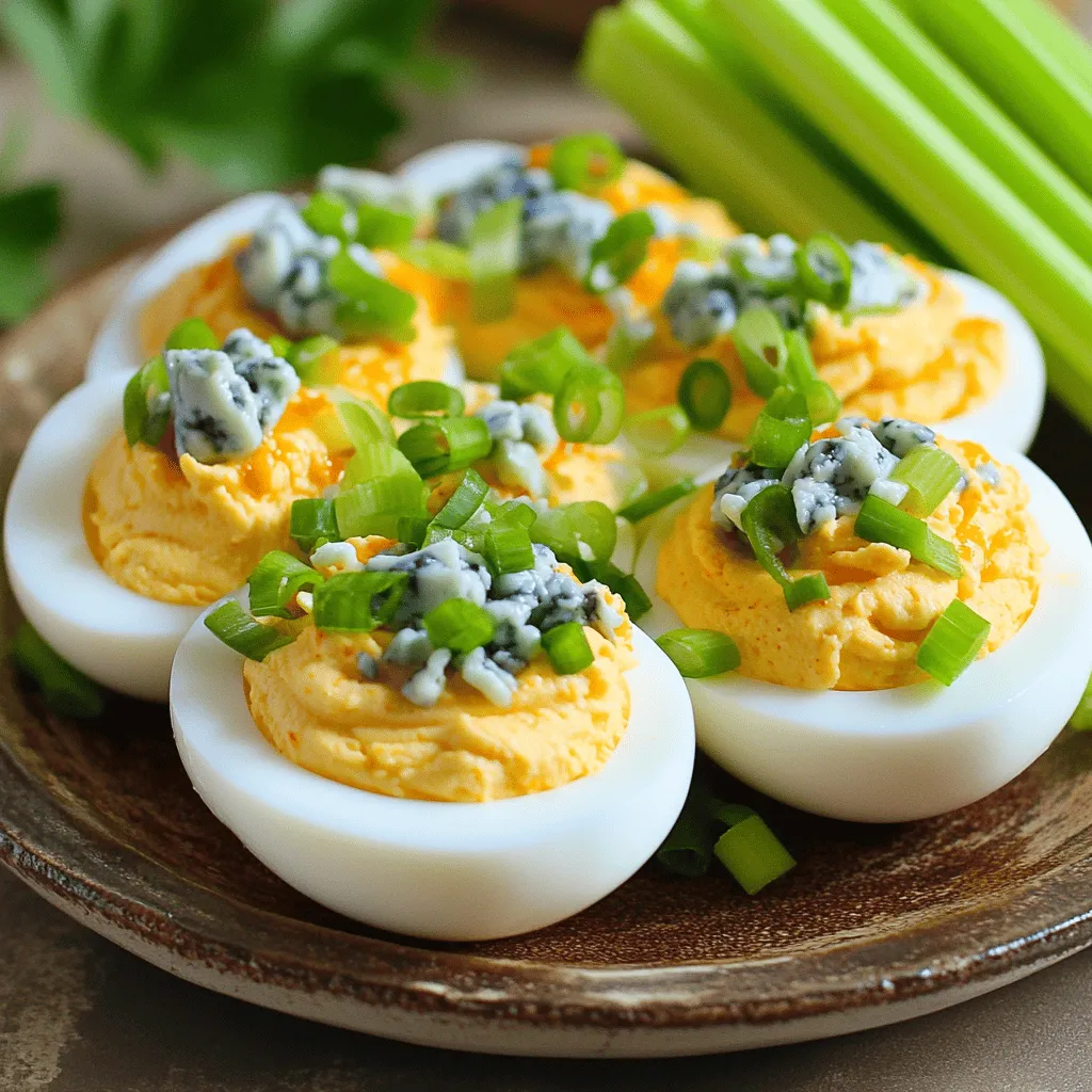 To make them look great, sprinkle extra blue cheese and some chopped green onions on top. These add a nice pop of color and flavor. If you want extra crunch, serve with celery sticks on the side. Enjoy your Buffalo Deviled Eggs!