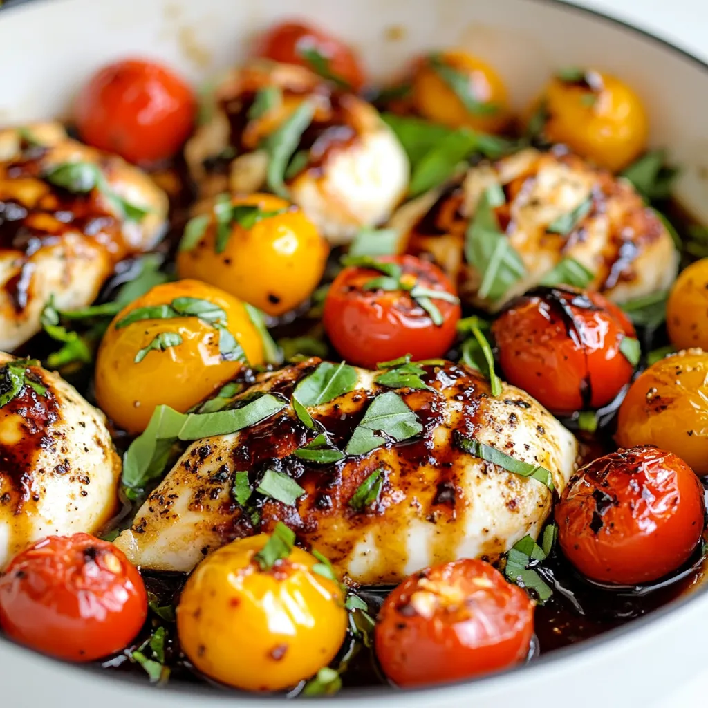 Now it’s time to bring everything together. Lower the heat and return the chicken to the skillet. Top each chicken breast with fresh mozzarella balls. Cover the skillet with a lid and let it cook for another 2 to 3 minutes. The mozzarella should melt nicely. Once melted, remove the skillet from the heat. Drizzle balsamic glaze over the chicken and tomatoes. Finally, sprinkle chopped fresh basil on top for a burst of flavor. Enjoy your meal hot!