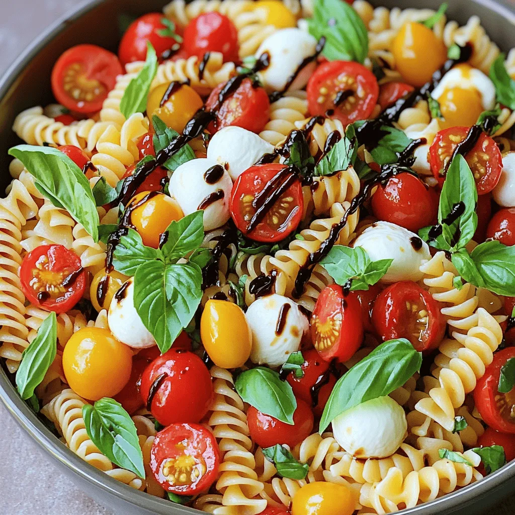 - 8 ounces rotini or fusilli pasta - 1 cup cherry tomatoes, halved - 1 cup fresh mozzarella balls (bocconcini), drained - 1 cup fresh basil leaves, torn - 3 tablespoons extra-virgin olive oil - 1 tablespoon balsamic glaze - 1 teaspoon garlic powder - Salt and pepper to taste To make Caprese Pasta Salad, start with these fresh ingredients. The rotini or fusilli pasta provides a nice twist. You can choose either type, but I love how rotini holds the dressing well. Cherry tomatoes add sweetness and color. Halving them makes them easy to eat. Fresh mozzarella balls bring creamy goodness. I always use bocconcini, as they are bite-sized and perfect for salads. Torn basil leaves add a lovely aroma and fresh taste. They really tie everything together. The dressing is simple but rich. Extra-virgin olive oil gives depth. Balsamic glaze adds a tangy sweetness. Garlic powder enhances flavor without being overpowering. Finally, season with salt and pepper to taste. Adjust these to your liking for the best result. Gather these ingredients, and you're ready to make a vibrant, flavorful dish that everyone will love! To cook rotini or fusilli pasta, start with a large pot. Fill it with water and add a pinch of salt. Bring the water to a rolling boil. Then, add the pasta and stir once. Cook according to the package, usually about 8-10 minutes. You want it al dente, which means firm to the bite. To check, taste a piece a minute or two before the time is up. When done, drain the pasta and rinse it under cold water. This stops cooking and cools it down. In a large mixing bowl, combine the cooled pasta, halved cherry tomatoes, fresh mozzarella balls, and torn basil leaves. I find this part fun! Use a spatula or a large spoon to mix gently. This ensures even distribution of all ingredients. You want every bite to be full of flavor. Don’t rush this step; it makes a big difference. In a separate small bowl, whisk together the olive oil, balsamic glaze, garlic powder, salt, and pepper. Make sure all ingredients blend well. Taste the dressing to ensure it suits your taste. Adjust the seasoning if needed. A little more salt or balsamic glaze can brighten the flavor. Pour the dressing over the pasta salad. Gently toss everything together. This helps the dressing coat the pasta and vegetables evenly. After mixing, let the salad sit for about 10 minutes. This resting time allows the flavors to meld together, making every bite even better! Using fresh ingredients makes a big difference. Fresh tomatoes give sweet bursts of flavor. Choose ripe cherry tomatoes for the best taste. Fresh mozzarella adds a creamy texture. Look for small mozzarella balls called bocconcini. Fresh basil leaves add a nice herbal note. You can tear them for more flavor. For added kick, try mixing in garlic powder or red pepper flakes. Fresh herbs like parsley or oregano can also enhance taste. Consider adding a squeeze of lemon juice for brightness. This will lift the salad and make it even more refreshing. Presentation matters. Serve your Caprese Pasta Salad in a big bowl. Add a few whole basil leaves on top for color. Drizzle extra balsamic glaze over the salad for a gourmet touch. This makes the dish look special and inviting. Pair this salad with grilled chicken or shrimp for a full meal. A crusty baguette works well as a side. You can also serve it with a light soup for a cozy dinner. Enjoy it chilled or at room temperature for the best flavor! {{image_2}} For those with dietary needs, I have great options. You can use gluten-free pasta like brown rice or quinoa pasta. These options work well and taste great. If you're vegan, try using nut-based cheese, like cashew cheese or almond cheese. These substitutes keep the salad creamy and delicious. You can make your Caprese Pasta Salad even more exciting. Adding ripe avocado gives a creamy texture. Diced bell peppers add crunch and color. You can also try different dressings. A lemon vinaigrette adds a zesty twist. A pesto dressing brings rich, herby flavors. Experiment with these ideas to find your favorite mix! To keep your Caprese Pasta Salad fresh, store it in an airtight container. This helps lock in the flavors. If you have a lot, divide it into smaller portions. This makes it easy to grab later. In the fridge, the salad lasts about three days. After that, the ingredients may start to lose their crispness. Always check for any off smells or changes in texture before eating. You can serve Caprese Pasta Salad cold or at room temperature. I prefer it cold because it feels refreshing. If you want to warm it up, do so gently. Heat it on low and stir to avoid cooking the ingredients. To refresh the salad before serving, add a splash of olive oil or balsamic glaze. This brings back the flavors. Toss everything together to ensure it is evenly coated. Enjoy the burst of flavors! Yes, you can make Caprese Pasta Salad ahead of time. I suggest preparing it a few hours before serving. This allows the flavors to blend well. However, if you plan to store it, keep the dressing separate until just before serving. Mixing the dressing too early can make the pasta soggy. If you don't have balsamic glaze, try balsamic vinegar. It will give a nice tangy flavor. Alternatively, you can use red wine vinegar mixed with a little honey or maple syrup for sweetness. This will add a similar taste without the glaze. Caprese Pasta Salad is not gluten-free if you use regular pasta. To make it gluten-free, choose gluten-free pasta made from rice or quinoa. These options work well and keep the salad tasty and light. I recommend using rotini or fusilli pasta. These shapes hold onto the sauce and ingredients nicely. Their twists and turns catch the dressing and flavors perfectly. You can also use penne or farfalle if you prefer. Yes, you can add protein to your Caprese Pasta Salad. Grilled chicken or shrimp works great. You can also try chickpeas or diced tofu for a vegetarian option. Adding protein makes the salad more fill