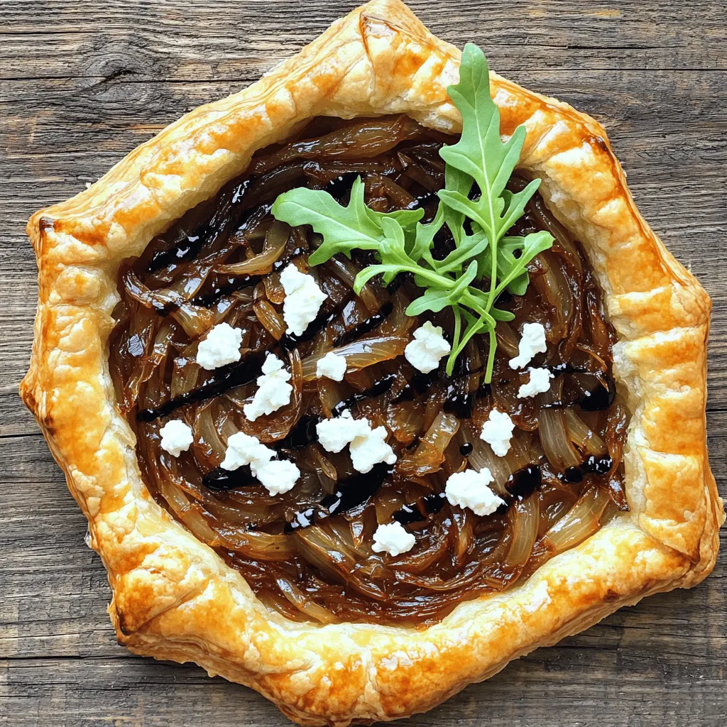 ![To make the Caramelized Onion and Goat Cheese Tart, gather these ingredients: - 1 sheet of puff pastry, thawed - 3 large onions, thinly sliced - 3 tablespoons unsalted butter - 2 tablespoons olive oil - 1 teaspoon sugar - 1 teaspoon thyme, fresh or dried - 4 oz goat cheese, crumbled - 1 tablespoon balsamic vinegar - Salt and pepper to taste - A handful of fresh arugula (for garnish) This list gives you everything you need for a delicious tart. If you can't find goat cheese, try feta or cream cheese. These options will still give a creamy texture. For the onions, sweet onions work best, but yellow onions are fine too. You can swap fresh thyme with dried herbs if needed. Using a different pastry? You can use pie crust or a gluten-free puff pastry if that suits your needs. Choose fresh onions that feel firm and heavy. Look for puff pastry that is flaky and well-packaged. Always check the expiration date on cheese. Fresh goat cheese should smell pleasant and creamy. For herbs, select vibrant greens without browning. Quality ingredients make your tart taste even better. For the full recipe, check the section above. Start by gathering all your ingredients. You need puff pastry, onions, goat cheese, and a few herbs. Make sure your puff pastry is thawed and ready to use. This will help it puff nicely when baked. 1. Preheat the Oven: Set your oven to 400°F (200°C). This ensures even cooking for your tart. 2. Caramelize the Onions: In a large skillet, melt the butter and olive oil over medium heat. 3. Add Onions: Add the thinly sliced onions, salt, and sugar. Stir well. Cook these onions slowly for 25-30 minutes. Keep an eye on them, stirring every few minutes. You want them to turn golden brown and sweet. 4. Finish with Herbs: In the last few minutes, add thyme and balsamic vinegar. This adds a nice depth of flavor. Once done, set the onions aside to cool. 5. Prepare the Puff Pastry: Roll out the puff pastry on a floured surface. This helps to smooth out any creases. 6. Shape the Pastry: Place the puff pastry on a baking sheet lined with parchment paper. Use a knife to gently score a 1-inch border around the edges. Be careful not to cut all the way through. 7. Assemble the Tart: Spread the caramelized onions evenly within the scored border. Then, sprinkle crumbled goat cheese on top. 8. Bake the Tart: Place the tart in the oven and bake for 20-25 minutes. Look for a puffed and golden brown pastry. 9. Garnish: Once baked, let the tart cool for a few minutes. Top with fresh arugula for a pop of color. Slice and serve warm or at room temperature. - Keep It Cold: Always work with cold puff pastry. This helps it puff up better when baked. - Watch for Burns: The oven can be hot. Use oven mitts when handling the tart. - Avoid Cross-Contamination: Use separate cutting boards for raw and cooked foods. This keeps everything safe and clean. Enjoy your Caramelized Onion and Goat Cheese Tart with the Full Recipe for the best experience! Caramelizing onions takes patience. Start with medium heat. Use a large skillet. Add butter and olive oil. This mix helps the onions cook evenly. Stir the onions often. This keeps them from burning. Add a pinch of salt and sugar. This will help them caramelize better. Cook for 25-30 minutes. Look for a deep golden brown color. The sweeter the taste, the better the onions will be. For perfect puff pastry, keep it cold. Thaw it in the fridge, not at room temp. Roll it out gently on a floured surface. Use a sharp knife to score the edges lightly. This creates a nice border once baked. Don't press too hard; you want the layers to stay intact. Bake it until it's golden and puffed. This makes each bite light and flaky. This tart pairs well with a fresh salad. Try arugula or mixed greens. A light vinaigrette adds a nice touch. For drinks, a crisp white wine works great. You can also serve it with a fruit chutney. This adds a sweet and tangy flavor. Feel free to enjoy it warm or at room temperature. Each slice is a delight. For the full recipe, check out the details above. {{image_2}} You can swap goat cheese for other cheeses. Feta adds a salty kick. Cream cheese gives a smooth texture. Try sharp cheddar for a bold flavor. Use ricotta for a creamy base. Each cheese brings its own charm to the tart. Want to add more to your tart? Try adding spinach or mushrooms. Both blend well with onions. You can also mix in cooked chicken or bacon for protein. This makes the tart heartier and more filling. Get creative with whatever you have on hand. If you need a gluten-free option, look for gluten-free puff pastry. Many brands now make this tasty alternative. You can also use a gluten-free pie crust or dough. This way, you still enjoy the tart without gluten. Always check the labels to ensure safety. For the full recipe, check out the details above! To store your leftover tart, let it cool completely first. Wrap it in plastic wrap or place it in an airtight container. Store it in the fridge for up to three days. This keeps it fresh and ready for your next meal. To reheat, preheat your oven to 350°F (175°C). Place the tart on a baking sheet. Heat for about 10-15 minutes, or until it’s warm. This method helps keep the crust crisp. You can also use a microwave, but it may make the crust soft. You can freeze the tart for later use. Wrap it tightly with plastic wrap and aluminum foil. It can last in the freezer for up to three months. When ready to eat, thaw it in the fridge overnight and reheat as mentioned above. Enjoy the flavors just like fresh! For more details, check the Full Recipe. Yes, you can make this tart ahead of time. I suggest preparing the caramelized onions and the puff pastry separately. You can store the onions in the fridge for up to three days. When ready to serve, spread the onions on the pastry and bake. This keeps the crust nice and crisp. This tart pairs well with several sides. Here are some great options: - A fresh green salad with lemon vinaigrette - Roasted vegetab