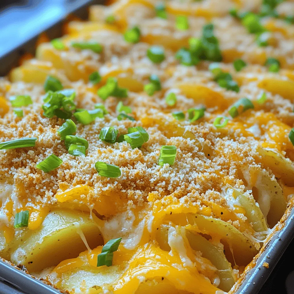 For the creamy base, mix the sour cream with milk and melted butter. The garlic and onion powders give it a nice kick. Green onions add color and freshness on top. The breadcrumbs and Parmesan create a crunchy, golden layer that contrasts well with the soft potatoes.