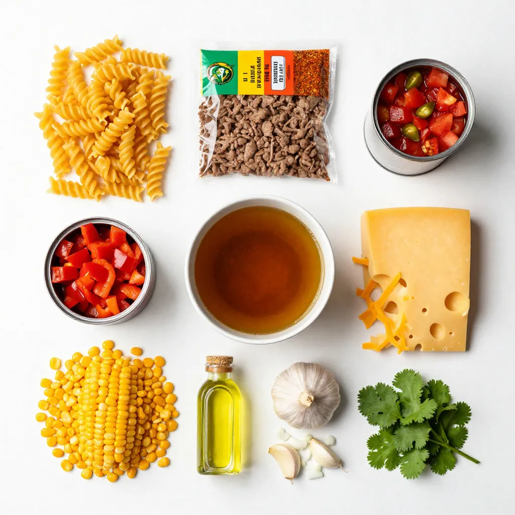 This recipe uses rotini pasta, which holds sauce well. Ground beef gives a rich taste, but turkey works too. The taco seasoning adds great flavor. Diced tomatoes with green chilies bring heat and tang. Beef broth keeps it moist. Frozen corn adds sweetness and color. Diced red bell pepper and onion add crunch. Garlic gives it depth.