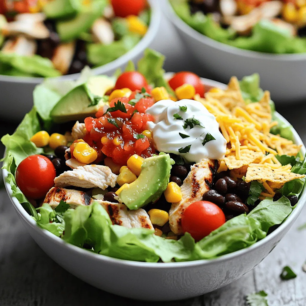 - 2 boneless, skinless chicken breasts - 1 tablespoon olive oil - 1 teaspoon chili powder - 1 teaspoon cumin - 1 teaspoon garlic powder - 1 teaspoon onion powder - Salt and pepper to taste The chicken is the star of our salad. The marinade makes it juicy and tasty. Seasoning helps bring out the best flavors. Use enough spices to coat the chicken well. This step is key for a delicious meal. - 4 cups romaine lettuce, chopped - 1 cup cherry tomatoes, halved - 1 cup black beans, rinsed and drained - 1 cup corn (fresh, frozen, or canned) - 1 avocado, diced - ½ cup shredded cheese (cheddar, Monterey Jack, or Mexican blend) - ½ cup salsa - ¼ cup sour cream or Greek yogurt - Fresh cilantro, chopped (for garnish) - Tortilla chips (for crunch) Fresh veggies add texture and color. Romaine lettuce forms the base. Cherry tomatoes give a sweet burst. Black beans and corn add protein and fiber. Avocado brings creaminess. You can top it with cheese and salsa for extra flavor. For more fun, try adding extra toppings like jalapeños, olives, or lime juice. You can also serve this with a side of rice or tortilla chips. These extras can make the meal even more enjoyable. To make the chicken flavorful, start with the marinade. In a bowl, mix together 1 tablespoon of olive oil, 1 teaspoon of chili powder, 1 teaspoon of cumin, 1 teaspoon of garlic powder, 1 teaspoon of onion powder, salt, and pepper. This mix gives the chicken a zesty kick. Coat the chicken breasts well with this mixture. Let them sit for about 15 minutes. This short time allows the flavors to soak in without being too long. You can grill or pan-sear the chicken. If you grill, preheat your grill or grill pan to medium-high heat. Cook the chicken for about 6-7 minutes on each side. You want the internal temperature to reach 165°F (75°C). This ensures the chicken is safe to eat. If you do not have a meat thermometer, slice the chicken open. The meat should be white and no longer pink. After cooking, remove it from heat and let it cool slightly. Dice it into bite-sized pieces for the salad. Now, it’s time to build your salad bowl! Start by layering the chopped romaine lettuce at the bottom. This gives a nice base and adds crunch. Next, add the halved cherry tomatoes, black beans, corn, diced avocado, and the grilled chicken. Layering your salad not only looks great but also mixes flavors well. Fresh ingredients make a big difference in taste. The more colorful your bowl, the better it looks and tastes! Finish with salsa, sour cream or Greek yogurt, cheese, and crushed tortilla chips. Enjoy your tasty Chicken Taco Salad Bowl! For more details, check out the Full Recipe. To boost the taste of your chicken taco salad, adjust the spices. - Add cayenne pepper for heat. - Use smoked paprika for depth. Fresh herbs can also make a big difference. - Cilantro brightens the dish. - Try green onions for a mild bite. Meal prep makes life easier. You can prepare components in advance. - Cook the chicken and store it in the fridge. - Chop veggies and keep them in separate containers. This will help maintain freshness. Make your salad bowl fun and appealing. - Layer ingredients in a clear bowl for a colorful look. - Serve with crispy tortilla chips on the side. For parties, consider a taco salad bar. - Let guests build their own bowls with toppings. This keeps it interactive and fun! For the full recipe, check the link above. {{image_2}} For a tasty vegetarian version, you can swap the chicken for grilled vegetables or beans. Try using: - Grilled zucchini - Bell peppers - Sliced mushrooms - Chickpeas These options add great texture and flavor. Use spices like cumin and chili powder to keep the taste bold. You can also add roasted corn for a sweet touch. Fresh herbs like cilantro or parsley brighten up the dish. If you're looking for low-carb options, use lettuce wraps instead of tortilla chips. For gluten-free, check your salsa and toppings. Make sure they are certified gluten-free. For dairy-free variations, replace cheese with avocado or use nutritional yeast for a cheesy flavor. You can also skip sour cream and use a dairy-free yogurt or guacamole instead. To mix things up, try adding different cuisines to your salad. You could: - Incorporate Mediterranean flavors with feta cheese and olives. - Use Asian-inspired ingredients like sesame dressing and edamame. - Add Mexican flair with jalapeños and pico de gallo. Unique ingredients can take your salad to new heights. Try adding roasted nuts or seeds for crunch. You can also mix in fruits like mango or pineapple for a sweet twist. For the full recipe, check out the Zesty Chicken Taco Salad Bowls. To keep your Chicken Taco Salad Bowls fresh, use airtight containers. Store any leftovers in the fridge. The salad will stay good for up to three days. Keep the dressing separate to avoid soggy greens. This way, your salad stays crisp and tasty. If you have leftover chicken, reheat it gently. Use a microwave or stovetop. Heat the chicken just until warm. This keeps the meat tender and juicy. Avoid overheating to prevent dryness. Always store your dressing separately. This keeps your salad fresh longer. You can freeze some salad components. Chicken and black beans freeze well. Store them in freezer-safe bags. Remove as much air as possible for longer shelf life. Avoid freezing lettuce and tomatoes; they don't thaw well. Prepare your salad fresh for the best flavor and texture. To make Chicken Taco Salad Bowls, follow these key steps: 1. Marinate the chicken with olive oil, chili powder, cumin, garlic and onion powders, plus salt and pepper. 2. Grill or pan-cook the chicken until it reaches 165°F (75°C). 3. Chop romaine lettuce and place it at the bottom of your bowl. 4. Add toppings like tomatoes, black beans, corn, avocado, and the cooked chicken. 5. Drizzle salsa and add sour cream or Greek yogurt on top. 6. Finish with shredded cheese and crushed tortilla chips. This [Full Recipe] makes a colorful, tasty mea