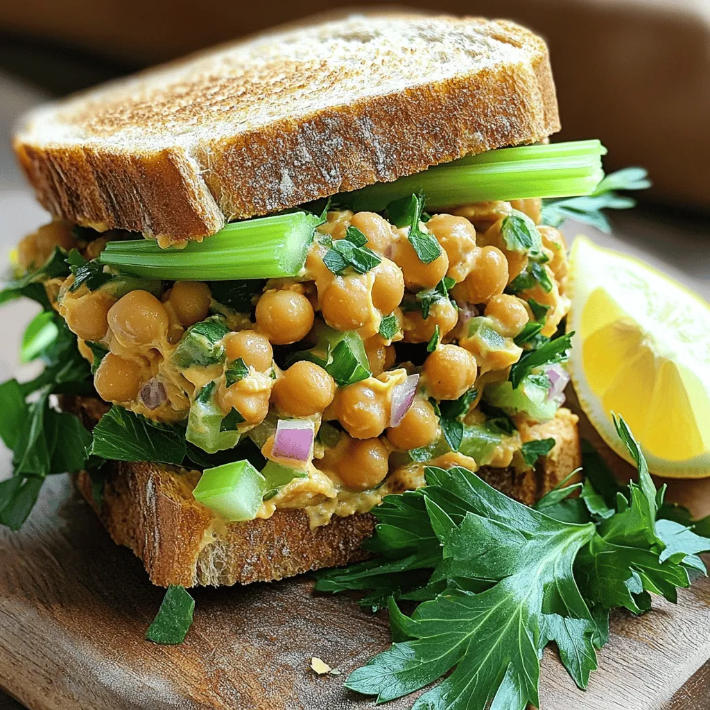 - 1 can (15 oz) chickpeas, rinsed and drained - 1/4 cup plain Greek yogurt or vegan alternative - 1 tablespoon Dijon mustard - 1 tablespoon lemon juice - 1/2 teaspoon garlic powder - 1/2 teaspoon smoked paprika - 1/4 teaspoon cumin - Salt and pepper to taste - 1/2 cup diced celery - 1/4 cup diced red onion - 1/4 cup chopped fresh parsley - Leafy greens for serving Chickpeas are the star of this sandwich. They add protein and fiber. I love using canned chickpeas for quick prep. Just rinse and drain them, and you're ready. The best types of bread for a sandwich include whole-grain or multigrain. They add a nice texture and flavor. You can also use gluten-free bread. This is great for those with dietary needs. This chickpea salad sandwich is tasty and healthy. A serving contains around 300 calories. It has about 15 grams of protein and 10 grams of fiber. Eating this sandwich can help you feel full and satisfied. For the full recipe, check out the linked details. First, mash the chickpeas right. Use a fork in a large bowl. You want them chunky, not smooth. This texture adds great bite to your sandwich. Next, mix the dressing ingredients. In the same bowl, add Greek yogurt, Dijon mustard, lemon juice, garlic powder, smoked paprika, and cumin. Season with salt and pepper. Stir it all well until combined. Now, it’s time to fold in the vegetables. Add diced celery, red onion, and parsley gently. Use a spatula to mix. This ensures you keep the nice texture of the chickpeas. Taste your mixture. Adjust seasoning if needed. If you want it tangier, add more lemon juice. For more warmth, sprinkle in extra spices. For layering, start with leafy greens on two slices of bread. This keeps the bread from getting soggy. Then, spread the chickpea mixture generously over the greens. Top with the other slices of bread. Cut the sandwich diagonally for a nice presentation. Serve on a wooden board or plate. You can garnish it with extra parsley and a lemon wedge. Enjoy your tasty and healthy delight! For the full recipe, refer to the detailed instructions above. To make your chickpea salad sandwich shine, add some spices and herbs. I recommend using: - 1/2 teaspoon of dill for a fresh taste - A pinch of cayenne pepper for heat - Freshly chopped chives for a mild onion flavor Freshness is key! Use crisp celery and bright herbs. Fresh ingredients make the salad taste better and add color. One big mistake is over-mashing the chickpeas. You want them chunky, not smooth. This texture gives your sandwich a nice bite. Another common issue is under-seasoning. Be bold with your spices! Taste as you mix. Adjust the salt, pepper, or lemon juice to your liking. For a great presentation, serve your sandwich on a wooden board. This adds a rustic feel. Garnish with a sprinkle of parsley on top. A lemon wedge on the side adds color and a zesty touch. This makes the dish look appetizing and inviting. For the full recipe, check out the Chickpea Delight Sandwich. {{image_2}} You can easily change the protein in your chickpea salad sandwich. If you like tuna, replace chickpeas with canned tuna. Shredded chicken is another great option. This keeps the sandwich tasty and filling. For a vegan twist, try using mashed avocado or a mix of lentils. These swaps add a new flavor without losing the healthy vibe. Make your chickpea salad stand out with flavor twists. For a Mediterranean vibe, add diced cucumbers, olives, and feta cheese. The salty olives and creamy cheese create balance. If you crave spice, toss in some jalapeños. This gives your sandwich a kick that many will love. Don't be afraid to mix and match flavors based on your mood! Adding unique ingredients can elevate your sandwich. Roasted vegetables like bell peppers or zucchini add a nice crunch and depth. Nuts, such as walnuts or almonds, bring extra protein and texture. Cheese can also enhance creaminess; try goat cheese or a dairy-free option. Each add-in creates a new experience and keeps your meals fresh and exciting. For the full recipe, check out the Chickpea Delight Sandwich. To keep your chickpea salad fresh, store it in the fridge. Use an airtight container to seal in moisture. Make sure to eat leftovers within three days for the best taste. If you have extra sandwiches, wrap them tightly in plastic wrap or foil. This helps prevent the bread from getting soggy. You might wonder, can you heat chickpea salad? The answer is no, it’s best served cold. Heating can change the texture and flavor. If you have leftovers, enjoy them straight from the fridge. If you prefer a warm meal, consider using the salad as a filling for a hot pita or wrap instead. Can you freeze the sandwich? Yes, but keep in mind that the texture may change. To freeze, wrap each sandwich in plastic wrap, then place them in a freezer bag. When you are ready to eat, thaw them in the fridge overnight. Avoid using the microwave. Instead, let them sit at room temperature before enjoying. This way, you’ll keep the best flavor and texture. For more detailed instructions, check the Full Recipe. If you want a vegan option, use plant-based yogurt. Almond, coconut, or soy yogurt work well. You can also try mashed avocado for creaminess without dairy. Silken tofu blended until smooth is another great choice. Each option gives your salad a unique taste. The chickpea salad stays fresh for up to three days in the fridge. Store it in an airtight container to keep it from drying out. If you added leafy greens, eat it within a day for the best texture. Always check for any off-smells before eating leftovers. Yes, you can make this sandwich a few hours in advance. If you plan to make it more than two hours ahead, keep the salad and bread separate. This way, the bread stays crisp. Assemble the sandwich right before serving for the best taste. Chickpeas are packed with protein, fiber, and vitamins. They help keep you full and support gut health. The salad also includes Greek yogurt, which adds calcium and probiotics. T