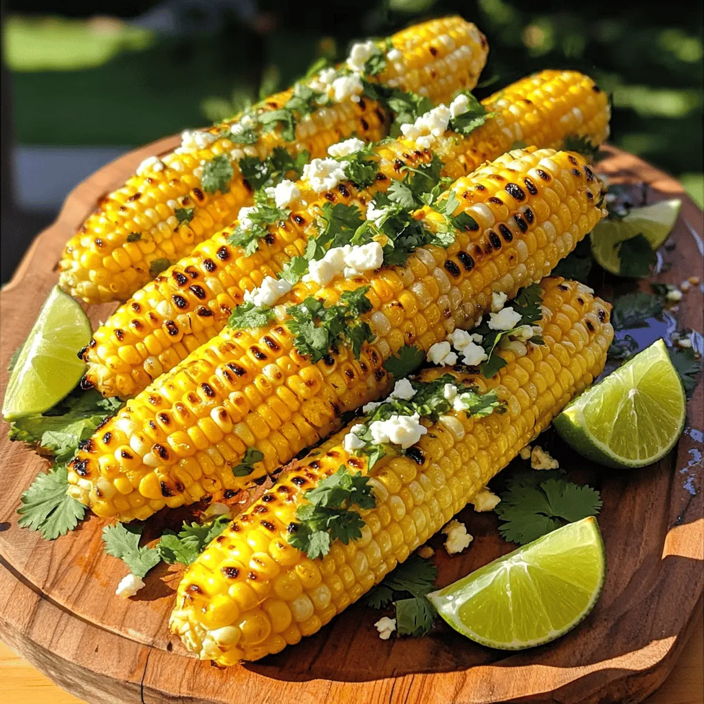 The key to making Chili Lime Grilled Corn is using fresh and vibrant ingredients. Here’s what you need: - Fresh corn (4 ears, husked) - Olive oil (2 tablespoons) - Spices and seasonings: - Chili powder (1 teaspoon) - Smoked paprika (1/2 teaspoon) - Salt and pepper to taste - Cheese options: - Crumbled feta cheese (1/4 cup) - Cotija cheese (for a different flavor) - Garnish ingredients: - Fresh cilantro (chopped) - Juice of 2 limes Using fresh corn makes a big difference. It adds sweetness and crunch. The olive oil helps the spices stick and adds richness. The chili powder and smoked paprika give it a nice kick and depth of flavor. You can choose between feta or cotija cheese for a creamy finish. I love the tang of feta, but cotija works great too. Finally, cilantro adds a fresh touch, and lime juice brightens everything up. For the full recipe, check out the complete instructions and get ready to enjoy this zesty summer side dish! Start by husking the corn. Pull down the green leaves and remove all the silk. Rinse the corn under cold water to ensure it is clean. This step is key for great flavor. Next, make the marinade. In a small bowl, mix the olive oil, chili powder, smoked paprika, lime juice, salt, and pepper. Stir well until it blends together. This marinade gives the corn its zesty kick. Now it’s time to grill. Preheat your grill to medium-high heat. This helps the corn cook evenly and get those nice grill marks. Once heated, brush the marinade onto each ear of corn. Make sure to coat all sides evenly. Place the corn directly on the grill. Cook it for about 10 to 12 minutes. Turn the corn every few minutes to avoid burning and to get that perfect char. To check if the corn is done, look for a tender texture and a nice golden-brown color. You want to see some charred spots but not too much blackening. After grilling, take the corn off the grill. Sprinkle crumbled feta cheese or cotija cheese on top. This adds a salty flavor that pairs well with the lime. For a final touch, drizzle any leftover marinade over the corn. Garnish with fresh cilantro for color and flavor. Serve the corn warm, with lime wedges on the side. This adds an extra zesty touch to each bite. You can serve this corn with other summer dishes like grilled chicken or a fresh salad. Its bright flavors make it a great side for any meal. For the full recipe, check out the details above. To make great chili lime grilled corn, managing your grill's heat is key. Preheat your grill to medium-high heat, around 400°F. This ensures even cooking. If your grill is too hot, you risk burning the corn. Keep an eye on it. Turn the corn every few minutes. You want a nice char but not blackened kernels. Adjusting spice levels can make your corn just right for you. If you like more heat, add extra chili powder. For a milder taste, use less. Fresh herbs can boost flavor too. Chopped cilantro adds a fresh touch. You can also try using fresh parsley or basil for a unique twist. One common mistake is underseasoning the corn. The marinade should have enough salt and lime juice for flavor. Don't skimp on these! Another pitfall is overcooking. Corn should grill for about 10-12 minutes. If you cook it too long, it can become tough. Follow the timing closely for the best results. For the full recipe, check the details above. {{image_2}} You can switch up the cheese for more flavor. Feta cheese works well, but cotija cheese is a great choice too. Cotija adds a salty bite that pairs nicely with lime. For a vegan option, skip the cheese or use a plant-based version. Nutritional yeast can add a cheesy taste without dairy. Herbs can change the taste of your corn. Fresh cilantro is a classic choice, but try adding basil or parsley for a twist. You can also boost the heat. Add more chili powder or toss in some cayenne pepper. If you like it spicy, jalapeños can bring the heat. Just chop them finely and mix them into the marinade. Grilling is the best way to cook corn, but you can bake it too. For oven-baked corn, wrap the ears in foil with the marinade. Bake at 400°F for about 20 minutes. You can also cook corn on the stovetop. Use a grill pan on medium-high heat. This method gives you those nice grill marks without a grill. Explore these variations to make your chili lime grilled corn uniquely yours. For the full recipe, check out the [Full Recipe] section above. To keep chili lime grilled corn fresh, store it in an airtight container. Place it in the fridge right after it cools down. Use it within three days for the best taste. If you have more corn than you can eat, freezing is a great option. Wrap each ear tightly in plastic wrap. Then, place them in a freezer bag. Make sure to remove as much air as possible before sealing. This way, your corn will stay tasty for up to three months. For reheating, the best method is to use the grill or oven. Preheat your grill or oven to 350°F (175°C). Place the corn on the grill or a baking sheet. Heat for about 5-10 minutes, turning occasionally until warm. You can also use the microwave if you’re in a hurry. Just wrap the corn in a damp paper towel and heat for 1-2 minutes. To boost the flavors after storage, squeeze fresh lime juice or add a pinch of salt before serving. Chili lime grilled corn lasts about three days in the fridge. After that, it may lose its taste and texture. Look for signs of spoilage: a sour smell, slimy texture, or discoloration. If you see any of these signs, it's best to throw it away. Fresh corn has a sweet smell and bright color, so trust your senses! To add heat to your grilled corn, you have a few options. You can mix in cayenne pepper or crushed red pepper flakes into the marinade. Another method is to brush the corn with a spicy hot sauce before grilling. I love using sriracha or a smoky chipotle sauce for extra flavor. These sauces not only add heat but also enhance the corn’s taste. Yes, you can use frozen corn, but there are a few steps. First, thaw the corn comple