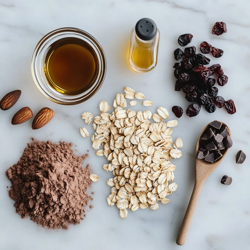 Cocoa powder gives a deep chocolate flavor without added sugar. Maple syrup serves as a natural sweetener, and melted coconut oil adds moisture. Dried cherries bring a sweet and tart taste that pairs well with chocolate. Vanilla extract enhances all the flavors, while sea salt brightens the mix. Finally, dark chocolate chips melt in your mouth and create a delightful finish.