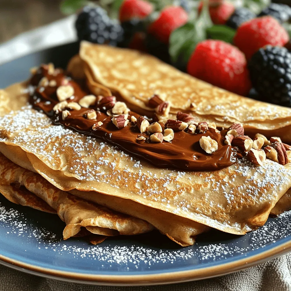 ![- 1 cup all-purpose flour - 2 large eggs - 1 ½ cups milk - 2 tablespoons melted butter - 2 tablespoons sugar - ½ teaspoon vanilla extract - ½ teaspoon salt - ½ cup chocolate hazelnut spread - 1/4 cup roasted hazelnuts, crushed - Powdered sugar for dusting - Fresh berries (optional, for garnish) Finding the right ingredients is key to making great chocolate hazelnut crepes. You can easily find all these items at your local grocery store. I love using fresh eggs and whole milk for the best flavor. The chocolate hazelnut spread is the star of the show, so choose a quality brand that you enjoy. Roasted hazelnuts add a nice crunch, which I recommend for texture. - For all-purpose flour, you can use whole wheat flour or a gluten-free blend. - If you need dairy-free options, almond milk or oat milk works well. Instead of butter, try coconut oil or a vegan butter substitute. - For sugar, use maple syrup or agave nectar as a natural sweetener. These substitutions help you adjust the recipe to fit your needs. The taste may change slightly, but it can still be delicious. Always keep in mind that cooking is about finding what works for you. If you follow the [Full Recipe], you will make a tasty treat that everyone will love! To make the perfect batter, start by mixing the dry and wet ingredients. In one bowl, whisk together the all-purpose flour, sugar, and salt. In another bowl, beat the eggs and mix in the milk, melted butter, and vanilla extract. Slowly add the wet mix to the dry mix. Whisk until the batter is smooth and lump-free. Letting the batter rest is key. This helps the flour absorb the liquid and relaxes the gluten. Rest it for 30 minutes at room temperature. This step makes your crepes more tender and easy to work with. When it’s time to cook, heat a non-stick skillet on medium heat. Lightly grease it with butter. Pour about 1/4 cup of batter into the center of the skillet. Quickly swirl the pan to spread the batter evenly. Aim for a thin layer; this gives you that lovely crepe texture. Cook for 1-2 minutes. You’ll know it’s ready when the edges lift slightly and the bottom turns golden brown. Carefully flip the crepe using a spatula. Cook for another minute on the other side. Stack the crepes on a plate as you cook, keeping them warm. Now for the fun part! Take a cooked crepe and spread a generous tablespoon of chocolate hazelnut spread on one half. Sprinkle some crushed roasted hazelnuts over the spread for crunch. Fold the crepe in half, and then fold it again to form a triangle, or roll it up if you prefer. For serving, dust the filled crepes with powdered sugar. You can also add fresh berries for a colorful touch. Enjoy your delightful chocolate hazelnut crepes! For the complete recipe, check the Full Recipe section. To make light and fluffy crepes, I focus on the batter. Start with room temperature ingredients. This helps the batter mix well. I always let the batter rest for at least 30 minutes. Resting allows the gluten to relax, which makes the crepes tender. When cooking, use a hot pan but not too hot. A medium heat lets the crepes cook evenly without burning. Thin layers of batter are key for fluffiness. Swirl the batter quickly to spread it out. If you have extra batter, store it in the fridge. I recommend using an airtight container. The batter can last up to two days. Before using it again, give it a good stir. If it seems too thick, add a splash of milk. This ensures your crepes stay light and delicious. Yes, you can prep crepes in advance! I often make a batch the night before. Just stack them and cover with plastic wrap. They stay fresh in the fridge. When ready to serve, warm them in a skillet for a minute on each side. This brings back their soft texture. You can also freeze them for later use. Just layer parchment paper between each crepe. This prevents sticking. When you need them, thaw and warm them up. Enjoy your crepes any time with ease! For the complete process, check the Full Recipe. {{image_2}} If you want to skip nuts, you have many tasty options. Try using creamy peanut butter or almond butter instead of chocolate hazelnut spread. You can also use fruit spreads like raspberry or strawberry for a sweet twist. Another idea is to fill the crepes with whipped cream and fresh fruit. This makes a light and fun dessert. You can make your crepes even more special by adding flavors to the batter. For a vanilla touch, mix in an extra half teaspoon of vanilla extract. If you love citrus, add the zest of a lemon or orange. This gives a bright flavor that pairs well with chocolate. You can also try spices like cinnamon or nutmeg for warmth. Just a pinch can change the whole taste! Feeling adventurous? You can turn these sweet crepes into savory dishes. Start with the same batter but leave out the sugar. Then, fill them with cheese, spinach, or mushrooms. A bit of cooked chicken or ham also works great. Top with a light sauce or just some herbs for a delicious meal. These savory options are perfect for lunch or dinner. Explore these variations, and make your chocolate hazelnut crepes even more fun! For the full recipe, check out the complete guide. To keep cooked crepes fresh, stack them on a plate. Place a piece of wax paper between each crepe. This method prevents sticking and helps maintain texture. Cover the stack with plastic wrap or foil. Store in the fridge for up to three days. If you want them warm later, gently reheat them in a pan. Freezing crepes is a great way to save them for later. First, let the crepes cool completely. Then, stack them with wax paper in between. Wrap the stack tightly in plastic wrap and then place it in a freezer bag. Make sure to squeeze out any air to avoid freezer burn. When you're ready to enjoy them, simply thaw them in the fridge overnight. Reheat in a pan over low heat for the best taste. Cooked crepes last about three days in the fridge. If you freeze them, they can last up to two months. After that, the flavor and tex