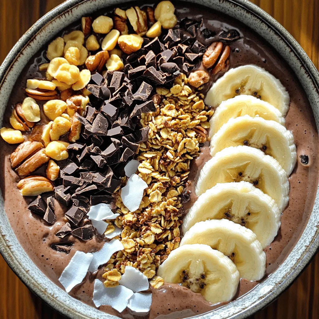 Pour your smooth mix into a bowl. Use a spatula to smooth the surface. Now comes the fun part—adding toppings! Start with sliced bananas on top. Then sprinkle on chopped nuts and granola for a crunch. Add some coconut flakes for a tropical twist. Finish it off with dark chocolate shavings. This makes your smoothie bowl look beautiful and tasty. Enjoy your delicious creation right away!