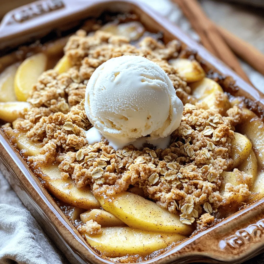 - Apples: You need 4 large apples. A mix of Granny Smith and Fuji works best. - Sweeteners: Use 1/2 cup brown sugar and 1/3 cup granulated sugar. - Spices: You will need 1 teaspoon ground cinnamon and 1/4 teaspoon nutmeg. - Dry Ingredients: Gather 1/2 cup rolled oats, 1/2 cup all-purpose flour, and 1/4 teaspoon salt. - Butter: Use 1/4 cup cold butter, cut into small cubes. - Optional toppings: Serve with vanilla ice cream or whipped cream for a treat. This list includes all the essentials to make your cinnamon apple crumble delightful. The combination of tart and sweet apples balances the flavors. The spices bring warmth and comfort to the dish. The oats and butter create a crunchy topping. You can make this dessert even more special with a scoop of ice cream or a dollop of whipped cream. Enjoy the sweet aroma of cinnamon as you prepare this dish! First, you need to prepare the apples. Get four large apples. I love using a mix of Granny Smith and Fuji apples for the best taste. Start by peeling, coring, and slicing each apple into thin pieces. This helps them cook evenly. Next, place the sliced apples in a large bowl. Add one tablespoon of lemon juice. This keeps the apples fresh and bright. Sprinkle in half a cup of brown sugar, one teaspoon of ground cinnamon, and a quarter teaspoon of nutmeg. Mix everything together until the apples are well coated. Set this bowl aside for now. Now, let’s make the crumble topping. In another bowl, combine half a cup of rolled oats, half a cup of all-purpose flour, one-third cup of granulated sugar, and a quarter teaspoon of salt. Mix these dry ingredients well. Next, take a quarter cup of cold butter and cut it into small cubes. Add the butter to the dry mixture. Use your fingers or a pastry cutter to work the butter into the mix. You want it to look like coarse crumbs. This will create a crunchy topping. It’s time to put everything together! Grease a 9x9 inch baking dish. Spread the apple mixture evenly across the bottom of the dish. Make sure the apples are in a nice, even layer. Now, sprinkle the oat crumble topping over the apples. Cover them generously so that every bite will be delicious. Preheat your oven to 350°F (175°C) and bake for 30 to 35 minutes. You will know it's done when the apples are bubbling and the topping is golden brown. Once baked, take it out and let it cool for a few minutes. This makes it easier to serve. Enjoy your warm cinnamon apple crumble! To get the best crumble, start with your butter. Use cold butter, as it helps create that flaky texture. Cut the butter into small cubes before mixing it with the dry ingredients. This way, you’ll get nice, crumbly bits rather than a paste. For apples, I like a mix of Granny Smith and Fuji. The tartness of Granny Smith balances well with the sweetness of Fuji. When it comes to serving, I prefer vanilla ice cream. The cold ice cream melts into the warm crumble, creating a great mix. Whipped cream is also a good choice if you want something lighter. For presentation, sprinkle a bit of cinnamon on top. You can also add a few thin apple slices for color and texture. If your topping turns out soggy, check your butter. Too much moisture can cause this problem. You can try baking it a bit longer to help it crisp up. For sweetness, taste the apple mixture before baking. If you find it too sweet, add a little lemon juice to balance it out. Adjusting sweetness keeps your flavors in check. {{image_2}} You can make this crumble gluten-free. Just swap the all-purpose flour with almond flour or gluten-free all-purpose flour. For oats, look for certified gluten-free oats. This way, everyone can enjoy this dessert! To make this crumble vegan, replace the butter with coconut oil or a plant-based butter. You can also add a scoop of dairy-free ice cream or coconut whipped cream on top. These swaps keep the dessert rich and tasty. Get creative with flavors! Add chopped nuts like walnuts or pecans for crunch. Dried fruits like raisins or cranberries also work well. For a twist, try adding a pinch of cardamom or ginger with the cinnamon. These options can give your crumble a unique taste every time! To store leftovers, let the crumble cool first. Cover it with plastic wrap or foil. Place it in the fridge. It will stay fresh for about 3 to 5 days. When you want to eat it, just warm it in the oven. This keeps the topping nice and crispy. For freezing, let the crumble cool completely. Then, slice it into portions. Wrap each piece tightly in plastic wrap. Place the wrapped pieces in a freezer bag. Squeeze out the air before sealing. The crumble can last in the freezer for about 3 months. To reheat, take a slice out and let it thaw in the fridge overnight. You can warm it in the oven at 350°F (175°C) for about 15 minutes. This way, you keep that perfect crumble texture. In the fridge, the crumble lasts about 3 to 5 days. If you freeze it, it stays fresh for about 3 months. Always check for any signs of spoilage. If it looks or smells off, it’s better to discard it. Enjoy your cinnamon apple crumble at its best! Yes, you can use frozen apples. However, you need to thaw them first. Thawing helps avoid excess moisture. This prevents a soggy crumble. Once thawed, drain any extra juice. This keeps the texture nice and firm. If you do not drain them, the filling may be too runny. Yes, you can prepare this dish ahead of time. You can slice the apples and mix them with the spices. Place them in the baking dish. Cover and store them in the fridge for one day. You can also make the crumble topping ahead. Just keep it in the fridge as well. When ready, layer the topping on the apples and bake. This saves time and makes it easy for busy days. I recommend using a mix of tart and sweet apples. Granny Smith apples add a nice tartness. Fuji apples bring sweetness to the mix. Other great options include Honeycrisp and Braeburn. Mixing different types gives the best flavors. The sweet-tart balance creates a delightfu