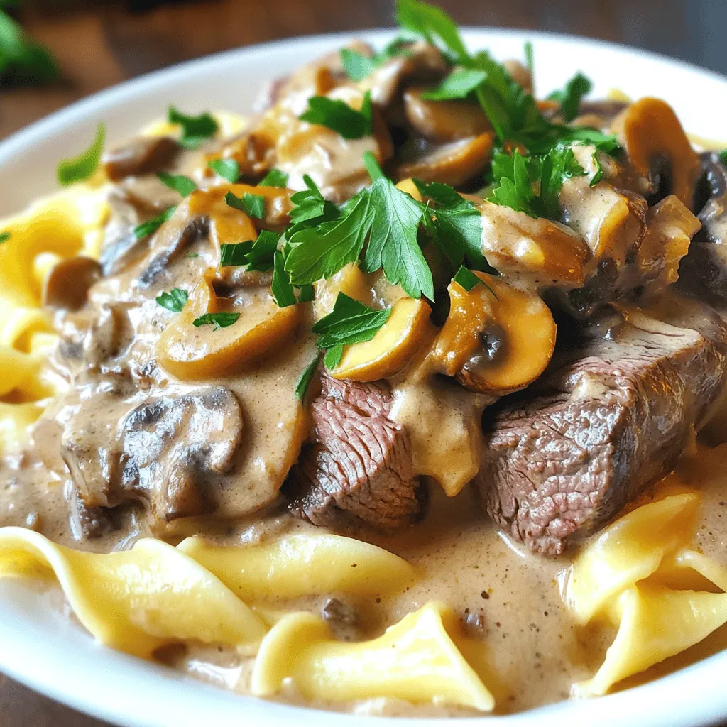 - 1 lb (450g) beef sirloin, sliced into thin strips - 2 tablespoons olive oil - 1 onion, finely chopped - 2 cloves garlic, minced For Classic Beef Stroganoff, we start with fresh beef sirloin. This cut gives the dish its rich flavor and tender texture. I like to slice it thin, which helps it cook quickly and evenly. Olive oil is your best friend here. It adds a nice richness as you sear the beef. Next, we need onion and garlic. These two ingredients build a solid flavor base. I chop the onion finely and mince the garlic. This way, they blend well into the dish. - 8 oz (225g) mushrooms, sliced - 1 cup beef broth - 1 tablespoon Dijon mustard - 1 cup sour cream Mushrooms are key for that earthy taste. I prefer sliced button mushrooms, but you can use any kind! Beef broth adds depth, making the sauce hearty. Dijon mustard gives a nice tang, balancing the creaminess of sour cream. This ingredient is a must for the classic flavor. - Cooked egg noodles - Fresh parsley I love serving this dish over egg noodles. They soak up the sauce nicely and add a comforting touch. Lastly, don’t forget the fresh parsley! A sprinkle of it adds color and a hint of freshness. For the full recipe and detailed steps, check out the Full Recipe. How to sear beef properly To sear the beef, heat olive oil in a large skillet on medium-high heat. Once hot, add the sliced beef. Cook for about 4-5 minutes until it is browned on all sides. This step locks in the flavor and keeps the beef juicy. Remove the beef from the skillet and set it aside. Sautéing onions and garlic In the same skillet, add the chopped onion and minced garlic. Stir them around for about 3-4 minutes. You want the onion to become soft and clear. This adds a nice base flavor to your dish. Combining flour and mushrooms Next, add the sliced mushrooms to the skillet. Cook them for about 5-7 minutes until they turn golden brown. Then, sprinkle flour over the mushroom mix and stir it well. This helps thicken your sauce. Adding broth and finishing the sauce Slowly pour in the beef broth while stirring constantly. This prevents lumps from forming. Bring the mixture to a simmer and let it thicken for about 3-4 minutes. Stir in Dijon mustard and Worcestershire sauce for extra flavor. Adding sour cream and seasoning Turn down the heat and add the sour cream. Mix it in until smooth. Return the seared beef to the skillet and stir to coat it in the sauce. Season with salt and pepper to taste. Garnishing and serving Let the stroganoff heat through for another 2-3 minutes. Now it's ready! Serve it over cooked egg noodles and garnish with fresh parsley. Enjoy a warm bowl of comfort with this creamy beef stroganoff. For the complete recipe, check out the Full Recipe section. - Achieving the right steak doneness: Use beef sirloin for the best flavor. Cook it over medium-high heat. You want it browned on the outside but still juicy inside. Aim for medium-rare to medium. This keeps the meat tender. - How to thicken your sauce without lumps: After cooking the mushrooms, sprinkle flour over the mix. Stir it well before adding broth. Slowly pour in the beef broth while stirring. This helps avoid lumps and makes your sauce smooth. - Prepping ingredients in advance: Cut your beef, onions, and mushrooms before cooking. This cuts down on cooking time. You can even do this the night before. Store them in the fridge until you are ready. - One-pan cooking to minimize cleanup: Use the same skillet for the whole dish. Start with your beef, then add onions, garlic, and mushrooms. This saves time and means fewer dishes to wash. - Creative ways to serve and present your dish: Serve stroganoff over egg noodles on a large plate. Add a sprinkle of fresh parsley for color. You can also serve it in individual bowls. This makes it look fancy and inviting. Presenting it well makes your meal even more enjoyable. For the full recipe, check out the details above. {{image_2}} You can change up the cut of meat in your stroganoff. Tenderloin adds a rich flavor and melts in your mouth. Ground beef is a great choice too if you want a quicker meal. Both options work well and taste amazing. You can also try different sauces. For a creamy base, use mushroom soup instead of sour cream. If you prefer plant-based options, there are great vegan sauces available. These alternatives can give your dish a new twist. If you need a gluten-free version, there are simple swaps. Use gluten-free flour and noodles. Many brands make tasty gluten-free pasta that works great with stroganoff. For a dairy-free twist, you can use coconut cream or cashew cream. Both options give a nice creamy texture without dairy. You won’t miss the sour cream at all! To make your stroganoff even tastier, add more herbs and spices. Fresh thyme or a touch of paprika can make a big difference. They add depth and warmth to the dish. You can also include vegetables like bell peppers or peas. These add color and nutrition to your meal. They blend well with the beef and sauce, making every bite delightful. For the full recipe and more details, check out the Full Recipe. To store leftovers safely, let the stroganoff cool down first. Place it in an airtight container. This keeps it fresh and tasty. Try to use containers that are freezer-safe if you plan to freeze it. Glass or heavy-duty plastic containers work well. Avoid using metal containers as they can react with the food. Reheating is easy if you do it right. You can use a microwave or stovetop. For the microwave, heat in short bursts. Stir the stroganoff in between to ensure even warming. If using the stovetop, add a splash of broth or water to keep it creamy. Stir it gently over low heat. This keeps the sauce smooth and prevents it from breaking. Classic Beef Stroganoff lasts about 3 to 4 days in the fridge. Keep it sealed tightly for best results. If you freeze it, it can last up to 3 months. Look for signs of spoilage, such as a sour smell or changes in color. If it looks off or smells b