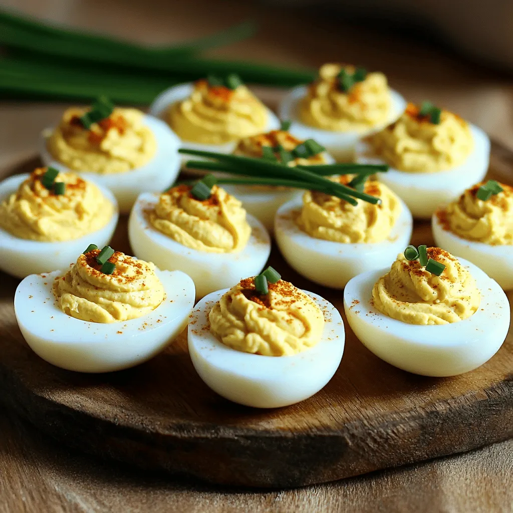 ![- 6 large eggs - 3 tablespoons mayonnaise - 1 teaspoon Dijon mustard - 1 teaspoon apple cider vinegar - ½ teaspoon garlic powder - Salt and pepper to taste - Paprika, for garnish - Fresh chives or parsley, chopped (for garnish) To make classic deviled eggs, you need simple and fresh ingredients. Start with six large eggs. They are the star of this dish. For creaminess, use three tablespoons of mayonnaise. The Dijon mustard adds a nice tang, so include one teaspoon of it. Apple cider vinegar gives a slight kick, so don’t skip the teaspoon of it. Garlic powder adds flavor, so just a half teaspoon will do. You will also need salt and pepper to taste. Use paprika to sprinkle on top for color and flavor. Lastly, fresh chives or parsley will add a nice touch. With these ingredients, you can create a tasty and classic snack. Check the [Full Recipe] for more details! To boil eggs perfectly, start by placing them in a pot. Add cold water until the eggs are covered. Heat the pot on medium until the water boils. Once it boils, cover the pot and take it off the heat. Let the eggs sit for 12 minutes. This method produces firm yolks without overcooking. An ice bath is key. It stops cooking and makes peeling easy. After 12 minutes, put the eggs in a bowl of ice water for at least 5 minutes. This method cools the eggs down quickly. For easy peeling, tap each egg gently on a hard surface. Peel them under running water to help remove the shells smoothly. Cut each peeled egg in half lengthwise. Carefully take out the yolks and place them in a bowl. Use a fork to mash the yolks until they are crumbly. Then, add mayonnaise, Dijon mustard, apple cider vinegar, garlic powder, salt, and pepper. Mix until smooth and creamy. The right texture is key for great taste. When filling the egg whites, you can use a spoon or a piping bag. A piping bag gives a nice look and is easier for precise filling. If you use a spoon, be generous with the yolk mixture. Fill each white until it overflows slightly. This makes them look inviting and delicious. Garnishes add color and flavor. Lightly sprinkle paprika over each filled egg for a classic touch. You can also top them with fresh chives or parsley for a pop of color. This step makes your deviled eggs not just tasty but also beautiful. A good presentation impresses everyone! To make perfect deviled eggs, avoid common mistakes. First, do not overcook the eggs. Overcooked eggs become green around the yolk. Stick to the 12-minute rule. Second, make sure to cool the eggs quickly. An ice bath helps stop the cooking. This also makes peeling easier. Adjusting the flavor is key. If you like a tangy taste, add more vinegar or mustard. For a creamier texture, increase the mayonnaise. Taste the filling as you mix. This helps you find the flavor you love. Deviled eggs shine at many occasions. They are perfect for picnics, parties, and holidays. People love them at brunch. You can serve them at any gathering. Pair deviled eggs with other appetizers. They go well with fresh veggies and dips. You can also serve them with crackers or cheese. This makes a great spread for guests. For more ideas, check out the Full Recipe. {{image_2}} Deviled eggs can be simple or fancy. The classic recipe uses basic ingredients. You can add unique flavors for a gourmet twist. Try adding crispy bacon bits for a savory crunch. Avocado adds creaminess and a fresh taste. You can also mix in jalapeños for heat or herbs for brightness. Each addition gives a new flavor to the dish. Regional variations exist too. In the Southern U.S., you might find deviled eggs with sweet pickle relish. In some Mexican recipes, you may see salsa mixed in. These changes reflect local tastes and traditions. You can make deviled eggs to fit different diets. To make them vegetarian, simply use the classic recipe without any meat. For a vegan version, swap mayonnaise for avocado or vegan mayo. This keeps the creamy texture while making it plant-based. If you need gluten-free options, rest assured. The classic deviled eggs are naturally gluten-free. Just make sure any added ingredients are also gluten-free. This way, everyone can enjoy this tasty treat! To keep deviled eggs fresh, store them in the fridge. Place them in an airtight container. This helps prevent them from drying out. If you have leftover filling, store it separately. Cover both the eggs and the filling with plastic wrap. Enjoy them within three days for the best taste. Can you freeze deviled eggs? No, freezing them can change their texture. The filling can become watery and grainy. However, you can freeze the egg yolk mixture before filling. To reheat, thaw it in the fridge overnight. Then, fill the egg whites when ready to serve. This keeps your deviled eggs fresh and tasty. For more details on making these delicious bites, check out the Full Recipe. Deviled eggs stay fresh for about three to five days in the fridge. To keep them safe, store them in an airtight container. This helps prevent them from absorbing other food smells. Yes, you can make deviled eggs a day in advance. Prepare the filling and store it separately from the egg whites. This keeps the whites firm and prevents them from getting soggy. If you want a lighter option, try Greek yogurt. It adds creaminess and a slight tang. You can also use avocado for a creamy texture without eggs. To fix runny filling, add more yolks or a little cornstarch. Mix well until the texture is thicker. You can also add more mayonnaise or Greek yogurt to balance it. No, it is not safe to eat deviled eggs left out for more than two hours. Bacteria can grow quickly, so always keep them refrigerated until serving. For more detailed steps, check the [Full Recipe]. You now have all the steps to make perfect deviled eggs. From boiling the eggs to creating a tasty filling, every process is clear. Remember to personalize your eggs with your favorite flavors and garnishes. These tips will help you avoid mistakes and impress your gues