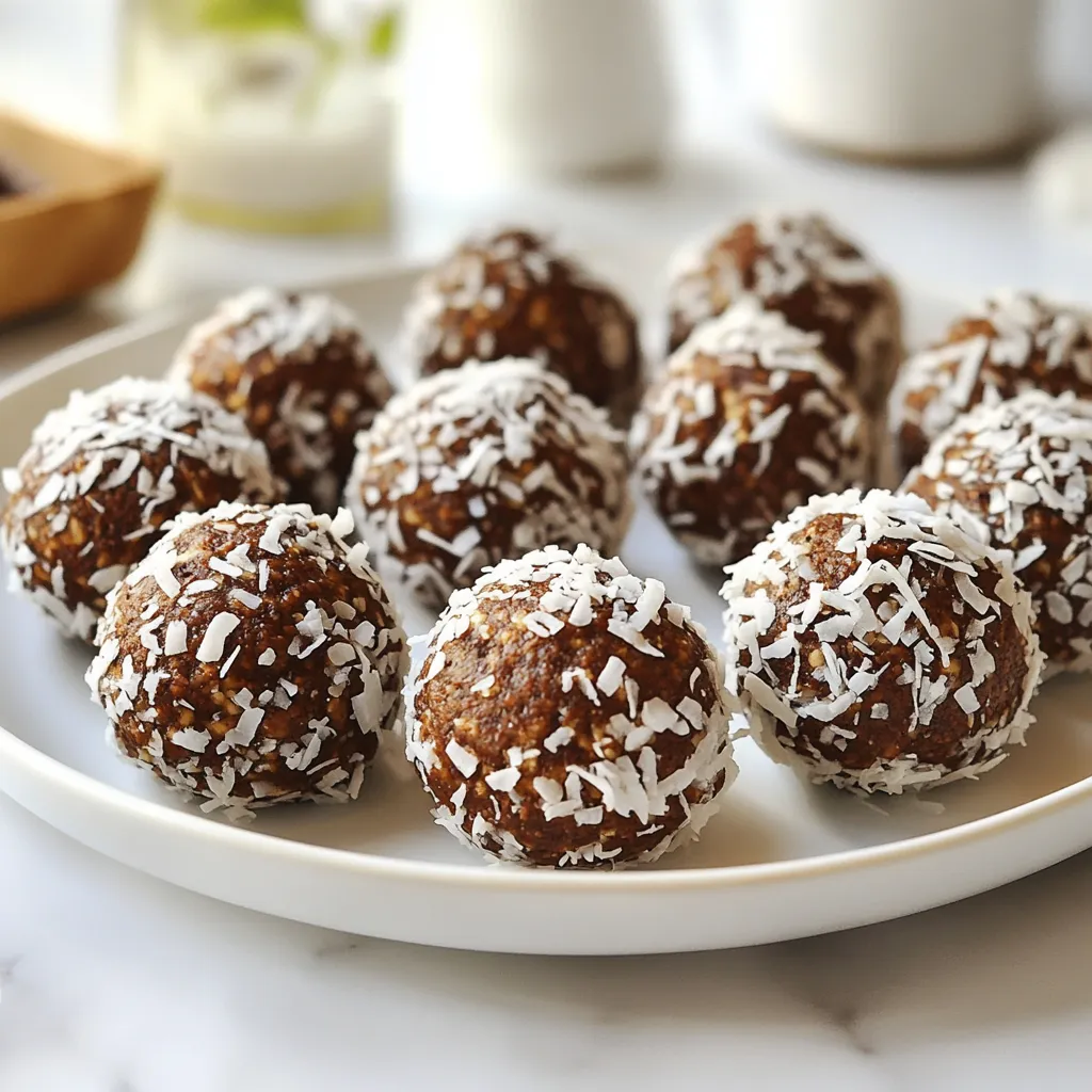 These ingredients come together to create a tasty and healthy snack. Pitted dates serve as a natural sweetener. They give the bites a chewy texture. Rolled oats add fiber, making these bites filling. Unsweetened shredded coconut gives a tropical twist and nice crunch. Nut butter, like almond butter, adds creaminess and protein. Cocoa powder brings rich chocolate flavor without extra sugar. Chia seeds pack in omega-3 fatty acids and protein. Vanilla extract enhances the overall taste. A pinch of sea salt balances the sweetness. Finally, the extra shredded coconut coats the bites for a fun finish.