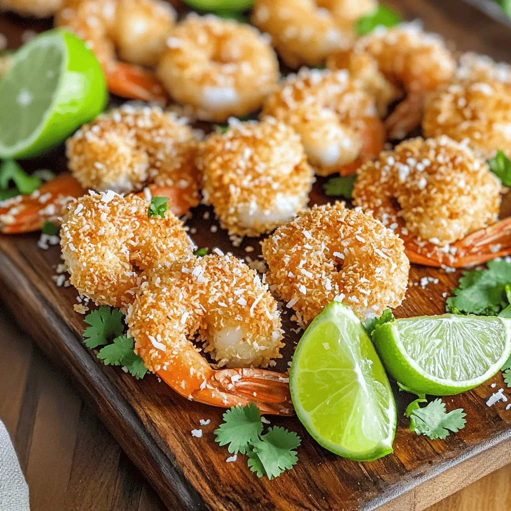 To make coconut crusted shrimp, gather these fresh ingredients: - 1 lb large shrimp, peeled and deveined - 1 cup all-purpose flour - 2 large eggs - 1 cup shredded coconut (sweetened or unsweetened) - 1 cup breadcrumbs (panko for extra crunch) - 1 teaspoon garlic powder - 1 teaspoon paprika - Salt and pepper to taste - Vegetable oil for frying - Fresh lime wedges for serving - Optional: cilantro for garnish You can adjust some ingredients if needed. Here are some great swaps: - Use almond flour instead of all-purpose flour for a gluten-free option. - Replace eggs with a flaxseed mixture for a vegan choice. - Try unsweetened coconut for a less sweet flavor. - If you do not have panko, regular breadcrumbs work too. Choosing fresh shrimp is key for great taste. Look for these signs: - Choose shrimp that smell clean and mild, not fishy. - Check for firm flesh and a shiny appearance. - Avoid shrimp with black spots or a dull look. - If buying frozen, ensure they are solid and not clumped together. By following these tips, you will have the best ingredients for coconut crusted shrimp. For the full recipe, be sure to check the details above. First, you need to prepare the shrimp. Take 1 pound of large shrimp, peeled and deveined. Pat them dry with paper towels. This helps the breading stick better. Next, season the shrimp lightly with salt, pepper, and 1 teaspoon of garlic powder. This mix adds a nice flavor. Now, let’s set up the breading station. You need three separate bowls. In the first bowl, place 1 cup of all-purpose flour. In the second bowl, beat 2 large eggs until mixed well. In the third bowl, combine 1 cup of shredded coconut with 1 cup of breadcrumbs. Panko breadcrumbs give extra crunch. With the shrimp ready and the breading station set, it’s time to fry. Heat about 1/4 inch of vegetable oil in a large skillet over medium-high heat. The oil should be hot but not smoking. To test it, drop in a small piece of bread. If it sizzles, you’re good to go. Carefully place the coated shrimp in the hot oil. Do this in batches to avoid overcrowding. Fry each shrimp for about 2-3 minutes on each side until golden brown. Once done, use a slotted spoon to remove the shrimp and place them on a plate lined with paper towels. This will help drain excess oil. Now your coconut-crusted shrimp is ready to enjoy! For the full recipe, check the complete details above. To get that crunchy bite, use panko breadcrumbs. They add a light and airy feel. Make sure your oil is hot before frying. If it is not hot enough, the shrimp will soak up oil. Fry the shrimp in small batches. This keeps the oil temperature steady and ensures even cooking. After frying, place the shrimp on paper towels to absorb extra oil. This step keeps them crispy. One common mistake is not drying the shrimp. Wet shrimp won't hold the coating well. Another error is overcrowding the pan. This can lower the oil's temperature, leading to soggy shrimp. Ensure you use enough oil for frying. If you skimp on the oil, the shrimp may not cook evenly. Finally, don’t skip the seasoning. Salt and pepper enhance the shrimp's flavor greatly. Serve your shrimp with fresh lime wedges. The lime juice brightens the flavors. You can also pair it with a sweet dipping sauce, like a mango salsa or sweet chili sauce. These add a nice fruity touch. For a colorful plate, add a side salad with fresh greens. You can find the full recipe for Coconut Crusted Shrimp in this article. Enjoy your cooking! {{image_2}} You can swap shrimp for other proteins. Try chicken, fish, or even tofu. Each option brings its own flavor. For chicken, cut it into strips. For fish, use firm types like cod or halibut. Tofu works great for a vegetarian twist. Adjust cooking times based on protein choice. Chicken may need longer, while fish cooks quicker. Enjoy the same crispy coconut coating with these variations! Frying gives a crispy texture, but baking is lighter. When baking, use a little oil to help the coating crisp up. Preheat the oven to 400°F (200°C). Place the shrimp on a lined baking sheet. Bake for about 15-20 minutes, flipping halfway through. You will still get a tasty treat. It helps to use panko breadcrumbs for extra crunch when baking. You can spice up your coconut crust! Add garlic powder, paprika, or cayenne for heat. You could also mix herbs like cilantro or parsley into the coconut. Try lime zest for a bright twist. A touch of curry powder gives an exotic flair. Experiment with what you enjoy. These simple changes can turn a good dish into something truly special. For more ideas, check the Full Recipe. To keep your coconut crusted shrimp fresh, store them in the fridge. Place the shrimp in an airtight container. This helps to lock in moisture and flavor. Refrigerate them for up to two days. If you have leftovers, try to cool them down first. This keeps them from steaming and getting soggy. You can also freeze coconut crusted shrimp for later. Let them cool completely before freezing. Arrange the shrimp on a baking sheet in a single layer. Place the sheet in the freezer for about an hour. This prevents them from sticking together. Once frozen, transfer the shrimp to a freezer bag. They can stay good for up to three months. To reheat your shrimp, avoid the microwave. This can make them rubbery. Instead, use an oven or skillet for the best results. Preheat your oven to 375°F (190°C). Place the shrimp on a baking sheet and heat for about 10 minutes. If using a skillet, add a little oil and heat on medium until warm. This helps to keep them crispy and delicious. You can find the full recipe for these delightful bites in the earlier sections of this article. The best shrimp for this recipe is large, fresh shrimp. Look for shrimp labeled as 16/20 count. This means there are 16 to 20 shrimp per pound. Fresh or frozen shrimp both work well, but fresh often tastes better. Always choose shrimp that is firm and smells like the ocean. Avoid shrimp that smells strong or h