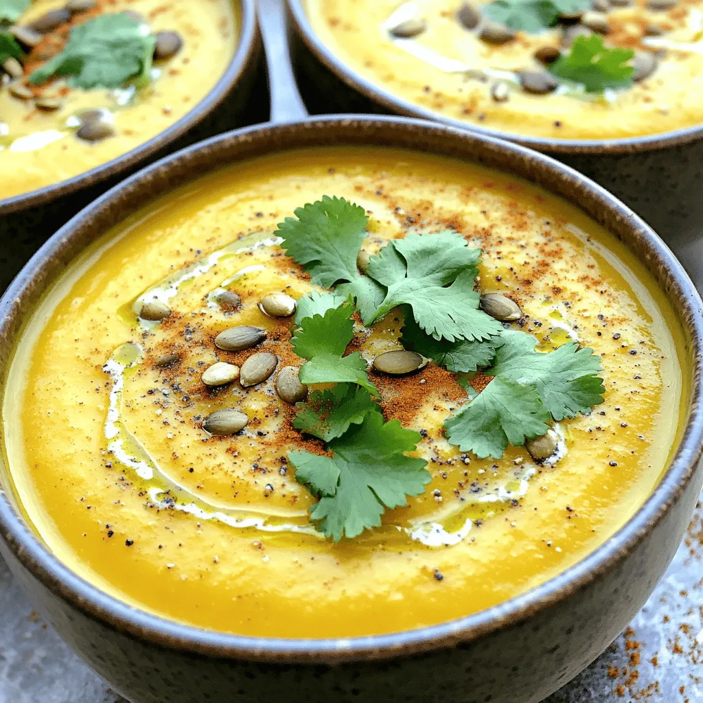 To make this delicious soup, gather these fresh ingredients: - 1 medium butternut squash, peeled, seeded, and diced (about 4 cups) - 1 tablespoon coconut oil - 1 medium onion, chopped - 3 cloves garlic, minced - 1 tablespoon fresh ginger, grated - 1 tablespoon red curry paste (adjust according to spice preference) - 1 can (400ml) coconut milk - 4 cups vegetable broth - 1 tablespoon brown sugar (or maple syrup) - Salt and pepper, to taste - Juice of 1 lime - Fresh cilantro, for garnish - Toasted pumpkin seeds, for garnish Sometimes, you may not have all the ingredients on hand. Here are some easy swaps: - Butternut squash: Use pumpkin or sweet potato as alternatives. - Coconut oil: Olive oil or avocado oil can work well for sautéing. - Red curry paste: Try yellow curry paste or a mix of spices like cumin and turmeric. - Coconut milk: Almond milk or cashew cream can be used for a lighter version. This soup is not just tasty; it's packed with nutrients: - Butternut squash is high in vitamins A and C, aiding vision and boosting immunity. - Coconut milk provides healthy fats, which may improve heart health. - Ginger has anti-inflammatory properties and can help with digestion. - Garlic and onion are great for overall health, offering immune support. Enjoy this Coconut Curry Butternut Squash Soup knowing it’s both delightful and nutritious! For the full recipe, check out the recipe details. 1. Sauté Aromatics: In your large pot, heat 1 tablespoon of coconut oil over medium heat. Add the chopped onion and sauté it for about 5 minutes. The onion should turn translucent. Then, stir in 3 cloves of minced garlic and 1 tablespoon of grated ginger. Cook this mix for another 1-2 minutes until it smells amazing. 2. Add Squash and Curry Paste: Now, mix in 1 tablespoon of red curry paste. This adds a nice kick! Next, add the diced butternut squash, about 4 cups. Stir well to coat the squash with the spices. 3. Simmer with Coconut: Pour in 4 cups of vegetable broth and 1 can (400ml) of coconut milk. Bring this mixture to a gentle boil. Once boiling, reduce the heat to low. Cover the pot and let it simmer for about 20-25 minutes. The squash should be soft when done. 4. Blend the Soup: Carefully remove the pot from the heat. Use an immersion blender to puree the soup until it is smooth. If you don’t have one, you can pour the soup into a countertop blender in batches. Blend until it looks creamy. 5. Season and Adjust: Return the pureed soup to low heat. Stir in 1 tablespoon of brown sugar or maple syrup, along with the juice of 1 lime. Add salt and pepper to taste. Let it warm for a few minutes. 6. Serve and Garnish: Finally, ladle the soup into bowls. Garnish each bowl with fresh cilantro and a sprinkle of toasted pumpkin seeds for a tasty crunch. - Ensure the butternut squash is soft before blending. This helps achieve that velvety texture. - Blend in small batches if using a countertop blender. This prevents spills and makes blending easier. - If the soup is too thick, add a splash of vegetable broth or coconut milk to thin it out. - Large Pot: Use this for sautéing and simmering the soup. - Immersion Blender: This tool makes blending easy and keeps things simple. - Cutting Board and Knife: These are essential for chopping your veggies. - Measuring Cups and Spoons: Accurate measurements are key to great taste. If you want to dive deeper into the details, check the Full Recipe for precise measurements and additional insights! To make your Coconut Curry Butternut Squash Soup burst with flavor, focus on your base. Start with fresh onion, garlic, and ginger. Sauté these until they release their sweet aroma. This builds depth in your soup. Use good quality coconut milk for creaminess. Always taste as you cook. Adjust flavors by adding lime juice or sugar. This balance creates a layered taste. Spice can make or break your soup. If you love heat, add more red curry paste. Start with one tablespoon and taste. If you want it milder, reduce the paste by half. You can also add a dollop of yogurt at the end to cool it down. Remember, the soup will warm in the bowl, so aim for a balanced heat level. Serve the soup warm in a bowl. Add fresh cilantro and toasted pumpkin seeds on top. This adds a nice crunch. Pair it with crusty bread or a simple salad. For an extra touch, serve with lime wedges. The citrus brightens the dish. Enjoy this soup as a starter or main dish. For the full recipe, click here. {{image_2}} You can easily switch some ingredients to fit your needs. If you want to cut carbs, use cauliflower instead of butternut squash. For a nutty flavor, try adding tahini. If you like a creamier taste, use cashew cream instead of coconut milk. You can also mix in other veggies like carrots or sweet potatoes for more nutrition and taste. Feel free to get creative with spices! If you want more heat, add chili flakes or fresh chilies. For a smoky taste, sprinkle in some smoked paprika. You can also try other curry pastes like green curry for a different twist. Herbs like basil or mint can bring a fresh taste, too. These small changes can make a big difference in flavor. This soup is mostly vegan and gluten-free, but double-check your ingredients. Use vegetable broth to keep it vegan. Make sure your curry paste is gluten-free; some brands add wheat. If you want a richer flavor, add more coconut milk. This soup is already plant-based, so it's perfect for anyone looking for a healthy meal. For more options, check the Full Recipe for details. After making your coconut curry butternut squash soup, let it cool to room temperature. Pour it into airtight containers. This keeps it fresh and tasty. Store the soup in the fridge if you plan to eat it within a week. If you need more time, freezing is the way to go. To freeze the soup, use freezer-safe containers. Leave some space at the top for expansion. This soup can last up to three months in the freezer. When ready to eat, take it out and let it thaw in the fridge ove