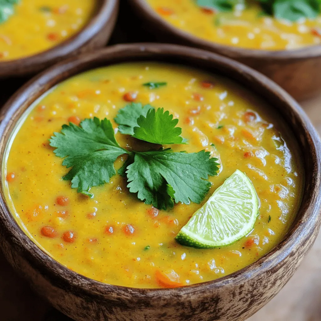 After cooking, stir in 1 tablespoon of soy sauce or tamari and 1 tablespoon of lime juice. Taste the soup and add salt and pepper as needed. For a creamier soup, use an immersion blender to blend part of it. If you prefer texture, mash some lentils with a fork right in the pot. Ladle the soup into bowls, and garnish with fresh cilantro. Enjoy your warm and cozy coconut curry lentil soup!