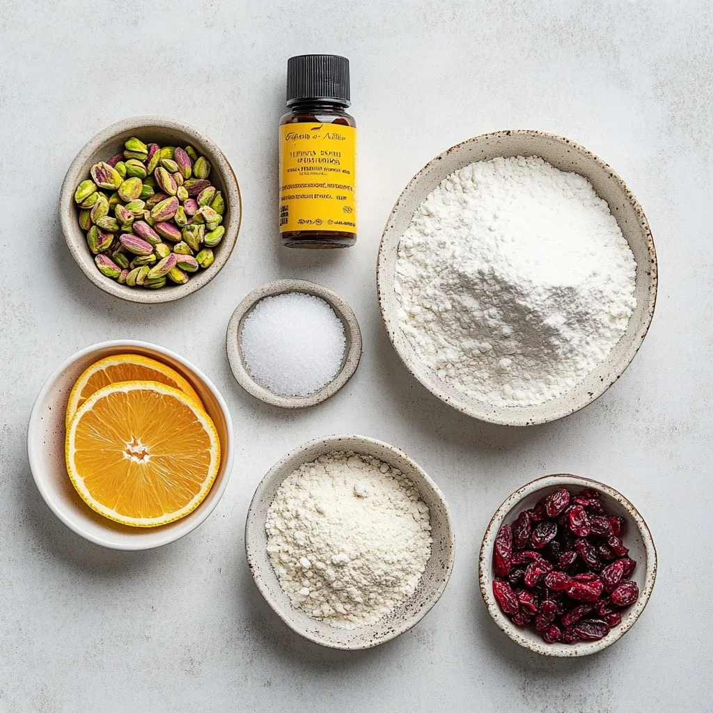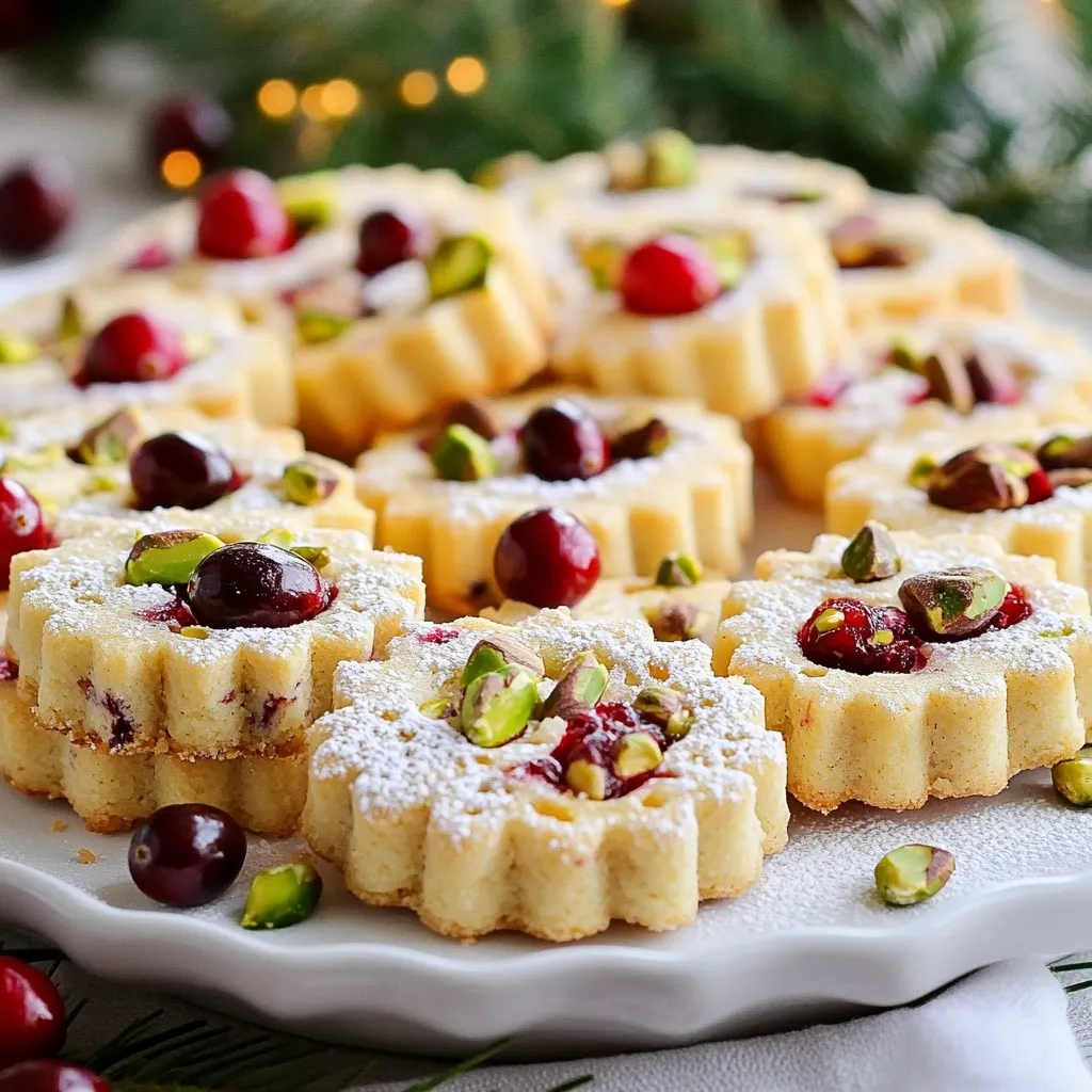 I love using simple, fresh ingredients for my Cranberry Pistachio Shortbread. First, I start with unsalted butter. It gives the best flavor and texture. Next, I mix in powdered sugar. This helps create that melt-in-your-mouth feel. I also add vanilla extract for a lovely aroma.