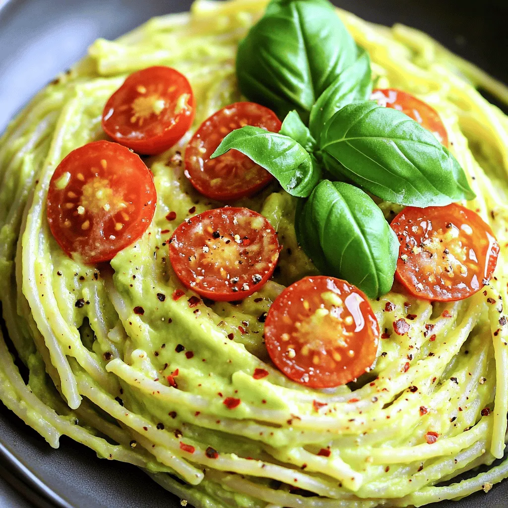 For garnishes, cherry tomatoes bring a pop of color. Crushed red pepper flakes add a spicy kick. This combination of flavors makes every plate of creamy avocado pasta fresh and enjoyable.