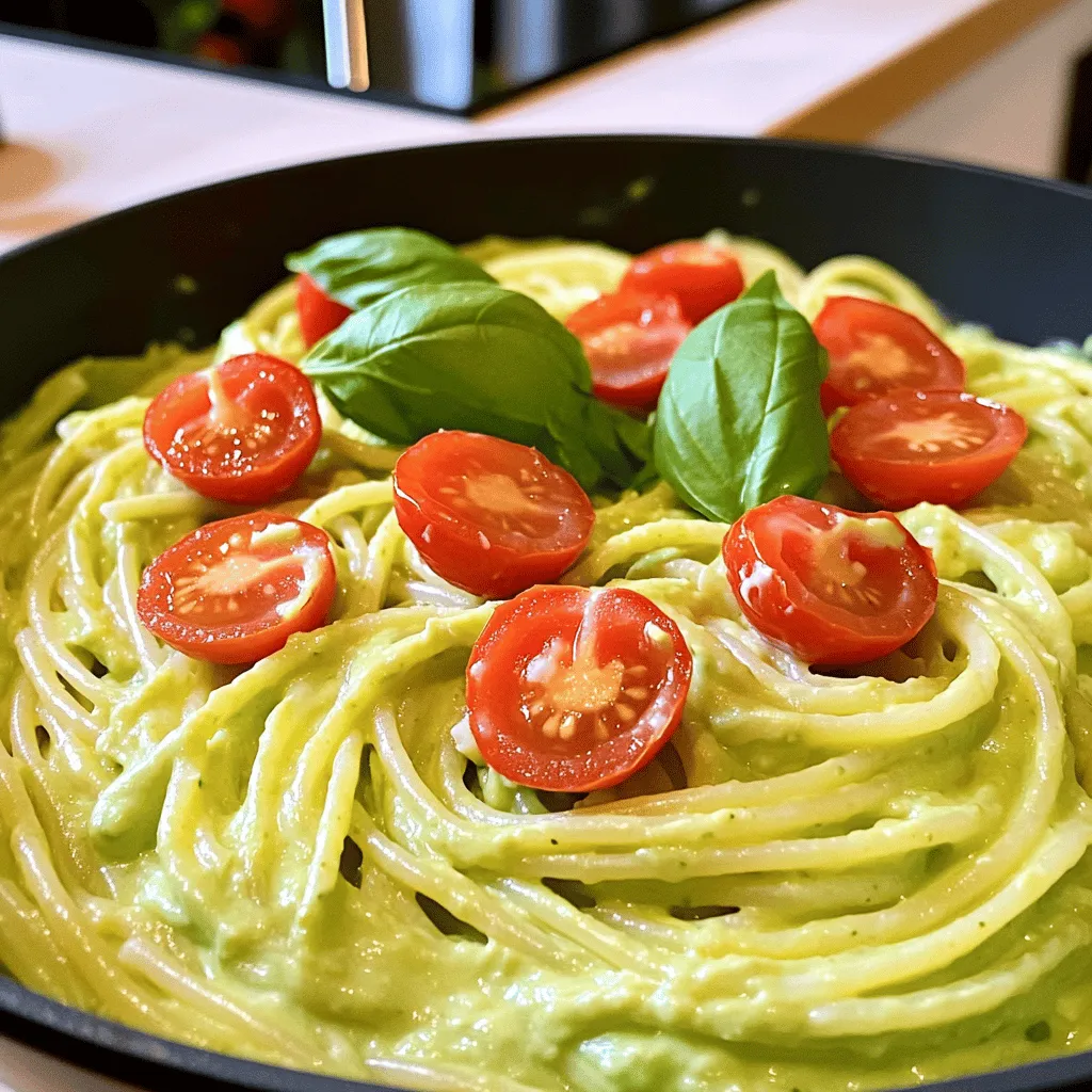 ![To make creamy avocado pasta, gather these key ingredients: - 2 ripe avocados - 300g pasta (spaghetti or fettuccine) - 2 cloves garlic, minced - 1/4 cup fresh basil leaves - 1/4 cup Greek yogurt - 2 tablespoons lemon juice - 1/4 cup extra virgin olive oil - Salt and pepper to taste These ingredients blend well to create a smooth and rich sauce. The avocados provide creaminess, while garlic and basil add flavor. The Greek yogurt gives a slight tang that balances the dish. For an extra pop of color and taste, consider these toppings: - Cherry tomatoes, halved - Additional basil leaves You can also add protein like chicken or shrimp for a heartier meal. These garnishes not only enhance the look but also add freshness. This creamy avocado pasta is not just tasty; it's nutritious too. Each serving contains: - Calories: Approx. 480 - Protein: 12g - Carbohydrates: 60g - Fats: 24g This dish offers healthy fats from avocados and olive oil, making it a good choice for a filling meal. You can find the full recipe below to whip this up quickly for lunch or dinner. Start by boiling a large pot of salted water. Once it boils, add 300g of pasta, like spaghetti or fettuccine. Cook it according to the package instructions until it's al dente. This usually takes around 8 to 10 minutes. Before draining the pasta, reserve 1/2 cup of the pasta water. This water helps to adjust your sauce later. While the pasta cooks, let’s whip up the sauce. Grab 2 ripe avocados, and cut them in half. Remove the pit and scoop the flesh into a blender. Add 2 cloves of minced garlic, 1/4 cup of fresh basil leaves, and 1/4 cup of Greek yogurt. Squeeze in 2 tablespoons of lemon juice to brighten the flavor. Pour in 1/4 cup of extra virgin olive oil for creaminess. Blend until smooth. If the sauce is too thick, add some reserved pasta water. Blend again until you reach your desired consistency. Once your pasta is done, drain it well. In a large mixing bowl, combine the pasta with the creamy avocado sauce. Toss until every noodle is coated. Taste your dish and season with salt and pepper as needed. If you find the sauce too thick, stir in more reserved pasta water until it clings nicely to the pasta. Now, plate your creamy avocado pasta and garnish with halved cherry tomatoes and additional basil leaves for a fresh touch. Enjoy this quick and tasty meal! For the full recipe, check out the ingredients and steps above. To get the best sauce, start with ripe avocados. They should feel soft but not mushy. When blending, add Greek yogurt for creaminess. If the sauce is thick, gradually mix in reserved pasta water. This keeps it smooth and easy to coat the pasta. You want the sauce to cling nicely, not slide off. Cook your pasta until it is al dente. This means it should still have a slight bite. Follow the package instructions carefully. Usually, this takes about 8-10 minutes. Remember to save some pasta water before draining. This water is key for adjusting sauce thickness later. If you have leftovers, store them in an airtight container. The avocado sauce can brown quickly. To slow this down, add a little lemon juice on top. This helps keep it fresh. You can store it for up to two days in the fridge. When reheating, add a splash of pasta water. This will help bring back the creamy texture. For more details on making this dish, check the Full Recipe. {{image_2}} You can boost your creamy avocado pasta by adding protein. Grilled chicken adds a nice flavor. Cook it simply with salt, pepper, and a bit of lemon juice. Shrimp is a quick option, too. Sauté shrimp in olive oil until they turn pink. For a plant-based choice, use tofu. Press and cube firm tofu, then sauté until golden brown. Mix your chosen protein into the pasta for a heartier meal. If you want a vegan version, swap Greek yogurt for cashew cream. Soak cashews in water for a few hours, then blend until smooth. You can add a splash of lemon juice for tanginess. Another option is using silken tofu blended until creamy. Both choices keep a similar texture and flavor profile in your sauce. Add seasonal vegetables to your creamy avocado pasta for more color and nutrients. In spring, try peas or asparagus. In summer, add zucchini or bell peppers. For fall, roasted butternut squash offers a sweet touch. Simply sauté or roast the vegetables before mixing them into your pasta. This not only makes the dish vibrant but also adds more flavor. For the full recipe, check out the [Full Recipe]. Creamy avocado pasta works well with many foods. You can serve it with grilled chicken for extra protein. Shrimp also makes a great side. You might enjoy adding roasted vegetables like zucchini or bell peppers. A simple green salad adds freshness. Use a light vinaigrette to balance the creaminess. Plating is fun and easy with creamy avocado pasta. Start by twirling the pasta into a nest on the plate. Add a few cherry tomato halves on top for color. Sprinkle fresh basil leaves around the plate for a pop of green. Drizzle a bit of extra virgin olive oil on top for shine. This makes your dish look fancy and inviting. Pairing wine with creamy avocado pasta enhances the meal. A crisp Sauvignon Blanc complements the dish well. Its acidity cuts through the creaminess nicely. If you prefer red, try a light Pinot Noir. It brings a fruity note that matches the avocado flavor. Remember, serving wine in the right glass makes a difference too. Enjoy your meal with the perfect sip! You can find a full recipe for this dish in the recipe section. You can store leftover creamy avocado pasta in an airtight container. Place it in the fridge. It will last for about two days. When you reheat it, expect some changes in texture. The avocado sauce can thicken. You may want to add a bit of water or olive oil to loosen it up. Yes, you can make this dish ahead of time. Prepare the pasta and sauce separately. Store the sauce in the fridge until you are ready to serve. This way, the avocado stays fresh. Mix them just befor