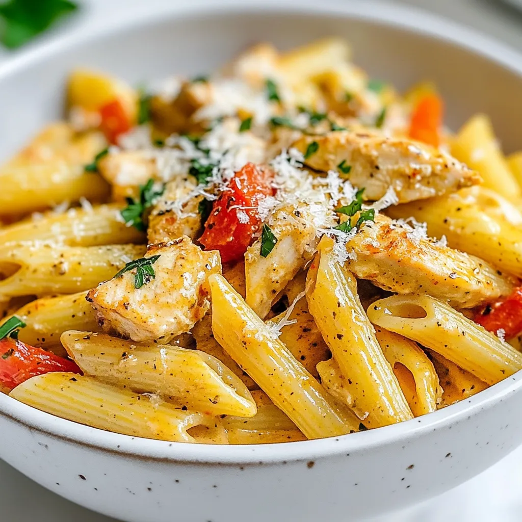 - 12 oz penne pasta - 1 lb chicken breast, diced - 1 tablespoon Cajun seasoning - 2 tablespoons olive oil - 1 medium onion, chopped - 3 cloves garlic, minced - 1 red bell pepper, diced - 1 cup heavy cream - 1 cup chicken broth - ½ cup grated Parmesan cheese - Salt and pepper to taste - 2 tablespoons fresh parsley, chopped To create the perfect Creamy Cajun Chicken Penne, you start with these key items. First, penne pasta is your base. It holds the sauce well and provides a great bite. The chicken breast gives protein and texture. You will also need Cajun seasoning for that spicy kick. Next, olive oil is essential for cooking. It helps to brown the chicken and sauté the veggies. Onion and garlic add depth of flavor. The red bell pepper brings sweetness and color to the dish. For the sauce, heavy cream is crucial. It creates that rich, creamy texture. Chicken broth adds depth and flavor. Grated Parmesan cheese makes everything cheesy and delicious. Finally, a touch of salt and pepper brings all the flavors together. Garnish with fresh parsley for a bright finish. Gather these ingredients, and you're on your way to a delightful dinner! {{ingredient_image_1}} To cook penne pasta to al dente, bring a large pot of salted water to a boil. Once boiling, add the penne. Cook it according to the package instructions, usually around 10-12 minutes. You want it firm, not mushy. After cooking, drain the pasta in a colander. Set it aside while you prepare the other ingredients. Start by seasoning the chicken breast. Use one tablespoon of Cajun seasoning, salt, and pepper. Mix it well to coat all sides of the chicken. In a large skillet, heat two tablespoons of olive oil over medium heat. Once hot, add the seasoned chicken. Cook it for about 5-7 minutes until browned and cooked through. Remove the chicken from the skillet and set it aside on a plate. In the same skillet, add the chopped onion, minced garlic, and diced red bell pepper. Sauté the vegetables for about 3-5 minutes. You want them soft and fragrant. Next, pour in one cup of heavy cream and one cup of chicken broth. Stir to combine everything. Bring the mixture to a gentle simmer, letting it heat up. Now it’s time to add all the good stuff! Add the cooked penne pasta back into the skillet. Then, add the cooked chicken and half a cup of grated Parmesan cheese. Toss everything together until the cheese melts and coats the pasta evenly. Taste your dish and adjust the seasonings with more salt and pepper if needed. To finish, remove the skillet from the heat. Stir in two tablespoons of chopped parsley for a nice touch of freshness. For serving, use bowls and garnish with more parsley and a sprinkle of Parmesan cheese on top. This adds a lovely look and extra flavor to your dish! To make your creamy Cajun chicken penne truly rich, use heavy cream. This cream adds a velvety texture and depth of flavor. If you want a lighter version, you can swap it with half-and-half or a mix of Greek yogurt and milk. Both options will still give you a nice creaminess without the full fat. Cajun seasoning can pack a punch. If you want it milder, use less seasoning at first. You can always add more later. For a spicier kick, add cayenne pepper or extra Cajun seasoning. Just sprinkle a little at a time until you reach your desired heat. When making the sauce, I prefer a skillet over a pot. A skillet allows for better heat distribution and helps the sauce thicken nicely. For sautéing vegetables, make sure to cut them evenly. This ensures they cook at the same speed. Start with medium heat, and don’t rush the process. This way, you get sweet, soft veggies that enhance your dish. Pro Tips Tip Title: Use Fresh Ingredients: For the best flavor, use fresh garlic and herbs. Fresh ingredients enhance the taste of your dish significantly. Tip Title: Adjust the Heat: If you prefer more heat, feel free to add extra Cajun seasoning or a pinch of red pepper flakes to the sauce. Tip Title: Perfectly Cooked Chicken: Ensure your chicken is cut into uniform pieces for even cooking. This helps avoid undercooked or overcooked pieces. Tip Title: Creaminess Factor: If you want an extra creamy sauce, consider adding a bit more heavy cream or a splash of cream cheese to the mixture. {{image_2}} You can switch the chicken for shrimp or sausage. Shrimp cooks fast and gives a lovely taste. Sausage adds a nice spice, too. If you want a plant-based option, try using vegetables like chickpeas or lentils. They add texture and a protein boost. If you need gluten-free options, use gluten-free penne pasta. Many brands taste great and cook well. For a vegan twist, swap heavy cream for coconut milk or cashew cream. You can still enjoy a rich flavor without dairy. Want to make it even better? Add veggies like spinach or mushrooms. They boost nutrition and flavor. You can also mix in different cheeses, such as mozzarella or cheddar. Each cheese gives a unique taste to your dish. To store leftovers, let the creamy Cajun chicken penne cool down first. Place it in an airtight container. You can use glass or plastic containers with tight lids. This helps keep the flavors fresh and prevents spills. If you want to freeze this dish, use a freezer-safe container. Make sure to leave some space at the top for expansion. It’s best to freeze it in single servings for easy meal prep later. When you’re ready to eat, thaw it in the fridge overnight. Reheat on the stove over low heat. Add a splash of chicken broth or cream to help restore the creamy texture. You can keep leftovers in the fridge for about 3-4 days. If frozen, they can last for about 2-3 months. Watch for signs that the dish has gone bad. If you see mold or if it smells off, it’s best to throw it away. Always trust your senses when it comes to food safety. Cajun seasoning blends many spices. Here are the common spices used: - Paprika - Garlic powder - Onion powder - Black pepper - Oregano - Thyme - Cayenne pepper These spices give Cajun dishe