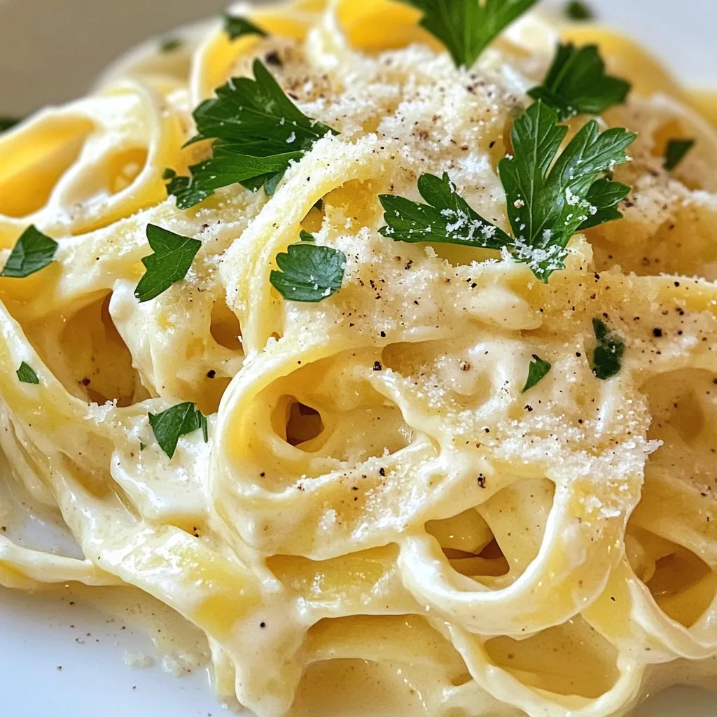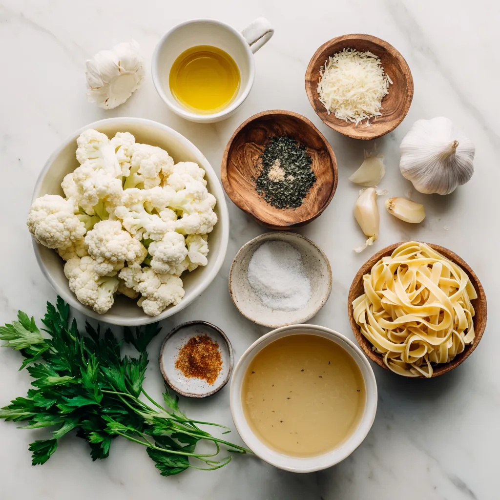 - 1 medium head of cauliflower - 3 cups vegetable broth - 8 ounces of pasta (fettuccine or linguine) - 3 cloves garlic - 1 teaspoon onion powder - 1 teaspoon garlic powder - 1 teaspoon nutritional yeast (optional) - Fresh parsley or basil - Grated Parmesan cheese or vegan cheese Gather these simple ingredients to create a delicious creamy cauliflower Alfredo pasta. The main star is the cauliflower, which gives the sauce a rich and smooth texture. The vegetable broth adds depth, while the pasta serves as the perfect base. The flavor enhancers, especially the garlic and onion powder, boost the taste. You can also add nutritional yeast for a cheesy flavor without dairy. For a finishing touch, fresh herbs like parsley or basil brighten the dish. If you want, sprinkle some grated cheese on top for extra flavor. This dish is easy to customize based on your taste and dietary needs. Whether you go vegan or keep it classic, this creamy cauliflower Alfredo pasta is a delightful meal that everyone will love. {{ingredient_image_1}} - Bring vegetable broth to a boil. - Cook cauliflower florets until tender. Start by boiling three cups of vegetable broth in a large pot. This broth adds great flavor to our dish. Once boiling, add the chopped cauliflower florets. Cook them for about 8 to 10 minutes. You want them soft enough to blend well. After cooking, use a slotted spoon to take out the florets. Set the broth aside for later use. - Blend cooked cauliflower with other ingredients. - Adjust consistency with reserved broth. Next, place the cooked cauliflower into a blender. Add in the almond milk, olive oil, minced garlic, nutritional yeast (if using), onion powder, garlic powder, salt, and pepper. Blend everything until it is smooth and creamy. If the sauce is too thick, pour in a bit of the reserved broth. Blend again until you reach your desired creaminess. - Boil pasta according to package instructions. - Combine creamy sauce and pasta in one pot. Now, cook your pasta. Follow the package instructions for best results. Once the pasta is done, drain it and set it aside. In the same pot you used for the pasta, add the creamy cauliflower sauce. Heat it on low and stir in the pasta. Mix well until the pasta is fully coated in the sauce. Taste the dish and adjust the seasoning if needed. You can add more salt, pepper, or garlic powder as you like. Enjoy your creamy cauliflower Alfredo pasta! To make a creamy sauce, blend the cooked cauliflower until it is smooth. This will help you get a rich texture. If you want to add flavor without extra calories, use nutritional yeast. It gives a cheesy taste without the fat. You can also add spices like onion and garlic powder for depth. When cooking pasta, always follow the package instructions. Different types of pasta may take different times to cook. A good tip is to check for "al dente," which means it should be firm but not hard. Timing is key. Cook the pasta just before your sauce is ready. This way, you can combine them while both are hot. For garnishing, fresh herbs like parsley or basil add color and flavor. You can also use grated Parmesan cheese on top. This makes your dish look appealing and adds extra taste. Serve the pasta in a large bowl or on individual plates for a nice touch. A sprinkle of black pepper can elevate the look too! Pro Tips Use Fresh Cauliflower: Fresh cauliflower will yield the best flavor and texture for your Alfredo sauce. Look for firm, white florets without any brown spots. Adjust Consistency: If you prefer a thicker sauce, use less vegetable broth when blending. For a thinner sauce, add more broth gradually until desired consistency is reached. Flavor Boost: Adding a pinch of nutmeg can enhance the creaminess of the sauce and give it a warm, comforting flavor that complements the cauliflower beautifully. Garnish Wisely: Fresh herbs like parsley or basil not only add color but also a burst of freshness. Consider adding toasted pine nuts for an additional crunch and flavor contrast. {{image_2}} To make this creamy cauliflower Alfredo pasta vegan, swap out the dairy. Use unsweetened almond milk, oat milk, or soy milk instead of regular milk. For cheese, use nutritional yeast. It adds a cheesy flavor without dairy. If you want a cheesy texture, try vegan cheese. Look for brands with a good melting quality. For a strict plant-based diet, ensure all ingredients are free from animal products. Check that vegetable broth is vegan. You can also add nutritional yeast to boost the dish's flavor profile. This makes it rich and tasty without any dairy. You can easily change the flavor of your dish. Add herbs like basil, thyme, or oregano to give it a fresh taste. Fresh herbs add a pop of color and flavor. If you want a spicy twist, add a pinch of red pepper flakes. For mix-ins, consider adding sautéed spinach, mushrooms, or peas. These veggies add color, nutrients, and texture. You can also include proteins like grilled chicken or chickpeas. This will make your dish more filling and satisfying. If you need gluten-free options, choose gluten-free pasta. Look for brands made from rice, quinoa, or chickpeas. These alternatives cook well and still taste great. You can also try shirataki noodles. They are low in carbs and calories. For a low-carb option, zucchini noodles work well. Use a spiralizer to make them. They add a fresh crunch to your dish. Just remember to sauté them briefly to soften. This keeps them from being too watery when mixed with the sauce. To keep your creamy cauliflower Alfredo pasta fresh, use airtight containers. Glass or high-quality plastic containers work great. Make sure the pasta cools down before sealing. Store it in the fridge for up to three days. This helps keep the flavors intact and safe to eat. When reheating, avoid the microwave if possible. Instead, use a saucepan. Heat it on low to keep the creamy texture. If the sauce seems thick, add a splash of almond milk or broth. This will help bring back its smoothness