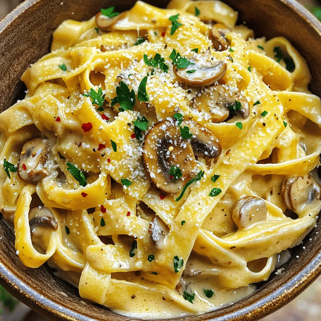 ![- 300g fettuccine or spaghetti - 250g fresh mushrooms (cremini and shiitake recommended) - 4 cloves garlic, minced - 1 cup heavy cream - 1/2 cup grated Parmesan cheese - 2 tablespoons olive oil - 1 tablespoon unsalted butter - Salt and pepper to taste - Fresh parsley (for garnish) - Red pepper flakes (optional) When you gather ingredients for creamy garlic mushroom pasta, focus on quality. Fresh mushrooms bring a rich, earthy flavor. I suggest cremini and shiitake for their unique tastes. The garlic adds a lovely kick, making each bite special. The heavy cream and Parmesan create a smooth, rich sauce. Olive oil and butter help sauté the mushrooms perfectly. You can adjust the seasonings to fit your taste. Fresh parsley adds a pop of color and freshness. If you like heat, sprinkle red pepper flakes on top. Each ingredient plays a role in making this dish creamy and delicious. For the full recipe, check out the earlier section. To start, fill a large pot with water. Bring it to a boil over high heat. Once boiling, add a good pinch of salt. This step is key, as it flavors the pasta. Add 300g of fettuccine or spaghetti to the boiling water. Cook it according to the package instructions until it is al dente. This usually takes about 8-10 minutes. Al dente means the pasta is firm but cooked. Drain the pasta and save 1/2 cup of the pasta water. Set the pasta aside for later. Next, grab a large skillet and heat it over medium heat. Add 2 tablespoons of olive oil and 1 tablespoon of unsalted butter. Wait for the butter to melt and foam. Add 250g of fresh sliced mushrooms. I like to use cremini and shiitake for the best flavor. Sauté the mushrooms for about 5-7 minutes. You want them to turn golden brown and release their moisture. Stir them often to prevent burning. Now, add 4 cloves of minced garlic to the skillet. Cook for about 1 minute, just until it smells great. Be careful not to burn the garlic; it can turn bitter. Pour in 1 cup of heavy cream and bring it to a gentle simmer. Stir well to combine. Then, mix in 1/2 cup of grated Parmesan cheese. Keep stirring until the cheese melts and the sauce is creamy. If your sauce is too thick, add some of that reserved pasta water to adjust it. Once the sauce is ready, combine the cooked pasta with the cream sauce. Toss it well to coat the pasta evenly. Season with salt and pepper to taste. If you love a kick, sprinkle in some red pepper flakes. This recipe is simple yet full of flavor! Check out the Full Recipe for a complete guide. To make creamy garlic mushroom pasta really shine, you can add a few simple seasonings. Try a pinch of thyme or oregano for a fresh taste. Fresh basil can also add a nice touch. Fresh ingredients are key to great flavor. Use fresh mushrooms and herbs whenever possible. They bring brightness and depth to your dish. One common mistake is burning the garlic. Garlic cooks quickly, so watch it closely. After adding the minced garlic, stir it for just one minute. This will keep the garlic sweet and fragrant. Also, the sauce should be creamy but not too thick. If it is too thick, use the reserved pasta water to adjust the consistency. This will help keep the sauce smooth and light. For side dishes, a simple green salad pairs well. You can also serve garlic bread for a great crunch. If you want to enjoy wine with your meal, a light white wine works best. When presenting your dish, use a large bowl. Top it with more grated Parmesan and a sprinkle of fresh parsley. This will give your pasta a restaurant-style look that impresses everyone! {{image_2}} For a tasty vegetarian twist, you can swap heavy cream for plant-based options. Use coconut cream or cashew cream for a rich taste. These alternatives bring a creamy mouthfeel that works well in this dish. When it comes to mushrooms, you have many choices. Try using portobello or oyster mushrooms for different flavors. Each type adds a unique touch to your creamy garlic mushroom pasta. If you want a vegan dish, you can still enjoy this pasta. For non-dairy cream substitutes, consider using almond milk blended with a bit of cornstarch. This mix creates a creamy texture without dairy. For cheese alternatives, try nutritional yeast. It gives a cheesy flavor without using any animal products. You can sprinkle it on top for added taste. To make this dish gluten-free, choose gluten-free pasta varieties. Look for options made from rice or chickpeas. They cook nicely and hold the sauce well. Maintaining flavor without gluten is easy. Use fresh herbs and spices to boost taste. You can also add some lemon juice for brightness. This way, your creamy garlic mushroom pasta stays delicious and satisfying. For the full recipe, check out the [Full Recipe]. To keep your creamy garlic mushroom pasta fresh, store it in an airtight container. Place it in the fridge within two hours of cooking. This way, it stays safe to eat. It lasts up to three days in the fridge. If you want to enjoy it later, consider freezing it. When reheating, use a skillet over low heat. This method helps maintain the pasta's texture. Stir gently as you heat it. If the sauce looks too thick, add a splash of water or cream. This keeps it creamy and smooth. Avoid microwaving if possible, as it can cause the sauce to separate. To freeze your creamy garlic mushroom pasta, let it cool down first. Then, portion it into freezer-safe bags. Squeeze out the air before sealing. It can stay frozen for up to three months. When you're ready to eat, move it to the fridge overnight to thaw. Reheat in a skillet as mentioned above for the best results. You can use a few alternatives to heavy cream. Try using whole milk or a mix of milk and flour. You can also use Greek yogurt or silken tofu for a rich texture. Each option gives a different taste, so pick what you like best. Yes, you can use dried mushrooms. First, soak them in warm water for about 20-30 minutes. This will help them become soft. After soaking, chop them and add them to your dish