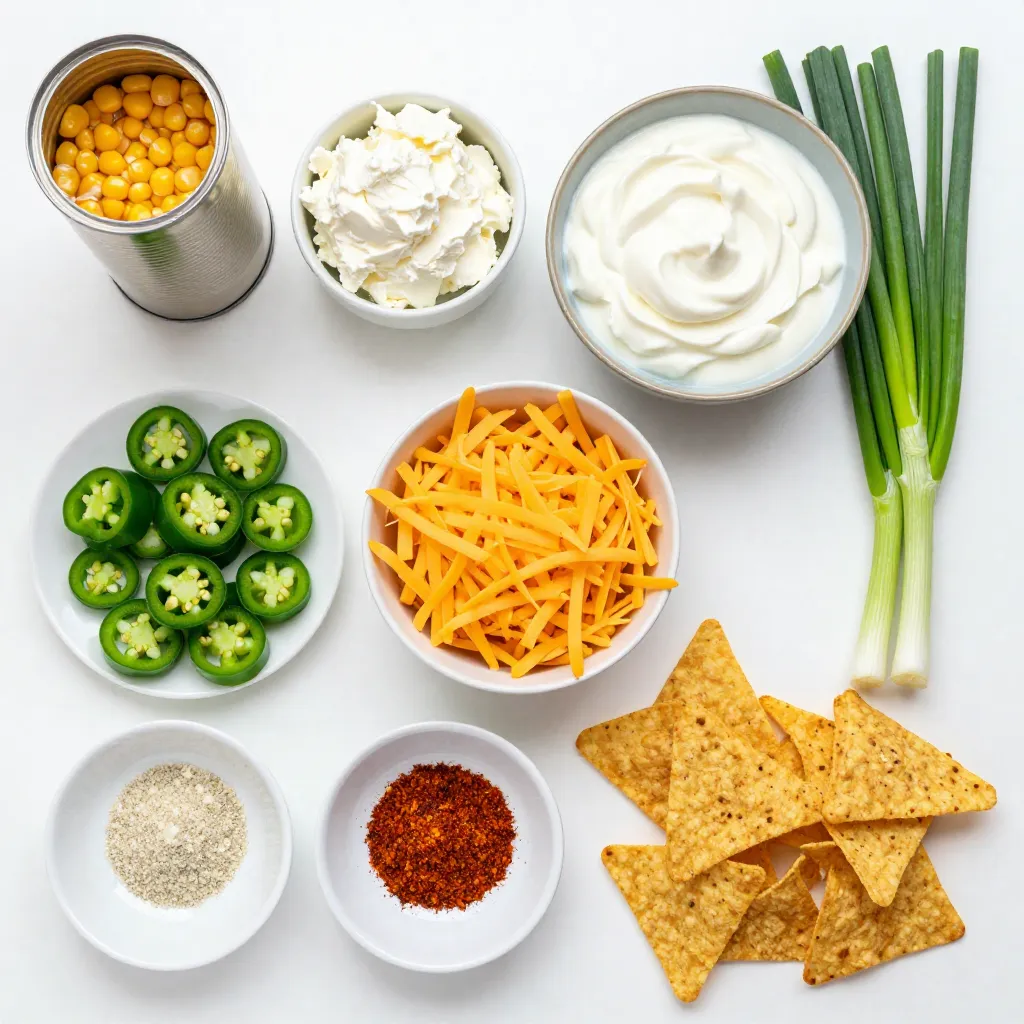 To make creamy jalapeño corn dip, you will need the following ingredients: - 1 can (15 oz) sweet corn, drained - 1 cup cream cheese, softened - 1 cup Greek yogurt - 1 cup shredded cheddar cheese - 2 jalapeños, finely chopped (remove seeds for less heat) - 1/4 cup green onions, sliced - 1 tsp garlic powder - 1 tsp onion powder - 1 tsp smoked paprika - Salt and pepper to taste - Tortilla chips for serving You can customize this dip. Try adding black beans or diced bell peppers for extra flavor. If you like more heat, keep some jalapeño seeds in. For a lighter dip, use reduced-fat cream cheese or yogurt. {{ingredient_image_1}} 1. Mix Cream Cheese and Yogurt: Start by placing the softened cream cheese and Greek yogurt in a large bowl. Use a hand mixer or a fork to blend them. You want a smooth and creamy mix. This step is key for a rich texture. 2. Add Cheese: Next, stir in the shredded cheddar cheese. Make sure to mix well. This adds a nice cheesy flavor to the dip. 3. Fold in Corn and Jalapeños: After that, add the drained sweet corn, chopped jalapeños, and sliced green onions. Use a spatula to gently fold these in. This helps keep the corn intact. 4. Season the Mixture: Now, sprinkle in the garlic powder, onion powder, smoked paprika, salt, and pepper. Stir everything together until well mixed. Tasting at this stage helps you adjust the seasonings. 5. Chill the Dip: Transfer the dip into a serving bowl. Cover it and refrigerate for at least 30 minutes. This time allows the flavors to meld together, making the dip taste even better. 6. Final Stir and Serve: Before serving, give it a good stir. Taste and adjust seasonings if needed. Serve chilled or at room temperature with tortilla chips for dipping. - Mixing Tips: To achieve the right texture, ensure the cream cheese is well softened. This makes it easier to blend with the yogurt. Use a hand mixer for the smoothest result. - Chilling Importance: Refrigerating the dip is crucial. It allows the flavors to blend and intensify. Plus, it gives the dip a thicker texture, making it more enjoyable with chips. To get your cream cheese soft, take it out of the fridge. Let it sit at room temperature for about 30 minutes. This helps it blend well with the Greek yogurt. If you’re short on time, cut the cream cheese into small cubes. Then, microwave it for about 10 seconds. Check if it’s soft enough and mix until smooth. For a lighter dip, you can use more Greek yogurt. This makes the dip creamy without being too heavy. Start with one cup of yogurt and adjust it to your taste. You can even replace some cream cheese with yogurt for a tangy twist. Herbs and spices can take your dip to the next level. Fresh cilantro or parsley adds a nice touch. You can also try adding a pinch of cumin for a warm flavor. If you like it spicy, sprinkle in some cayenne pepper or add more jalapeños. Balancing the heat from jalapeños is key. If your dip is too spicy, add more cream cheese or yogurt. This will help tone down the heat. For a milder flavor, remove the seeds and ribs from the jalapeños. You can also mix in sweet bell peppers for extra crunch without the heat. Pro Tips Chill for Best Flavor: Allowing the dip to chill in the refrigerator for at least 30 minutes helps all the flavors to meld together, resulting in a tastier dip. Adjust the Heat: For a milder dip, make sure to remove the seeds from the jalapeños. If you love spice, consider adding a dash of hot sauce or using spicier peppers. Customize Your Cheese: Feel free to mix different types of cheese, such as pepper jack or mozzarella, to give the dip a unique flavor profile. Serve with Variety: While tortilla chips are a classic pairing, consider serving the dip with fresh vegetables, pita chips, or even crackers for a fun twist. {{image_2}} You can easily make this dip dairy-free or vegan. Use cashew cream instead of cream cheese. Swap Greek yogurt with coconut yogurt for a tasty twist. If you want to add more texture, mix in black beans. They add protein and fiber. You can also throw in chopped bell peppers for sweetness and color. These small changes keep the dip fresh and fun. Get creative with how you serve this dip. Instead of tortilla chips, try sliced veggies like carrots or cucumbers. These add crunch and freshness. You could also use pita chips for a unique flavor. Want a heartier dish? Turn the dip into a main course. Spread it on a tortilla, add grilled chicken, and roll it up. This makes a great wrap for lunch or dinner. After enjoying your creamy jalapeño corn dip, store leftovers in an airtight container. This keeps the dip fresh and tasty. You can place it in the fridge for up to five days. If you notice it getting dry, stir in a little yogurt or cream cheese to restore its creaminess. Yes, you can freeze creamy jalapeño corn dip! This dip freezes well if you pack it in a freezer-safe container. It can last for about two months in the freezer. To thaw, move the dip to the fridge overnight. When you're ready to eat, reheat it gently in a microwave or on the stove. Stir it well to get the right texture back. Enjoy it with fresh tortilla chips for a quick snack! What can I serve with Creamy Jalapeño Corn Dip? You can serve this dip with tortilla chips for a crunchy bite. Fresh veggies like carrots or bell peppers work well too. You might also enjoy it with pita chips or crackers. This dip pairs great with grilled meats as a side. Can I make this dip ahead of time? Yes, you can make this dip ahead of time. Just prepare it and store it in the fridge. Make sure to cover it well. The flavors blend better after a few hours. It's perfect for parties or game days! What to do if the dip is too salty or spicy? If the dip is too salty, add more cream cheese or yogurt. This helps balance the salt. If it is too spicy, add more corn or yogurt. Both will cool down the heat from the jalapeños. How to adjust consistency if the dip is too thick or thin? If the dip is too thick, stir in a little m