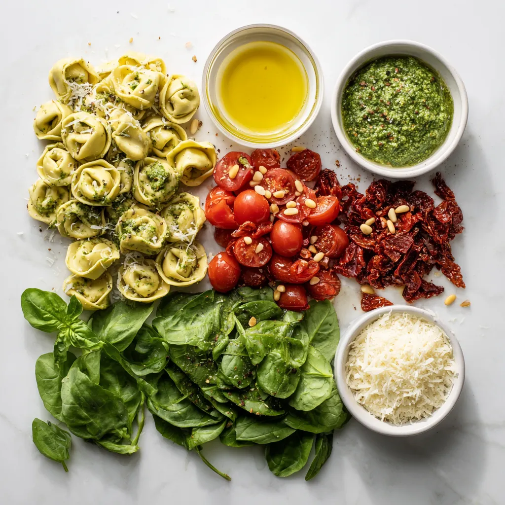 - In a large mixing bowl, combine the cooked tortellini, cherry tomatoes, fresh spinach, sun-dried tomatoes, and torn basil leaves.