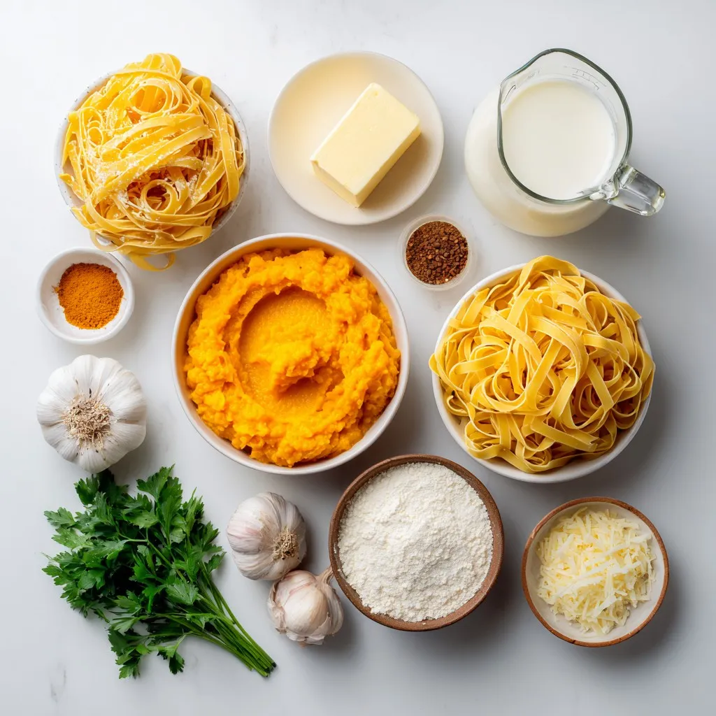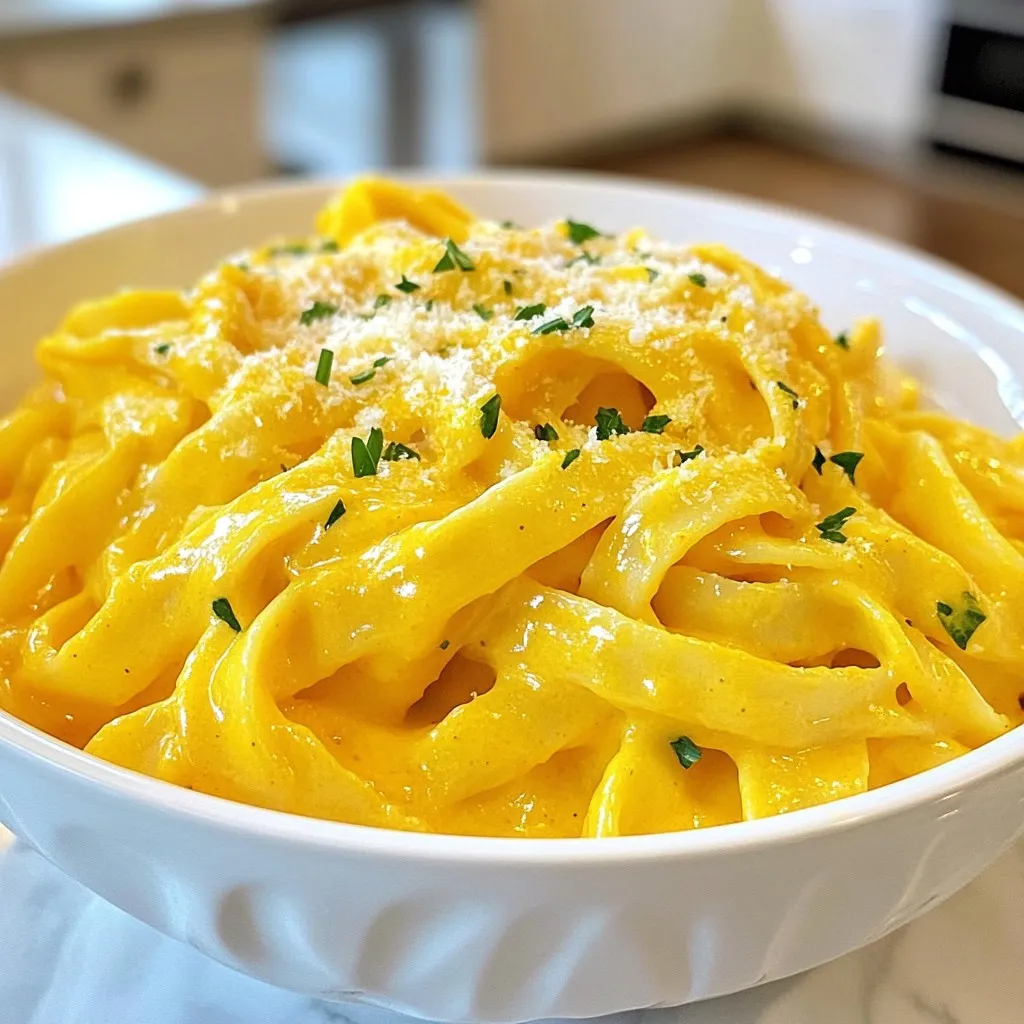 - Fettuccine pasta: You will need 12 ounces of fettuccine pasta. This type of pasta works well because it holds the creamy sauce nicely. - Pumpkin puree: Use 1 cup of pumpkin puree. You can choose canned or homemade. Canned pumpkin is easy and quick. Homemade gives a fresh taste. - Heavy cream: One cup of heavy cream adds richness. It makes the sauce creamy and smooth. - Spices: Nutmeg and cinnamon are key. They add warmth and depth to the sauce. Use 1/2 teaspoon of each for a balanced flavor. - Parsley: Fresh parsley adds color and freshness. Chop it up and sprinkle it on top before serving. - Salt and pepper: These enhance all the flavors. Add salt and pepper to taste for the best results. {{ingredient_image_1}} Start by bringing a large pot of salted water to a boil. The salt adds flavor to the pasta. For this recipe, you will cook 12 ounces of fettuccine pasta. Follow the package instructions for cooking time, usually around 8 to 10 minutes. You want the pasta to be al dente, which means it should be firm when you bite into it. Al dente pasta holds its shape and texture better when mixed with the sauce. In a large skillet, melt 1/4 cup of unsalted butter over medium heat. Once the butter melts, add 2 cloves of minced garlic and sauté for about 1 minute. You want the garlic to be fragrant but not browned. Next, stir in 1 cup of pumpkin puree and 1 cup of heavy cream. Mix until the sauce is smooth and well combined. Then, add 1/2 cup of grated Parmesan cheese, 1/2 teaspoon of nutmeg, 1/2 teaspoon of cinnamon, and salt and pepper to taste. Stir continuously until the cheese melts and the sauce becomes creamy. Once the pasta is cooked and drained, toss it in the pumpkin Alfredo sauce. Make sure the pasta is well coated. If the sauce seems too thick, add a splash of reserved pasta water. This helps adjust the sauce's consistency. Serve your Creamy Pumpkin Alfredo Pasta hot, garnished with chopped fresh parsley and an extra sprinkle of Parmesan if you like. Enjoy the warm, comforting flavors! To stop your sauce from curdling, use low heat. High heat may cause the cream to separate. Stir gently and keep an eye on the temperature. When adding cheese, make sure it’s grated. This helps it melt easily. Add it slowly while stirring. This makes a smooth sauce without lumps. You can spice up your dish by adding more flavors. Try a pinch of chili flakes for heat or fresh herbs like thyme. Each spice adds a new twist. If you want to add protein, chicken or shrimp work great. Cook them separately and toss them in at the end. This makes the dish heartier. To prepare in advance, you can cook the pasta and sauce separately. Mix them just before serving. This keeps the pasta from getting soggy. For storing leftovers, put the pasta in an airtight container. When reheating, add a splash of cream or water. This keeps it creamy and tasty. Pro Tips Use Fresh Nutmeg: For an extra layer of flavor, grate fresh nutmeg instead of using pre-ground. It enhances the aroma and taste of the sauce. Add Protein: Consider adding cooked chicken, shrimp, or sausage for a heartier meal. Simply toss it into the pasta before serving. Adjust Creaminess: If you prefer a lighter sauce, substitute half of the heavy cream with vegetable or chicken broth for a delicious variation. Garnish with Toasted Nuts: Sprinkle toasted pine nuts or walnuts on top for a delightful crunch and added flavor contrast. {{image_2}} You can make this dish vegan by using plant-based cream and cheese. Coconut cream works well for a rich taste. Nutritional yeast can replace Parmesan cheese for that cheesy flavor. You can also opt for gluten-free pasta. Look for brands that use rice or lentils. These options keep everyone happy and included. Want to add nutrition? Toss in some fresh spinach or kale. These greens blend well and boost vitamins. You can also switch cheese types. Try goat cheese or feta for a tangy twist. Each cheese brings its own unique flavor, making the dish more exciting. Fall flavors shine when you add sage or thyme. These herbs enhance the pumpkin taste and warm the dish. You can also pair this pasta with roasted veggies. Think sweet potatoes or Brussels sprouts. They add texture and flavor, making the meal more satisfying. To store leftover Creamy Pumpkin Alfredo Pasta, place it in a container. Make sure it is airtight. You can use glass or plastic containers. They keep the pasta fresh longer. Let the pasta cool before sealing to avoid moisture buildup. Leftover pasta lasts about three to four days in the fridge. Yes, you can freeze this dish! To freeze, place the pasta in a freezer-safe container. Leave space at the top for expansion. For best results, freeze it within two days of cooking. When ready to eat, thaw it overnight in the fridge. Reheat gently on the stovetop for the best flavor and texture. The best way to reheat pasta is on the stovetop. Use medium heat and add a splash of cream or water. This helps restore the creaminess. You can also use a microwave, but be careful. Heat it in short bursts and stir often. This avoids uneven heating and keeps the pasta creamy. Yes, you can substitute heavy cream with several options. Here are some ideas: - Half-and-half: It makes a lighter sauce but still adds creaminess. - Coconut cream: This gives a rich flavor, but it will taste a bit different. - Cashew cream: Blend soaked cashews with water for a vegan option. Each option changes the taste and texture a little. Experiment to find what you like best! Creamy Pumpkin Alfredo Pasta lasts about 3 to 5 days in the fridge. - Signs of spoilage: Look for changes in color, texture, or smell. If it smells sour or looks off, throw it away. Store it in an airtight container to keep it fresh longer! This pasta pairs well with several dishes. Here are some great ideas: - Grilled chicken: The flavors balance nicely. - Roasted vegetables: They add color and nutrients. - A side salad: Fresh greens can brighten the meal. Feel free to mix and match 