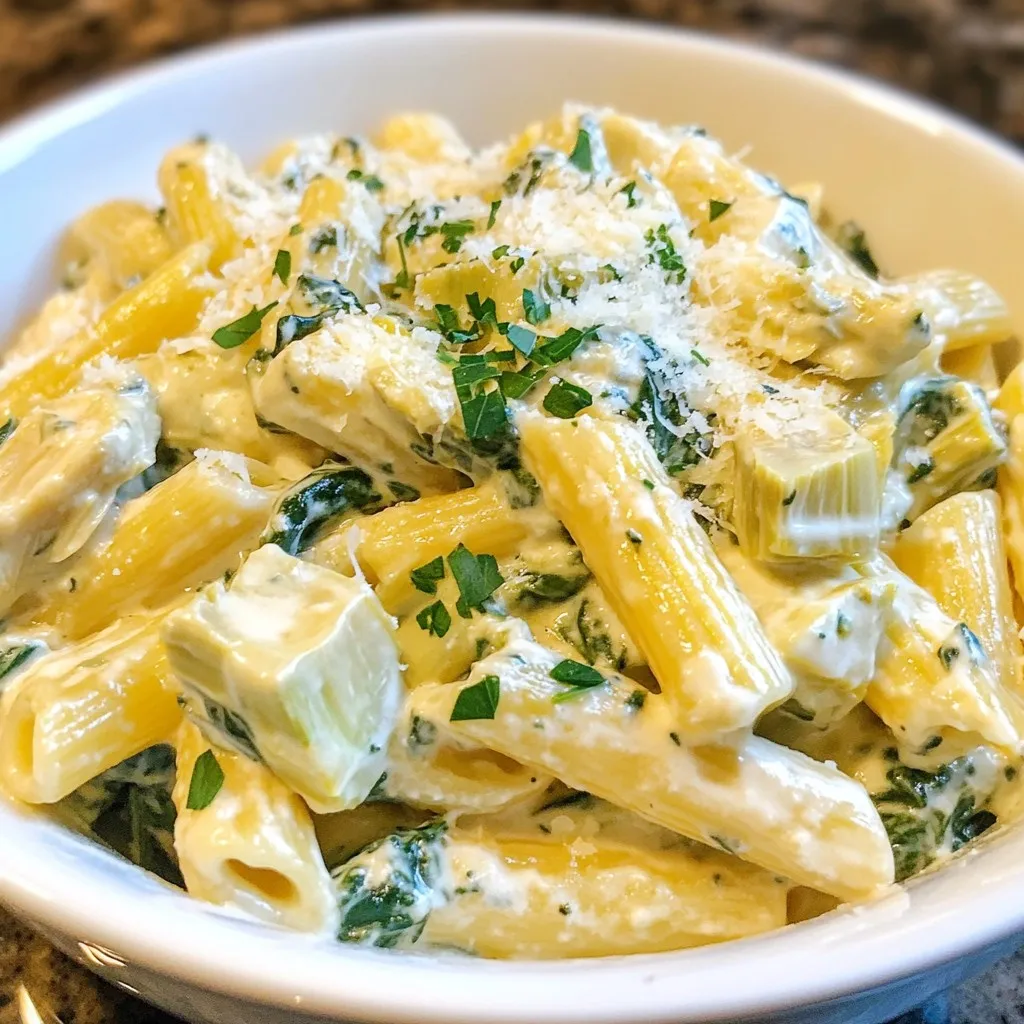 - 8 oz penne pasta - 1 cup fresh spinach, chopped - 1 can (14 oz) artichoke hearts, drained and chopped - 1 cup cream cheese, softened - 1 cup heavy cream - 1 cup grated Parmesan cheese - 2 cloves garlic, minced - 1 teaspoon onion powder - 1 teaspoon garlic powder - Salt and pepper to taste - 2 tablespoons olive oil - Fresh parsley, chopped for garnish You can switch out penne for any pasta you like. Fusilli or farfalle work great too. If you want a lighter dish, use Greek yogurt instead of cream cheese. For a dairy-free option, try cashew cream. You can also replace the heavy cream with coconut milk. If you don't have artichokes, feel free to leave them out, or use frozen ones. This dish is rich and filling. Each serving has about 550 calories. You get a good mix of carbs, fats, and proteins. The pasta gives you energy. Spinach adds fiber and vitamins. Artichokes provide antioxidants, which are great for health. If you want fewer calories, you can cut back on cream or cheese. Just keep in mind, this may change the flavor and texture. {{ingredient_image_1}} Start by boiling water in a large pot. Add salt to the water for flavor. Once it boils, add 8 oz of penne pasta. Cook it according to the package instructions until al dente. This usually takes about 8 to 10 minutes. After the pasta is cooked, drain it and save 1 cup of pasta water. Set the pasta aside until you need it. In a big skillet, heat 2 tablespoons of olive oil over medium heat. Add 2 cloves of minced garlic and sautΓ© for about 1 minute. You want the garlic to be fragrant but not brown. Next, add 1 cup of softened cream cheese to the skillet. Stir it until it melts and becomes creamy. Slowly pour in 1 cup of heavy cream while stirring. Keep mixing until the sauce is smooth and creamy. Now, add 1 cup of chopped fresh spinach and 1 can of drained, chopped artichoke hearts to the sauce. Sprinkle in 1 teaspoon of onion powder and 1 teaspoon of garlic powder. Season with salt and pepper to taste. Cook this mixture for about 3 to 4 minutes. You want the spinach to wilt and blend with the sauce. Now it's time to bring everything together. Toss the cooked penne pasta into the skillet with the creamy sauce. Mix well so that the pasta is coated with the sauce. If the sauce is too thick, add some of the reserved pasta water a little at a time. Keep mixing until you reach your desired sauce consistency. Finally, stir in 1 cup of grated Parmesan cheese until it melts into the dish. Taste the pasta and adjust the seasoning with more salt and pepper if needed. To cook pasta just right, start with a big pot. Fill it with salted water and bring it to a boil. Add the penne pasta and cook it until it's al dente, which means it should be firm but not hard. This usually takes about 8-10 minutes. Make sure to stir the pasta a few times to prevent it from sticking. When it's done, drain it well but save about a cup of that starchy pasta water. This water helps bind the sauce later. For a smooth and creamy sauce, use softened cream cheese. Start by heating olive oil in a large skillet. When it's warm, add the minced garlic and sautΓ© it for about one minute. Then, add the cream cheese. Stir it until it melts and blends well. Slowly pour in heavy cream, mixing it until the sauce is smooth. The key is to keep stirring to avoid lumps. This method gives you that rich, creamy texture we all love. Taste your sauce as you cook. After adding spinach and artichokes, check the flavor. You can add more salt or pepper if needed. If the sauce is too thick, use the reserved pasta water a little at a time. This helps to thin it out to your preferred consistency. Adding grated Parmesan cheese at the end enhances the flavor, making it even more delicious. Remember, cooking is about finding your perfect taste! Pro Tips Use Fresh Ingredients: Fresh spinach and high-quality artichoke hearts will enhance the flavor and texture of your pasta dish. Reserve Pasta Water: Always reserve some pasta water, as it helps adjust the sauce consistency and adds flavor. Experiment with Cheese: Feel free to mix different cheeses like mozzarella or Gouda for a unique taste. Make it a Meal: Add grilled chicken or shrimp for a protein boost, making this pasta a complete meal. {{image_2}} You can make this dish vegetarian by skipping the cream cheese and heavy cream. Use cashew cream or coconut cream instead. These alternatives give a rich, creamy taste. You can also add more veggies, like bell peppers or mushrooms, to enhance the flavor. Fresh herbs like basil or cilantro can add a nice twist. For those who love protein, chicken or shrimp works great in this dish. Cook the chicken or shrimp in the skillet before adding garlic. This method infuses the sauce with extra flavor. You can also use grilled chicken for a smoky taste. If you want a heartier meal, try adding cooked sausage or bacon bits. If you need a gluten-free meal, choose gluten-free penne pasta. Many brands offer tasty pasta made from rice or lentils. Follow the same steps in the recipe to keep the flavor intact. You can also check the labels on cream cheese and heavy cream for gluten-free options. Enjoy a creamy dish without worry! To keep your creamy spinach artichoke pasta fresh, store it in an airtight container. Make sure it cools down to room temperature first. Place it in the fridge within two hours of cooking. This dish will stay good for up to three days. If you want to reheat it later, it will still taste great! When you are ready to enjoy your leftovers, reheat the pasta on the stove. Add a splash of water or cream to help revive the sauce. Heat it on low and stir often to avoid burning. You can also use the microwave. Place it in a microwave-safe bowl, cover it with a lid, and heat in short bursts. Stir in between to ensure even warming. If you want to save some pasta for later, freezing is an option. First, let it cool completely. Then, divide it into portions and place each in a freezer-safe bag or containe