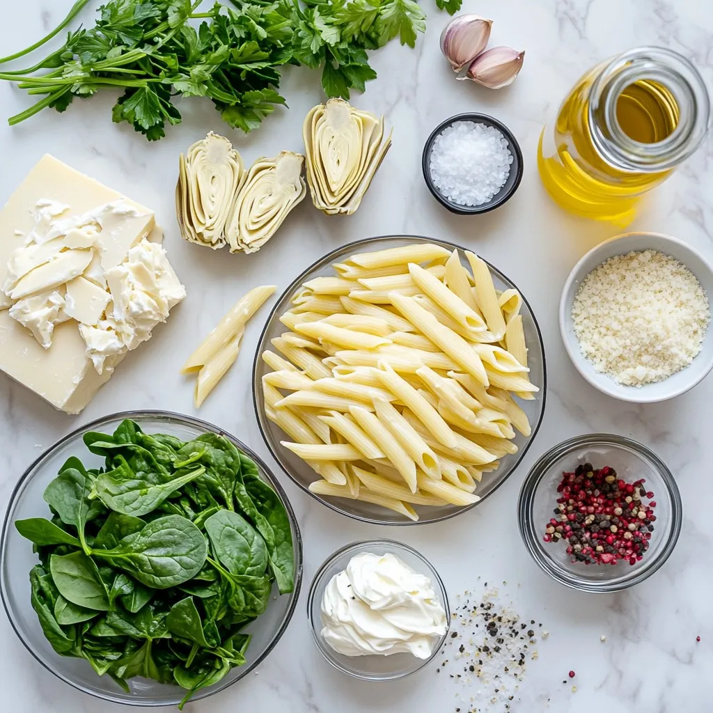 A delicious and creamy pasta dish featuring spinach and artichokes.