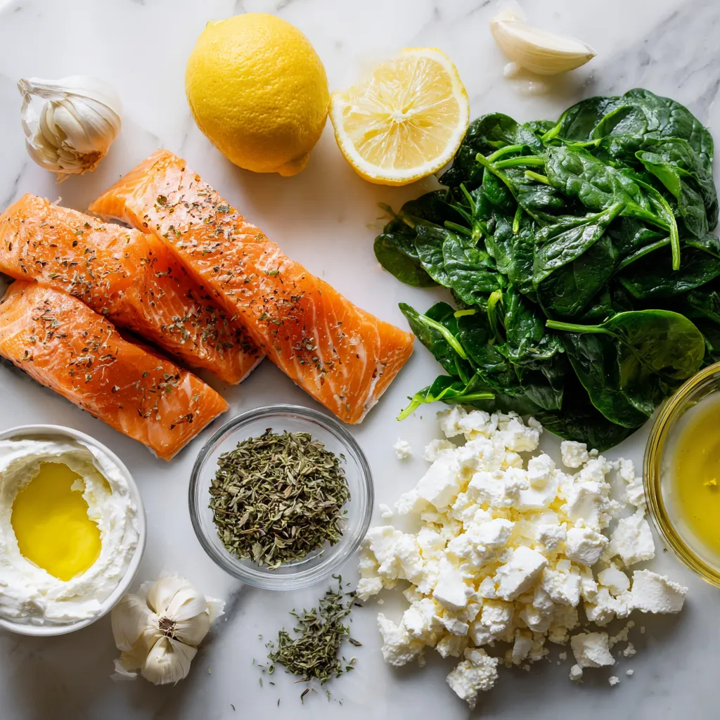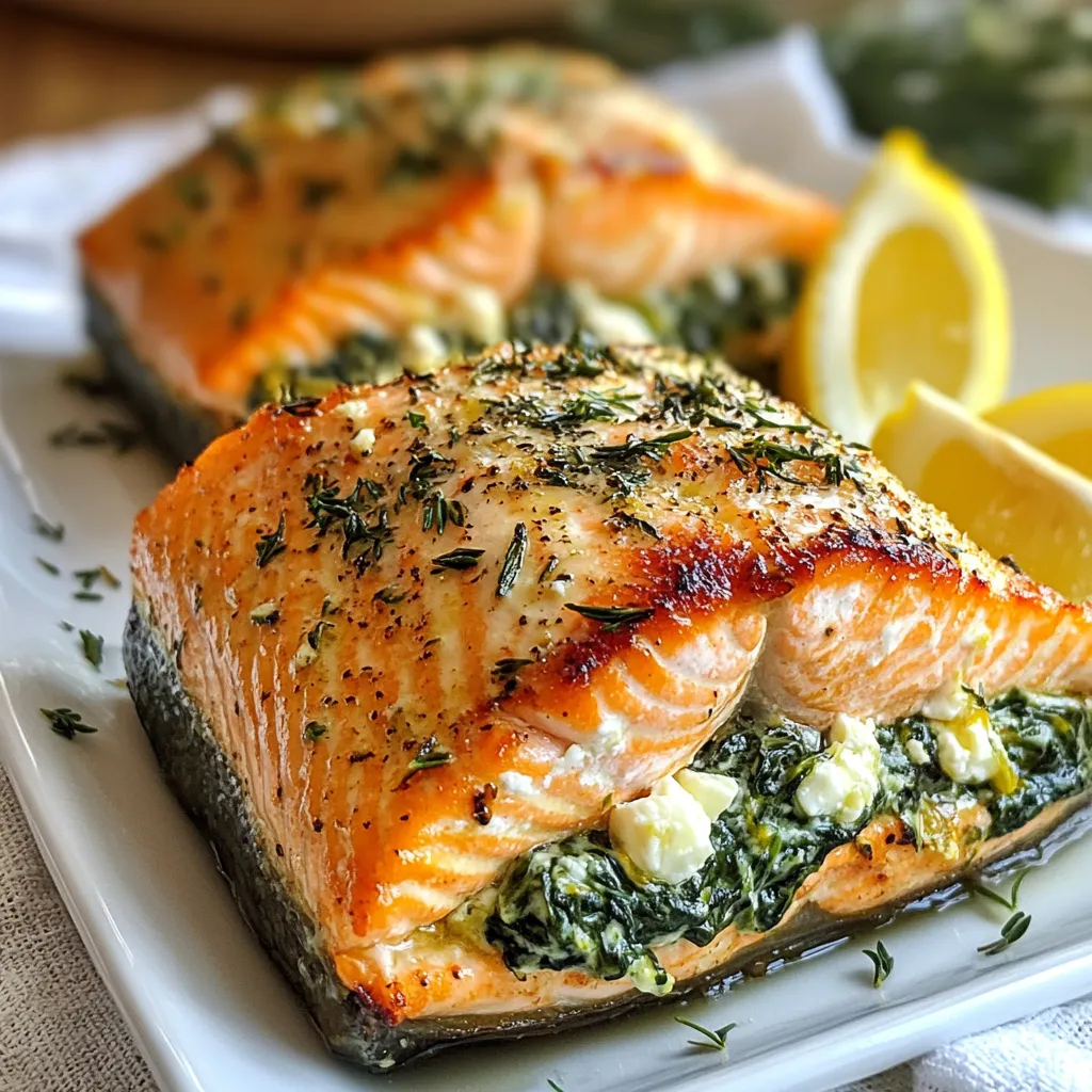 To make creamy spinach feta stuffed salmon, you need the following items: - 4 salmon fillets (skinless) - 1 cup fresh spinach, chopped - 1/2 cup feta cheese, crumbled - 1/4 cup cream cheese, softened - 2 cloves garlic, minced - 1 tablespoon lemon juice - 1 tablespoon olive oil - Salt and pepper to taste - 1 teaspoon dried oregano - Lemon wedges, for serving (optional) For the best flavor, use fresh spinach and quality feta cheese. You can swap cream cheese with ricotta if you prefer. Make sure your salmon is fresh, as it makes a big difference. Always check the skinless fillets for any bones before cooking. This helps in keeping your meal pleasant. Feel free to adjust the salt and pepper based on your taste. If you like a bit of heat, consider adding a pinch of red pepper flakes. {{ingredient_image_1}} How to prepare the spinach and feta stuffing Start by mixing the filling. In a bowl, combine 1 cup of chopped spinach, 1/2 cup of crumbled feta cheese, and 1/4 cup of softened cream cheese. Add 2 minced garlic cloves, 1 tablespoon of lemon juice, salt, pepper, and 1 teaspoon of dried oregano. Stir until everything is well mixed. This stuffing brings a creamy and tangy flavor to the salmon. Tips for cutting pockets in the salmon fillets Next, take your salmon fillets and lay them flat. Use a sharp knife to carefully cut a pocket. Slice horizontally along the side of each fillet. Make sure not to cut all the way through. You want to create a nice space for the stuffing. Guidelines for filling the salmon pockets Now it's time to fill the salmon. Grab your spinach and feta mixture. Spoon about 2-3 tablespoons into each pocket. Press gently to secure the filling inside. Be careful not to overstuff, as this can make it hard to cook evenly. Searing the salmon: Techniques and timing Heat 1 tablespoon of olive oil in an oven-safe skillet over medium heat. Once the oil is hot, place the stuffed salmon fillets in the skillet. Sear each side for about 2-3 minutes until they are golden brown. This step adds a nice crust and flavor to the salmon. Baking the salmon: Oven settings and duration After searing, transfer the skillet to a preheated oven set at 375°F (190°C). Bake the salmon for 12-15 minutes. This helps cook the salmon through without drying it out. Indicators that the salmon is perfectly cooked Check if the salmon is done by inserting a fork into the thickest part. It should flake easily when fully cooked. The inside should be opaque and not translucent. This means your salmon is ready to enjoy! To ensure even cooking, start with salmon fillets of similar size. This helps them cook at the same rate. Sear the salmon for a golden crust before baking. This step adds flavor and texture. For extra zest, add a pinch of red pepper flakes to the stuffing. This little kick can wake up the dish. Use a sharp knife for cutting pockets. This makes filling easier and keeps the fillet intact. Serve the stuffed salmon on a white plate for contrast. It makes the colors pop. Garnish with fresh lemon wedges and a sprinkle of parsley or dill. This adds a fresh touch and eye appeal. Pair the dish with steamed asparagus or a light salad. These sides complement the rich flavors of the salmon. You can also serve it with wild rice or quinoa for a hearty meal. Pro Tips Choose Fresh Ingredients: Fresh spinach and high-quality feta cheese will elevate the flavor of your stuffed salmon. Don’t Overstuff the Salmon: Stuff each fillet with just the right amount of filling to avoid spilling during cooking. Check for Doneness: Salmon is perfectly cooked when it flakes easily with a fork and has an internal temperature of 145°F (63°C). Rest Before Serving: Allow the salmon to rest for a couple of minutes after baking to let the juices redistribute for optimal flavor. {{image_2}} You can change the greens in the stuffing. Try kale or Swiss chard instead of spinach. Both add nice flavor and nutrients. If you want a different cheese, use goat cheese or ricotta. Each cheese gives a unique taste. For dietary needs, make it dairy-free. Substitute cream cheese with cashew cream. This keeps it creamy and tasty. You can grill or bake the salmon. Grilling adds a smoky flavor. Baking keeps the salmon moist and tender. If you choose to grill, make sure your salmon is thick enough. For air frying, preheat your air fryer to 400°F (200°C). Cook the salmon for about 8-10 minutes. Check for doneness; it should flake easily. If using an Instant Pot, place the salmon on a trivet. Add one cup of water to the pot. Cook on high for 5-6 minutes. This method keeps the salmon juicy and flavorful. To keep your leftover stuffed salmon fresh, follow these simple steps: - Cool it down: Allow the salmon to cool to room temperature. - Use airtight containers: Store the salmon in airtight containers. Glass or plastic works well. - Refrigerate: Place the containers in the fridge. Leftover salmon stays good for up to 3 days. - Freezing instructions: If you want to keep it longer, freeze the salmon. Wrap it tightly in plastic wrap, then foil. It can last for up to 3 months in the freezer. When it's time to enjoy your leftovers, remember these tips: - Keep it moist: Reheat the salmon gently. This helps avoid drying it out. - Microwave: Use a microwave-safe dish. Cover it with a damp paper towel. Heat in short bursts of 30 seconds until warm. - Oven reheating: Preheat your oven to 350°F (175°C). Place the salmon in an oven-safe dish, cover with foil, and heat for about 10-15 minutes. - Restore freshness: Add a splash of lemon juice or a bit of olive oil before reheating. This helps bring back some moisture and flavor. You should use skinless salmon fillets. They cook evenly and let the filling shine. Salmon like sockeye or Atlantic work well. Their flavor pairs nicely with the creamy filling. Yes, you can make the stuffing a day before. Store it in the fridge until you are ready to use it. This saves time and helps the flavors blend. The salmon is done 