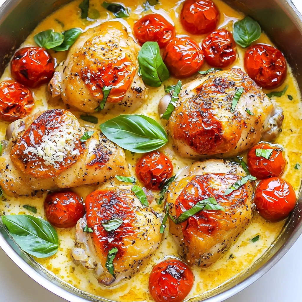 • Return the chicken thighs to the skillet, spooning the creamy tomato sauce over them. Allow to simmer for another 2-3 minutes to heat the chicken through.