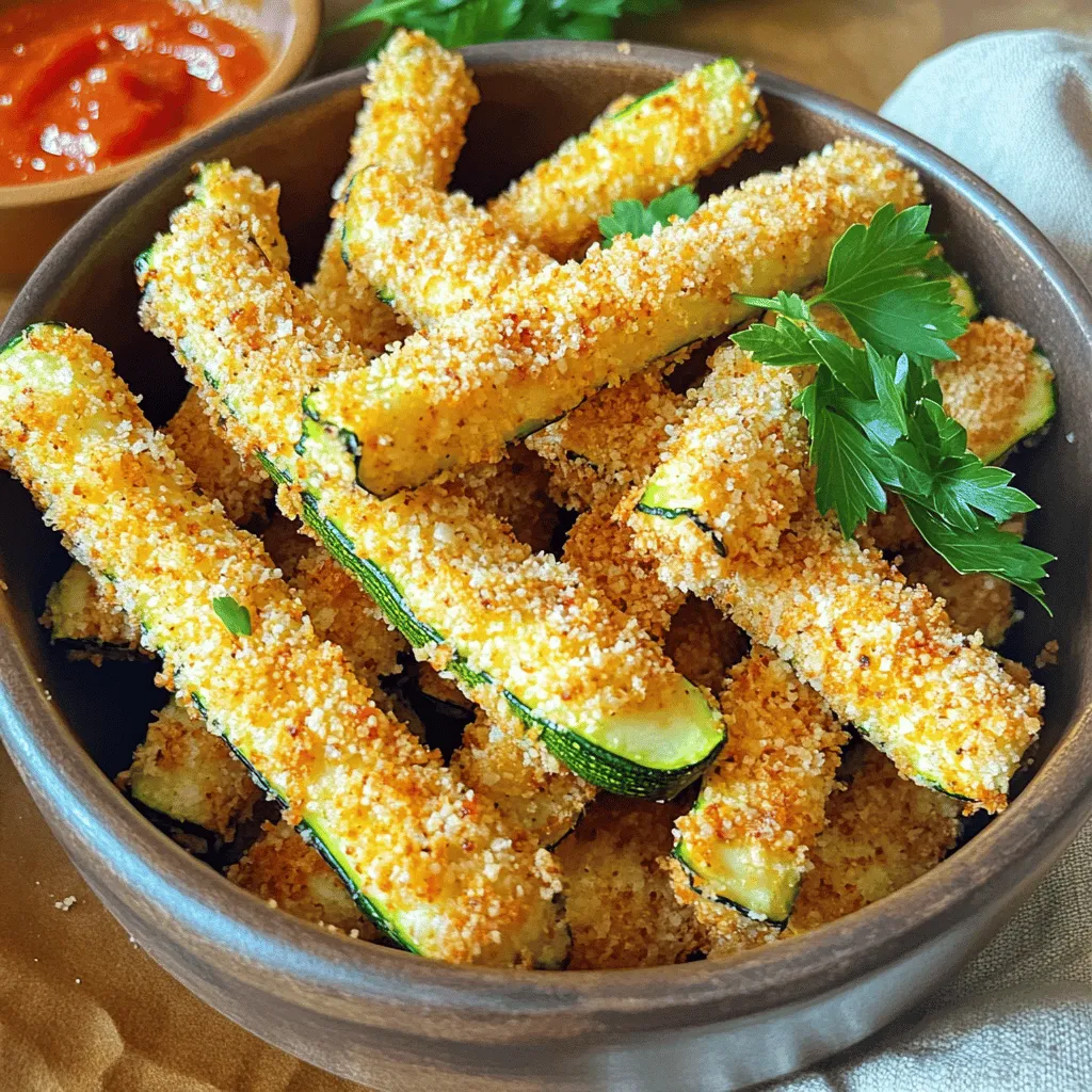 ![To make crispy air fryer zucchini fries, gather these simple ingredients: - 2 medium zucchinis, cut into fries - 1 cup whole wheat bread crumbs - 1/2 cup grated Parmesan cheese - 1 teaspoon garlic powder - 1 teaspoon onion powder - 1/2 teaspoon smoked paprika - 1/2 teaspoon salt - 1/4 teaspoon black pepper - 2 large eggs, beaten - Olive oil spray Using fresh zucchinis makes a big difference. They should feel firm and heavy. Fresh zucchinis have better taste and texture. Whole wheat bread crumbs add a nice crunch. They also boost fiber content. Always choose high-quality Parmesan cheese. It adds flavor and richness to the fries. Spices should be fresh, too. Old spices lose flavor and aroma. Good ingredients lead to a better dish. If you are gluten-free, use gluten-free bread crumbs. They work well and keep the fries crispy. For a dairy-free option, try nutritional yeast instead of Parmesan. It gives a cheesy flavor without dairy. If you want a vegan recipe, skip the eggs. Use a mixture of ground flaxseed and water instead. This will help the crumbs stick to the zucchini. These swaps keep the dish tasty for everyone! To start, grab two medium zucchinis. Wash them well to remove any dirt. Cut each zucchini into fries, aiming for 1/4-inch thick pieces. This helps them cook evenly. Try to make them as uniform as possible. Uniform sizes mean they will fry at the same rate. Lay the fries on a towel to absorb extra moisture. This step ensures they become crispy later. Next, prepare your breading. In a shallow bowl, mix the whole wheat bread crumbs, grated Parmesan cheese, garlic powder, onion powder, smoked paprika, salt, and black pepper. Stir well so all the spices mix together. In another bowl, beat the two large eggs until well mixed. Now, take each zucchini fry and dip it in the beaten egg. Let any extra egg drip off. Then, coat the fry in the breadcrumb mixture. Press gently to make sure the crumbs stick well. Now it’s time for air frying! Preheat your air fryer to 400°F (200°C). This should take about 3 to 5 minutes. While it preheats, lightly spray the air fryer basket with olive oil spray. Arrange the zucchini fries in a single layer in the basket. Make sure not to overcrowd them; they need space to cook. Lightly spray the tops of the fries with more olive oil. Air fry for 10 to 12 minutes. Shake the basket halfway through to ensure even cooking. The fries should turn golden brown and crispy. Once done, carefully remove them and let them cool for a moment before you dig in. For extra flavor, serve with marinara sauce or garlic aioli. Enjoy your crispy air fryer zucchini fries! Check the [Full Recipe] for more details. To make your zucchini fries super crispy, follow these tips: - Use fresh zucchini: Fresh zucchini holds less water. This helps keep your fries crisp. - Cut evenly: Make sure all fries are the same size. This ensures they cook at the same rate. - Dry the zucchini: After cutting, pat the fries with a paper towel to remove moisture. - Coat well: Press the zucchini into the breadcrumb mix. This helps the coating stick better. Preheating your air fryer is key for crispiness. Here are the steps: - Set the right temperature: Always preheat to 400°F (200°C). - Time it right: Preheat for 3-5 minutes. This gets the air fryer hot before you add food. - Use olive oil spray: Lightly spray the basket before adding fries. This helps them crisp up. Avoid these mistakes for the best results: - Overcrowding the basket: Lay fries in a single layer. Too many fries can lead to steaming, not crisping. - Skipping the spray: Forgetting to spray olive oil can result in soggy fries. - Not shaking the basket: Shaking halfway through helps fries cook evenly. By following these tips and tricks, your crispy air fryer zucchini fries will turn out perfect every time. Check the Full Recipe for all the details! {{image_2}} You can boost the flavor of your zucchini fries easily. Try adding spices like cayenne pepper for heat. Or mix in Italian herbs like oregano and basil for a fresh taste. You can also use a blend of cumin and coriander for a warm, earthy flavor. Just sprinkle these spices into the bread crumb mix before coating the zucchini. If you want to switch up the cheese, there are great options. You can use nutritional yeast for a cheesy flavor without dairy. Or try crumbled feta for a tangy twist. For a rich taste, opt for aged cheddar or smoked gouda. Each choice will give your fries a unique flavor while keeping them crispy. Making a vegan version of zucchini fries is simple. Instead of eggs, use flaxseed meal mixed with water. Use two tablespoons of flaxseed meal with six tablespoons of water. Let it sit for a few minutes until it thickens. You can also skip cheese or use a vegan cheese alternative. This way, you still get that crispy, tasty snack without any animal products. For the full recipe, check out the detailed steps above. To keep leftover zucchini fries fresh, place them in an airtight container. Make sure they cool down before sealing. Store them in the fridge for up to three days. This method helps maintain their texture and flavor. When you're ready to enjoy your leftover fries, use the air fryer for reheating. Set it to 350°F (175°C). Place the fries in the basket in a single layer. Heat them for about 5-7 minutes. This will help them regain their crunch. To freeze zucchini fries, first, let them cool completely. Arrange them in a single layer on a baking sheet. Freeze for 1-2 hours until solid. Once frozen, transfer them to a freezer bag. Label the bag and store them for up to three months. When you’re ready to eat, cook them straight from the freezer, adjusting the time as needed. For the full recipe, follow the steps outlined above. You can serve air fryer zucchini fries with many tasty dips. Marinara sauce is a classic choice. It adds a nice tangy flavor. You can also try garlic aioli for a creamy touch. Ranch dressing works well too, giving a cool contrast to the 