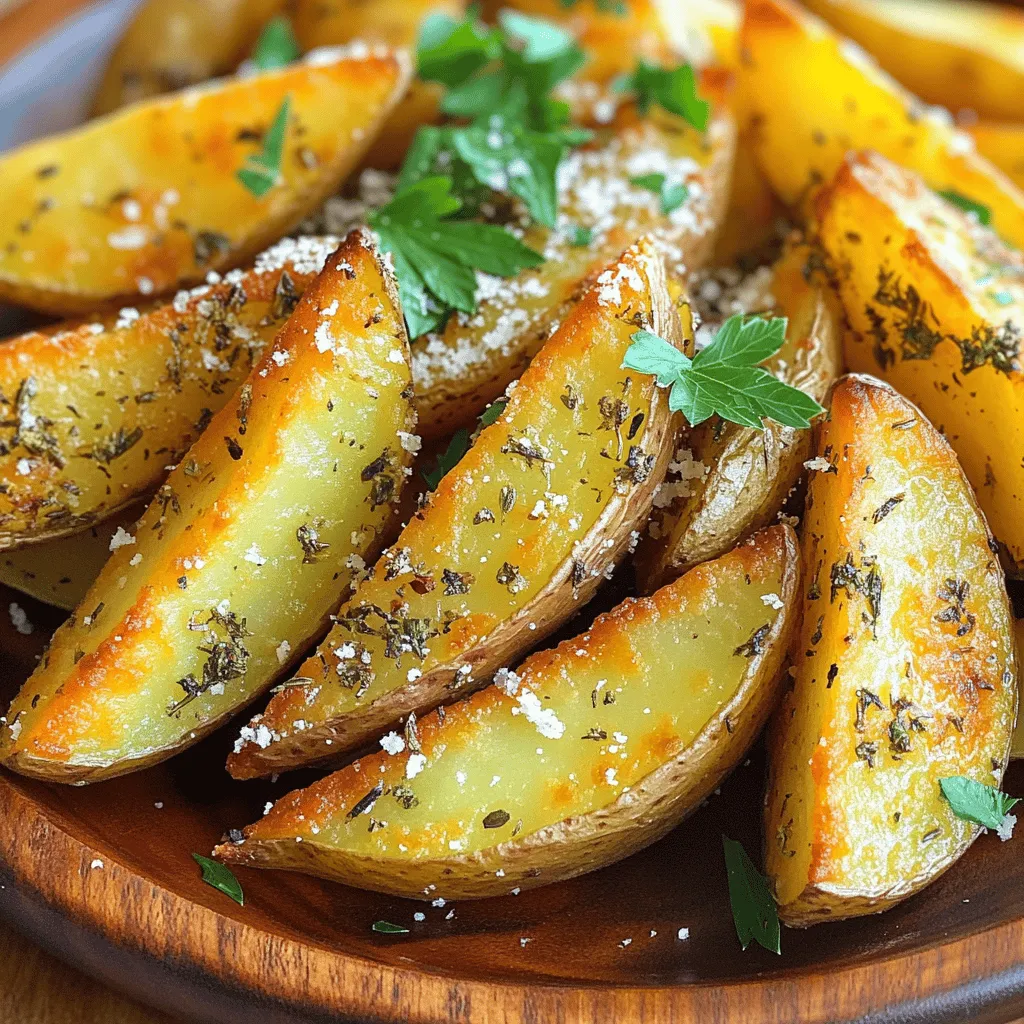 ![To make Crispy Garlic Herb Potato Wedges, you will need: - 4 large russet potatoes, scrubbed and cut into wedges - 4 tablespoons olive oil - 4 cloves garlic, minced - 2 teaspoons dried oregano - 2 teaspoons dried thyme - 1 teaspoon paprika - 1 teaspoon onion powder - Salt and pepper to taste - Fresh parsley, chopped (for garnish) - Grated Parmesan cheese (optional) If you prefer, you can swap russet potatoes for sweet potatoes. They add a nice sweetness. You can also use fresh herbs instead of dried ones if you have them on hand. To prepare these tasty potato wedges, you will need a few key tools: - A sharp knife for cutting the potatoes - A large mixing bowl for combining the oil and spices - A baking sheet lined with parchment paper for easy cleanup Using the right tools makes cooking easier and more fun. A sharp knife helps you cut the potatoes quickly and safely. Lining the baking sheet prevents sticking, and it keeps the wedges crispy. These small steps lead to great results. You can find the full recipe to follow along with each step. Happy cooking! Start by washing your russet potatoes well. Scrub them under cold water to remove dirt. Next, cut each potato into wedges. Aim for 8 wedges per potato for even cooking. Make sure they are similar in size. This helps them cook at the same time. Soaking the wedges in water for 30 minutes is a great tip. It removes extra starch, which helps make them crispier. In a big bowl, combine 4 tablespoons of olive oil with the spices. Use 4 cloves of minced garlic, 2 teaspoons of oregano, and 2 teaspoons of thyme. Add 1 teaspoon of paprika, 1 teaspoon of onion powder, salt, and pepper. Mix this well. This creates a tasty oil mixture. It’s vital to coat each wedge evenly. This ensures they all get crispy and flavorful. Preheat your oven to 425°F (220°C). Line a baking sheet with parchment paper to prevent sticking. Spread the potato wedges in a single layer on the sheet. Avoid crowding them; this helps them crisp up. Bake the wedges for 30 to 35 minutes. Flip them halfway to cook evenly. They are ready when they look golden brown and feel crispy. Enjoy them warm as a side or snack! For the full recipe, check out the section above. To make your potato wedges extra crispy, a few tricks can help. First, try parboiling the potato wedges before baking. Boil them for about 5-7 minutes, then drain and let them cool. This step helps to soften the inside while keeping the outside crunchy. Next, pay attention to the oil temperature. Make sure the oil is hot when you mix it with the spices. This helps create a golden crust. Spacing on the baking sheet is also key. Spread the wedges out in a single layer. If they touch, they can steam rather than crisp up. Give them room to breathe for the best results. Now, let’s talk about flavor! You can add more herbs or spices to suit your taste. Try adding rosemary or basil for a fresh twist. A pinch of cayenne pepper can spice things up if you like heat. Adjusting the seasoning is easy too. Taste the oil mixture before tossing the wedges. If you want more garlic, add another clove. Don’t hesitate to make it your own! If you follow these tips, your crispy garlic herb potato wedges will be a hit every time. For the complete recipe, check the [Full Recipe]. {{image_2}} You can change the flavor of your Crispy Garlic Herb Potato Wedges easily. For a spicy kick, add chili powder or cayenne pepper to the oil mixture. If you love cheese, sprinkle some grated cheese on top before baking. You can also use Italian seasoning for a classic taste. To explore different cuisines, think about using curry powder for an Indian twist or cumin and chili powder for a Mexican vibe. These blends add fun flavors that can match any meal. Using different types of potatoes can change your wedges' taste and feel. Russet potatoes are great for a crispy texture. They give a fluffy inside and a crunchy outside. If you try Yukon Gold potatoes, you’ll get a creamier texture. They have a buttery flavor, but they may not get as crispy. Sweet potatoes are another tasty choice. They add a nice sweetness and can be spiced up with cinnamon or paprika. When you pick your potato, think about the final dish. The right potato will make your wedges even better. For more details on the full recipe, check out the Full Recipe section. To keep your leftover potato wedges fresh, let them cool first. Then, place them in an airtight container. Store them in the fridge for up to three days. If you want to reheat them, use your oven. Preheat it to 400°F (200°C). Spread the wedges on a baking sheet. Heat for about 10-15 minutes. This method helps keep them crispy. If you want to save your potato wedges longer, freezing is a good option. First, let the wedges cool completely. Place them in a single layer on a baking sheet. Freeze them for about an hour. This helps them keep their shape. After that, transfer the frozen wedges to a freezer bag. They will last up to three months. To thaw, take the wedges out the night before and place them in the fridge. When you're ready to cook, bake them directly from frozen. Preheat your oven to 425°F (220°C). Bake for 25-30 minutes. This way, they will stay tasty and flavorful. For the full recipe, check out the recipe section. You can use several alternatives to olive oil. Some great options include: - Avocado oil - Coconut oil - Grapeseed oil - Sunflower oil These oils still provide flavor and help achieve that crispy texture. Each oil has its own taste, so choose one that you like. For a lighter option, you might use vegetable broth or a bit of apple cider vinegar, though it won’t give the same crispiness. Yes, you can make the wedges ahead of time. Here are some tips: - Cut the potatoes and soak them in water. This helps remove starch and keeps them from browning. - Toss the wedges in the seasoning mix but don’t bake them. Store them in an airtight container in the fridge for up to 24 hours. For reheating, you can p