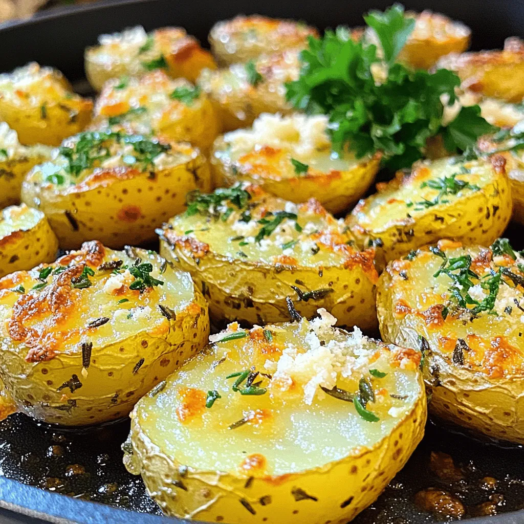 When making Crispy Garlic Parmesan Potatoes, you want to start with the right items. The baby potatoes give a nice texture. Olive oil helps them crisp up. Garlic adds a rich flavor, while rosemary and thyme bring a nice herbal touch. Parmesan cheese gives a salty kick that makes the dish special. Don’t forget salt and pepper for taste. Finally, fresh parsley brightens the dish and adds color.