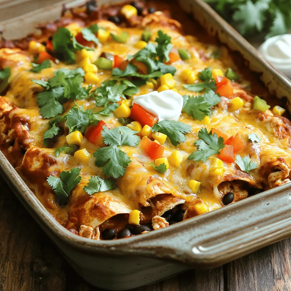 To make this dish, you need some key ingredients. Here’s what you will use: - 2 cups cooked chicken, shredded - 1 can (15 oz) enchilada sauce (red or green) - 1 cup black beans, drained and rinsed - 1 cup corn (frozen or fresh) - 1 cup diced bell peppers (any color) - 1 teaspoon cumin - 1 teaspoon chili powder - 2 cups shredded cheese (cheddar or a Mexican blend) - 8 small flour tortillas You can start with cooked chicken. I like to use rotisserie chicken. It saves time and tastes great. Cheese makes this dish creamy and rich. I suggest using cheddar or a Mexican blend. Both melt well and add flavor. If you want something different, try pepper jack for a kick! You can also mix cheeses for a tasty twist. Garnishes can make your meal pop. I love adding fresh cilantro on top. It adds a nice color and flavor. Sour cream is a great side too. It cools down the spice. You can also serve it with rice or chips for a full meal. Enjoy your Easy Chicken Enchilada Bake with these fun extras! For the full recipe, check out the instructions above. First, set your oven to 375°F (190°C). This step warms the oven for the enchilada bake. While it preheats, gather your ingredients. You need cooked chicken, enchilada sauce, black beans, corn, bell peppers, spices, tortillas, and cheese. Having everything ready makes cooking smooth. In a large bowl, mix the shredded chicken, black beans, corn, diced bell peppers, cumin, and chili powder. Add half of the enchilada sauce to the mix. Stir everything well so the flavors blend nicely. This filling is the heart of the dish. It brings all the tastes together. Grab a 9x13 inch baking dish. Spread a thin layer of the remaining enchilada sauce on the bottom. This helps prevent sticking. Next, lay four tortillas on top of the sauce. Take a scoop of the chicken mixture and place it in each tortilla. Roll them tightly and place them seam side down in the dish. Repeat this with the other tortillas until the filling is gone. Pour any leftover enchilada sauce over the top. Finally, sprinkle shredded cheese over everything. Cover the dish with aluminum foil. Bake it in the oven for 20 minutes. This step helps the filling heat up. After that, remove the foil and bake for another 10 minutes. Keep an eye on the cheese; it should be bubbly and slightly golden. Once finished, let it cool for a few minutes. Then slice it into squares, garnish with fresh cilantro, and serve with sour cream if you like. Enjoy your Easy Chicken Enchilada Bake! To keep your enchiladas crisp, layer them with care. Start with a thin layer of sauce on the bottom. This helps prevent sogginess. Use only enough sauce to moisten the tortillas. Avoid drenching them before baking. You can also bake uncovered for the last few minutes. This makes the top nice and crunchy. Using the right tools makes a big difference. A large mixing bowl helps you combine the filling well. Use a spatula to spread sauce and cheese evenly. Tongs are great for handling hot tortillas. A 9x13 inch baking dish is perfect for this recipe. It holds all your enchiladas snugly. Want to give your enchiladas a kick? Add jalapeños or diced green chiles to the filling. You can also mix in some chipotle powder for a smoky flavor. If you like fresh herbs, try adding chopped cilantro or parsley. A squeeze of lime juice before serving adds a zesty touch. For a creamy twist, top with sour cream or avocado. For the full recipe, check out the Easy Chicken Enchilada Bake section! {{image_2}} You can make this dish without chicken. Use beans, like black or pinto, for protein. Add veggies, such as zucchini, mushrooms, or spinach. These options give a fresh taste. They also make the dish colorful and fun. Mix in some extra spices to boost flavor. This way, everyone can enjoy the meal, even non-meat eaters. Want a healthier twist? Swap out the flour tortillas for corn tortillas. They are lower in calories and gluten-free. You can also use low-fat cheese or skip it entirely. Try using Greek yogurt instead of sour cream. It adds creaminess and protein without extra fat. Finally, consider adding more veggies. This will increase fiber and nutrients, making the dish even better for your health. To change the flavor, try different enchilada sauces. Green sauce adds a fresh, bright taste. A tomatillo sauce brings a tangy twist. You can also add salsa for a kick. For a smoky flavor, try chipotle sauce. Each sauce creates a new vibe for your meal. Mix it up and see what your family loves best! For the full recipe, check out the section above. After enjoying your Easy Chicken Enchilada Bake, save any leftovers to enjoy later. Let the dish cool down to room temperature. Then, cover it tightly with plastic wrap or foil. You can also use an airtight container for best results. Store the leftovers in the fridge. They will stay fresh for up to three days. To reheat your enchilada bake, preheat your oven to 350°F (175°C). Place the dish covered with foil in the oven. Heat for about 20 minutes. This helps keep the dish moist and tasty. If you prefer, you can microwave individual portions. Heat them for one to two minutes, checking frequently. Want to save your enchilada bake for later? You can freeze it! First, let it cool completely. Then, cut the dish into portions. Wrap each piece in plastic wrap, then in foil. Place them in a freezer-safe bag. Label the bag with the date. Your enchiladas will be good for up to three months in the freezer. When ready to eat, thaw them in the fridge overnight before reheating. For best taste, reheat in the oven. Enjoy your easy meal anytime! For the full recipe, check out the section above. Yes, you can make this dish ahead of time. Prepare the filling and assemble the enchiladas. Cover the baking dish with foil and store it in the fridge. When you’re ready to bake, just add a few more minutes to the cooking time. This makes dinner easy on busy nights. If you want a change, try using corn tortillas. You can also use lettuce wrap