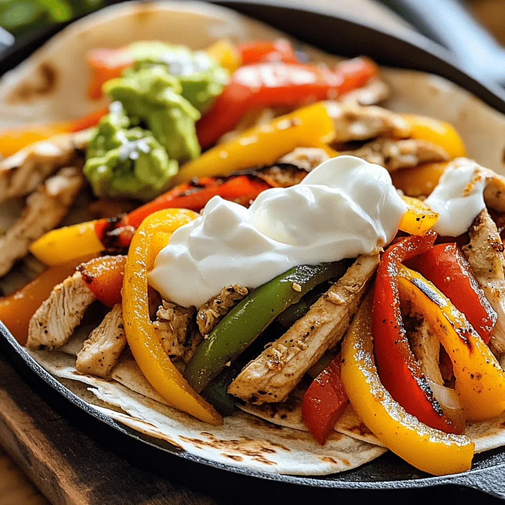 ![- 2 boneless, skinless chicken breasts, sliced into thin strips - 1 red bell pepper, sliced - 1 yellow bell pepper, sliced - 1 medium onion, sliced - 2 tablespoons olive oil - 1 tablespoon chili powder - 1 teaspoon cumin - 1 teaspoon smoked paprika - 1 teaspoon garlic powder - Salt and pepper to taste - Tortillas for serving (flour or corn) You need fresh chicken breasts for a juicy taste. Slice them thin for quick cooking. The bell peppers add color and crunch. I like using both red and yellow for a nice mix. Onions bring sweetness and flavor to the dish. Olive oil helps the spices stick to the chicken and makes it tender. - Sour cream - Guacamole - Salsa - Shredded cheese - Fresh herbs Toppings take your fajitas to the next level. Sour cream adds creaminess, while guacamole gives a rich taste. Salsa brings a fresh burst of flavor. Shredded cheese melts beautifully on warm fajitas. Fresh herbs like cilantro add a pop of color and taste. - Large skillet - Mixing bowl A large skillet is key. It gets hot and cooks the chicken and veggies fast. Use a mixing bowl to coat the chicken with spices. This step helps the flavors blend well. Make sure your skillet is hot before adding the chicken to get a nice sear. For the full recipe, check out the [Full Recipe]. Start by marinating the chicken strips. In a large bowl, mix the sliced chicken with olive oil, chili powder, cumin, smoked paprika, garlic powder, salt, and pepper. Toss the chicken well so it is fully coated with the spices. Let it sit for about 10 minutes. This helps the flavors soak in. Next, heat a large skillet over medium-high heat. When the skillet is hot, add the marinated chicken strips. Cook them for about 5-7 minutes. Stir occasionally until the chicken is browned and cooked through. Ensure the chicken reaches an internal temperature of 165°F for safety. Once the chicken is done, remove it from the skillet and set it aside. In the same skillet, add the sliced onions and bell peppers. Sauté them for about 4-5 minutes. You want them to be tender and slightly charred. This brings out their natural sweetness. After that, return the chicken to the skillet. Mix everything well and cook for an additional 2 minutes. This step ensures the chicken and veggies blend their flavors perfectly. Now, you're ready to serve! Warm the tortillas in a dry skillet or microwave, and fill them with your flavorful chicken and veggies. Don't forget to check the [Full Recipe] for more details! To get the best flavor in your chicken fajitas, use the right spices. A good mix includes: - 1 tablespoon chili powder - 1 teaspoon cumin - 1 teaspoon smoked paprika - 1 teaspoon garlic powder These spices give a warm and smoky taste. Fresh herbs like cilantro can add a bright touch. Dried herbs work, too, but fresh often tastes better. Aim for a mix of both to find your favorite flavor. You can cook your fajitas in a skillet or on a grill. A skillet gives you great control over the heat and cooking time. It takes about 5-7 minutes to cook the chicken and 4-5 minutes for the veggies. If you use a grill, the cooking time may vary. Keep an eye on your food to avoid burning. Chicken fajitas taste great with side dishes like rice, beans, or a fresh salad. You can also serve them with chips and salsa for a fun snack. If you have leftovers, try making fajita wraps or quesadillas. Just add some cheese, and grill until melted for a quick meal. Don't forget the toppings like sour cream or guacamole! {{image_2}} You can easily swap chicken for other proteins. Beef, shrimp, or even tofu work great. For beef, use flank or skirt steak. Cook it for 3-5 minutes longer than chicken. Shrimp cooks fast, just 2-3 minutes. Tofu needs about 5 minutes, so it's a good choice for a meat-free option. If you want a meat-free dish, try this. Use more vegetables like zucchini or mushrooms. You can also add black beans or chickpeas for protein. Adjust the seasonings to add more flavor. Use smoked paprika for a rich taste. You can still enjoy all the great flavors of fajitas without meat. Want to spice things up? Try a Southwestern twist. Add chipotle for heat or fresh cilantro for freshness. You can also add fruits like pineapple for a sweet touch. This gives your fajitas a fun flavor boost. Mix and match spices to create your unique blend. For the complete recipe, check out the Full Recipe above. To store leftover fajitas, place them in an airtight container. Make sure to let the fajitas cool down first. This keeps them fresh and safe to eat. Best practices for freshness include eating leftovers within three days. When reheating, add a splash of water to keep them moist. To freeze chicken fajitas, let them cool completely before packing. Use freezer-safe bags or containers for best results. Squeeze out any air to prevent freezer burn. For thawing, place them in the fridge overnight. Reheat them in a skillet over medium heat. Stir in a little water to help them heat evenly. Leftovers last in the fridge for about three days. If you freeze them, they can last up to three months. Signs of spoilage include a sour smell or discoloration. If you see mold, toss them out. Safe food practices keep everyone healthy! The best chicken for fajitas is boneless, skinless chicken breasts or thighs. Chicken breasts are lean and cook quickly. They have a mild flavor that works well with spices. Chicken thighs are juicier and richer in taste. They take a bit longer to cook but stay tender. Choosing between them depends on your taste preference. Yes, you can make fajitas ahead of time! To prep, season your chicken and veggies. You can store them in the fridge for up to two days. Cook the chicken and veggies just before serving. This keeps them fresh and tasty. If you have leftovers, store them in an airtight container. They will stay good for about three days. You can serve chicken fajitas with many tasty sides. Here are some ideas: - Mexican rice - Refried beans - Corn on the cob - Fresh salsa - Chips and 